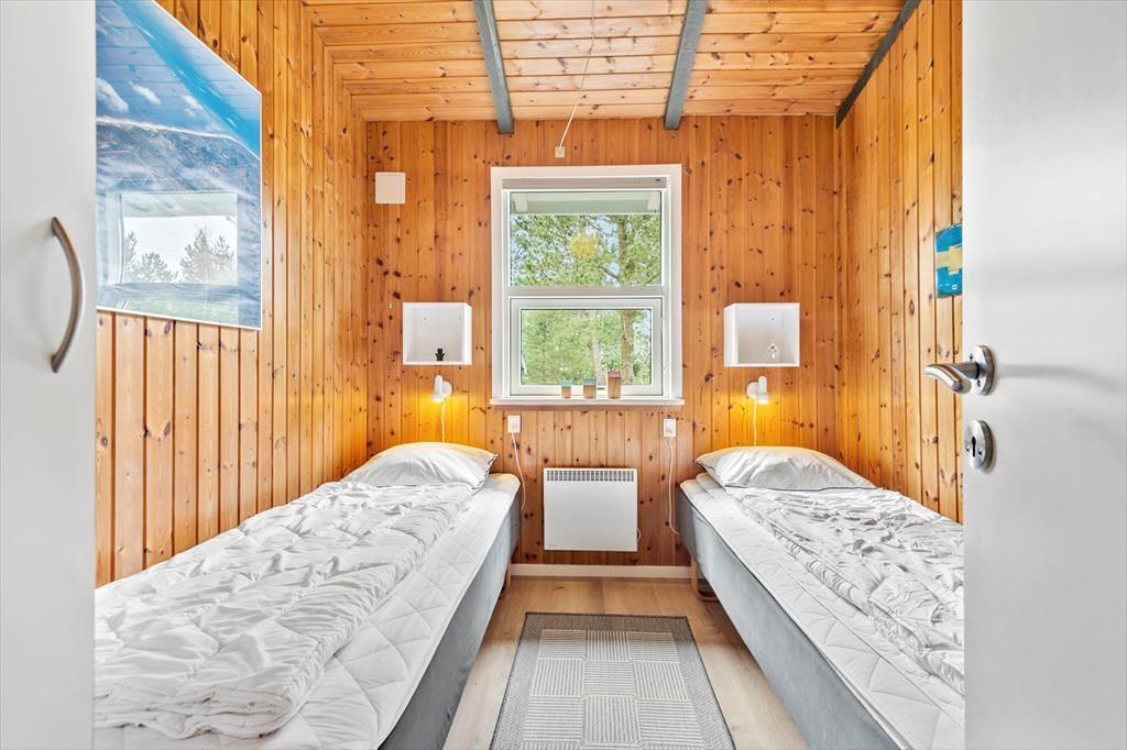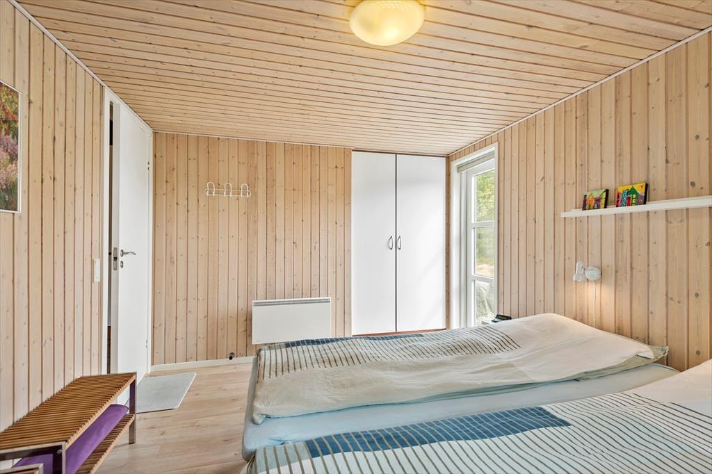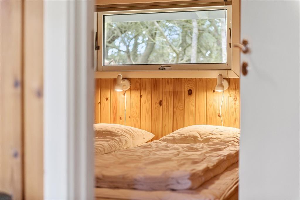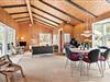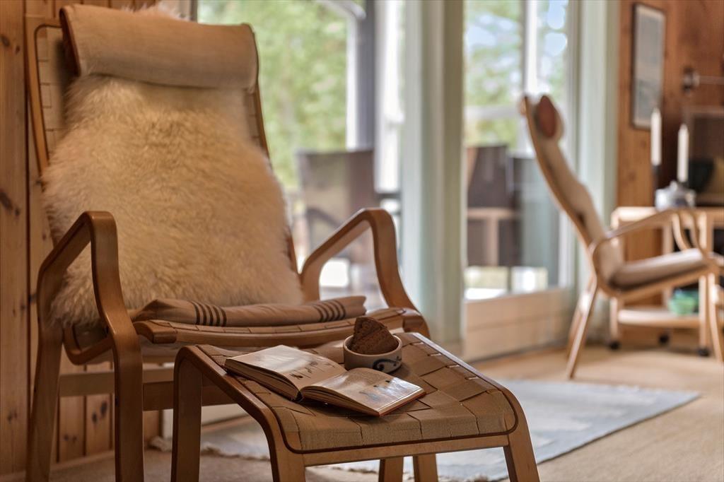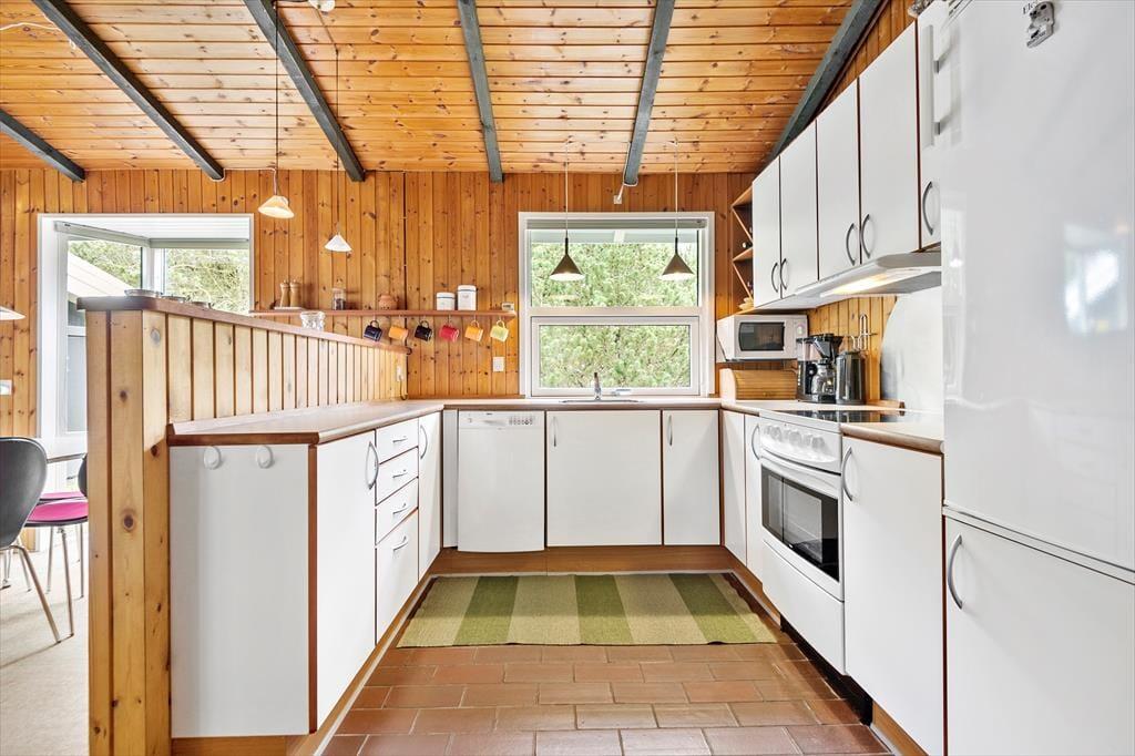 Det er ikke kun husets kønne træfacade, der passer glimrende til de idylliske omgivelser: Inden døre er der umalede trælister på væggene og loft til kip, og også stuens brændeovn er med til at få rummet til at emme af klassisk sommerhuscharme. Der er flere bløde siddepladser at vælge imellem, hvis du har lyst til at tage det helt med ro – og både fra sofaarrangementet og spisebordet har du godt udsyn til naturgrunden, så du kan følge med, hvis et egern eller en fasan pusler rundt udenfor. Såvel badeværelset som de tre soveværelser har en fornuftig størrelse, og som en rar detalje er der en hems i huset, hvor børnene kan folde sig ud med leg og læsning.