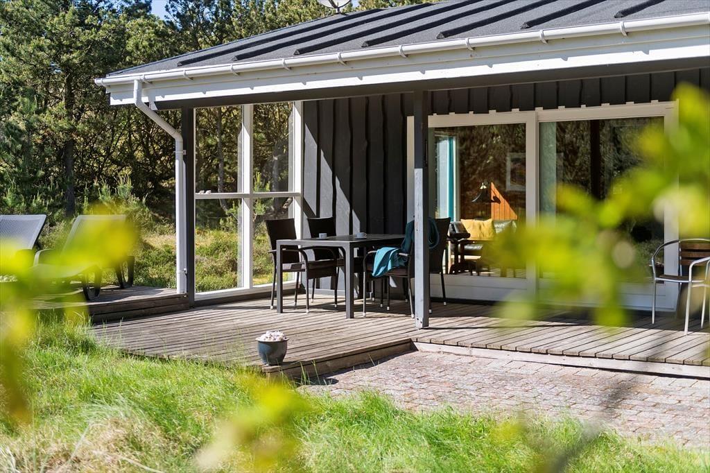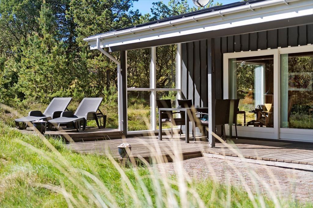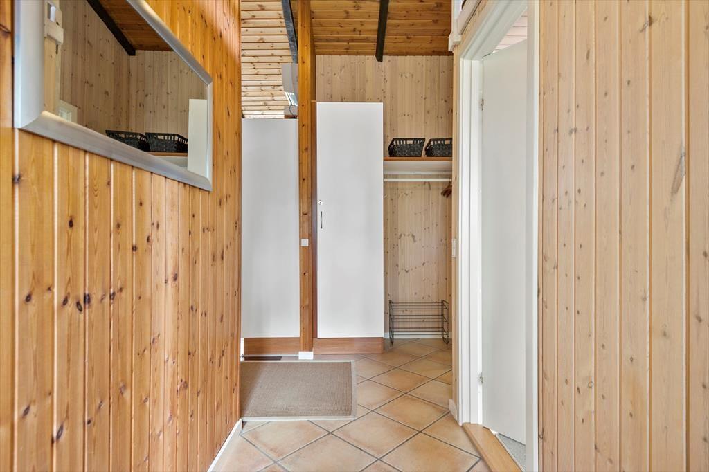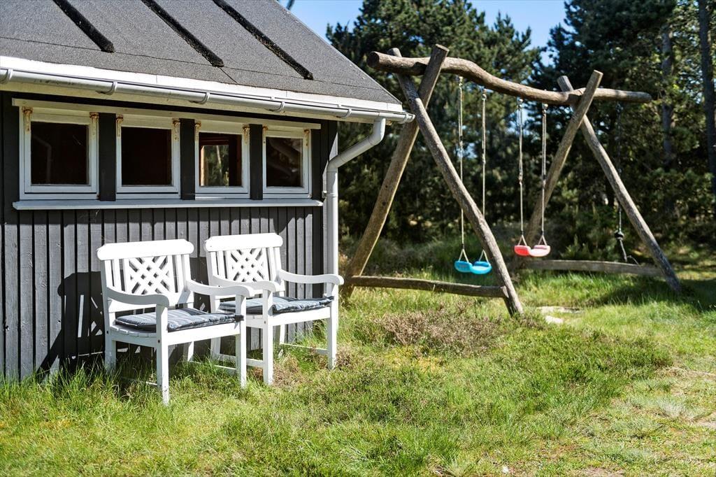 Et stort og delvist overdækket terrassemiljø breder sig øst og syd for sommerhuset, og uanset om det er tid til at drikke morgenkaffe, spise frokost eller slutte dagen af med en drink i tusmørket, er det skønt at sidde her. Hvis du holder ferie med børn, har de måske brug for at komme hurtigere op af havestolen end de voksne – og i så fald er det rart, at der er både gynger, sandkasse og et legehus at hygge sig med. Et fodboldmål er der også på den store naturgrund, der for øvrigt inviterer til at lege gemme eller gå på opdagelse mellem træerne. Kort sagt er det en skøn oase for hele familien, der venter her på Hestehaven 13.