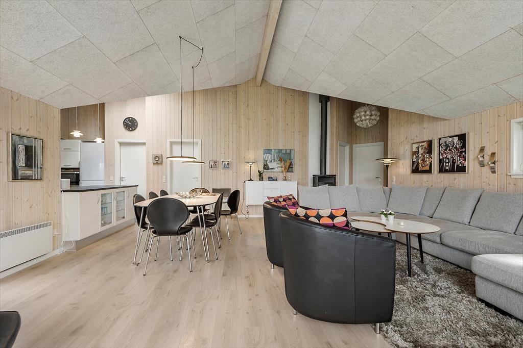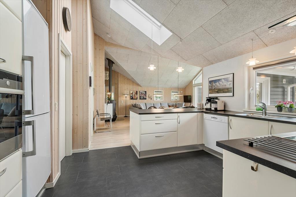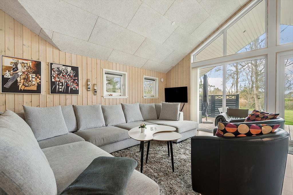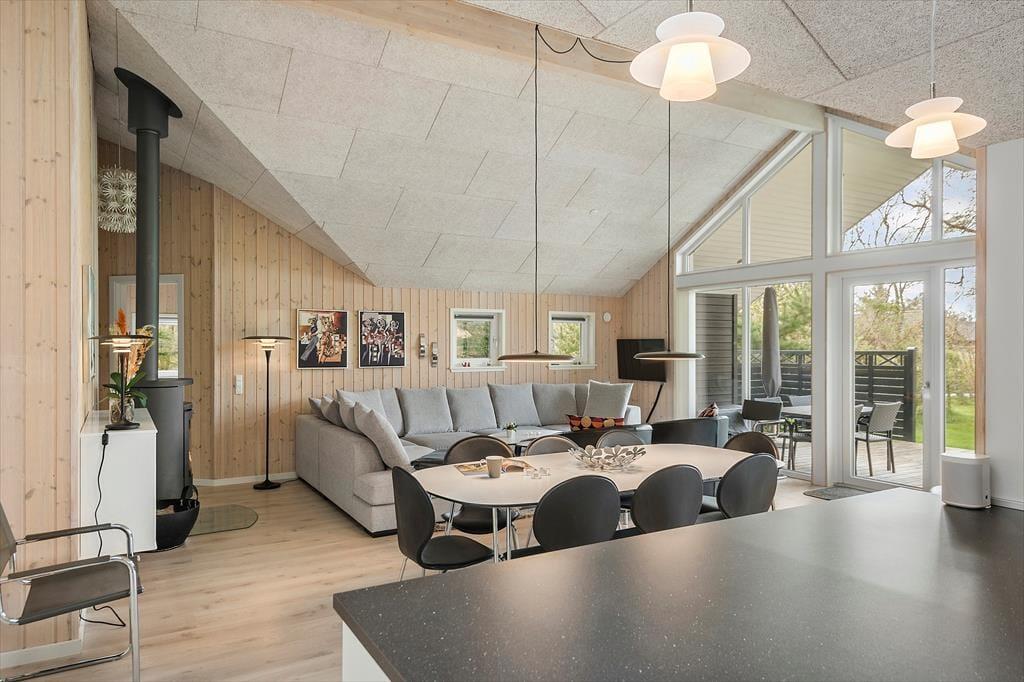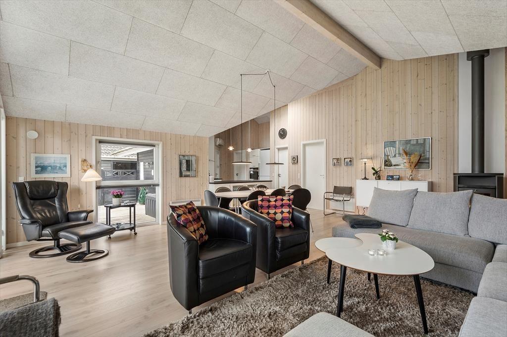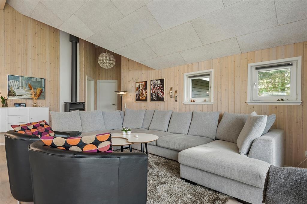 Det er fristende at tilbringe en stor del af ferien inden døre i sommerhuset, hvor de velindrettede rum emmer af hygge og afslapning. Hvis du mest af alt ser frem til at lave mad, hyggesnakke og have god tid med familien, kan du glæde dig til at være i det lyse opholdsrum, hvor køkken og stue ligger i åben forbindelse. Det moderne køkken er rummeligt og veludstyret, og en brændeovn står klar nær sofaafdelingen til at sprede ekstra varme, hvis det er nødvendigt. Et velgørende spabad og en saunatur kan også lade sig gøre på det største af husets to badeværelser – og hvis feriedagen også har budt på udendørs aktiviteter og frisk havluft, kan du og dine kære næsten være sikre på at sove godt og længe på husets fire soveværelser.