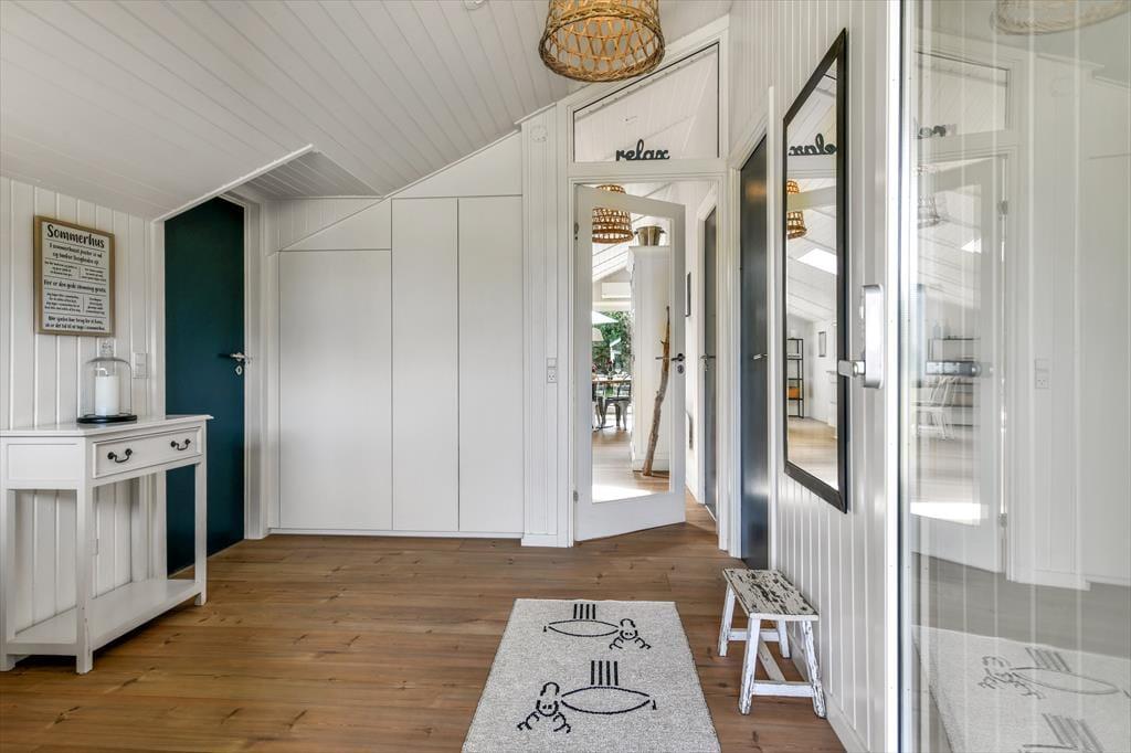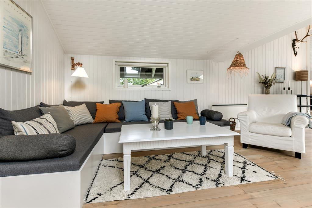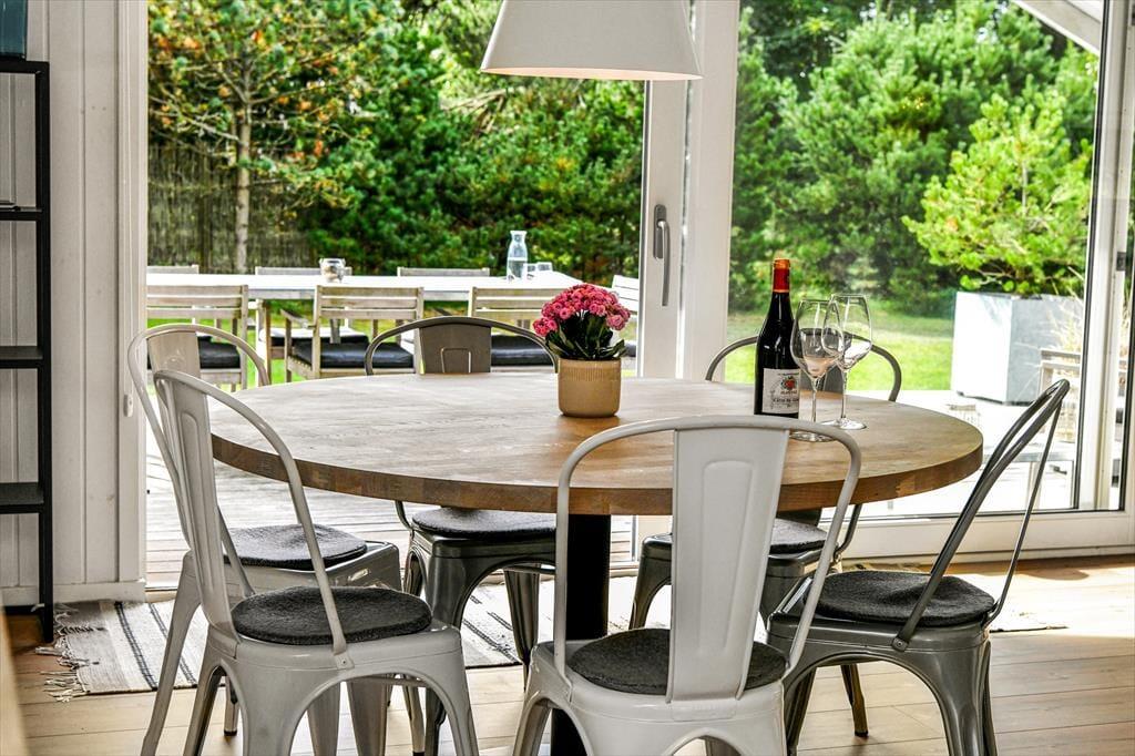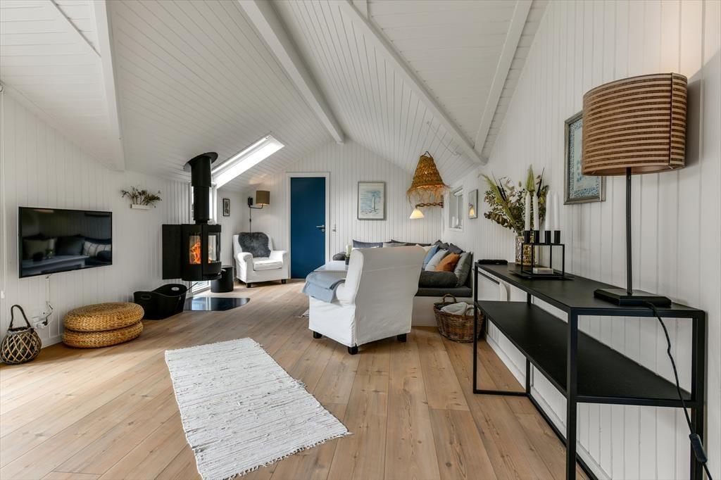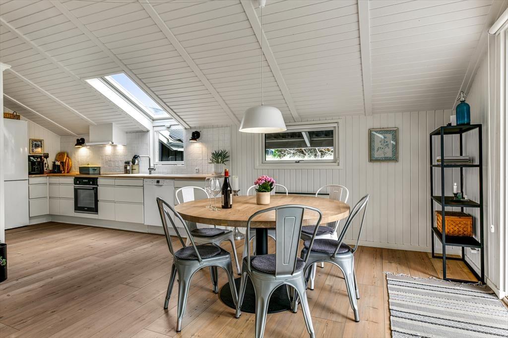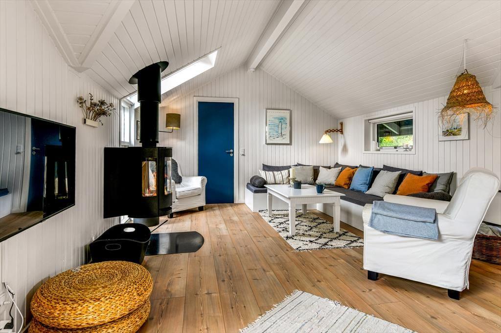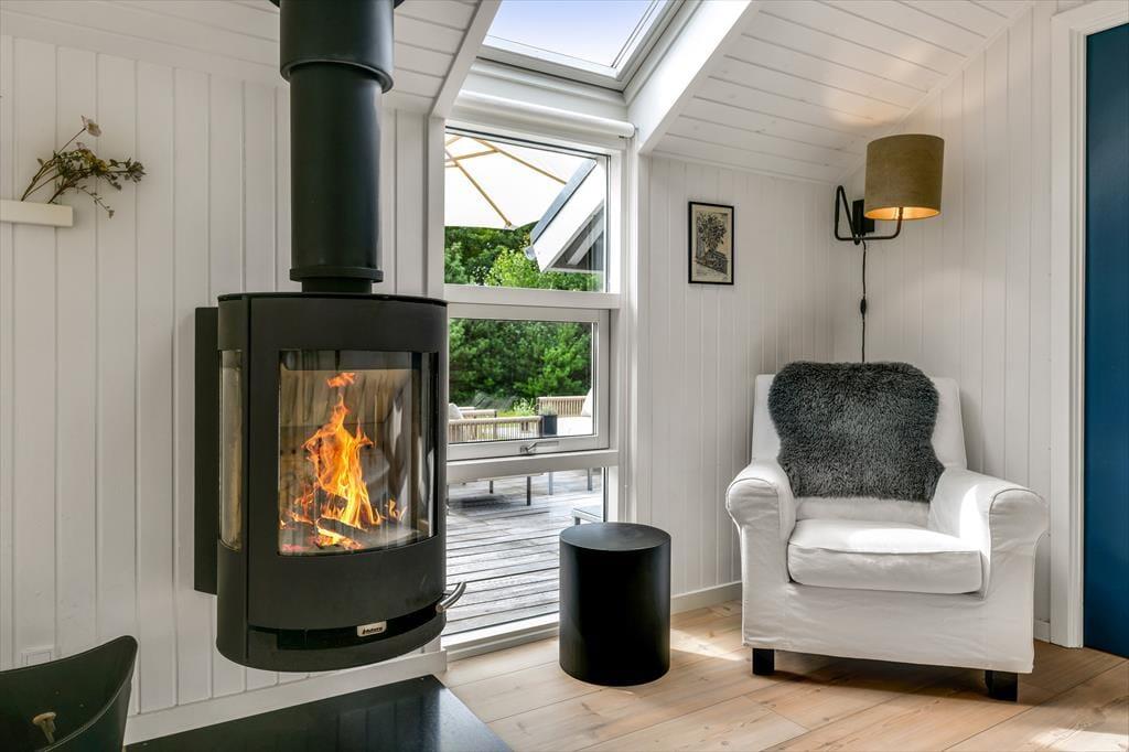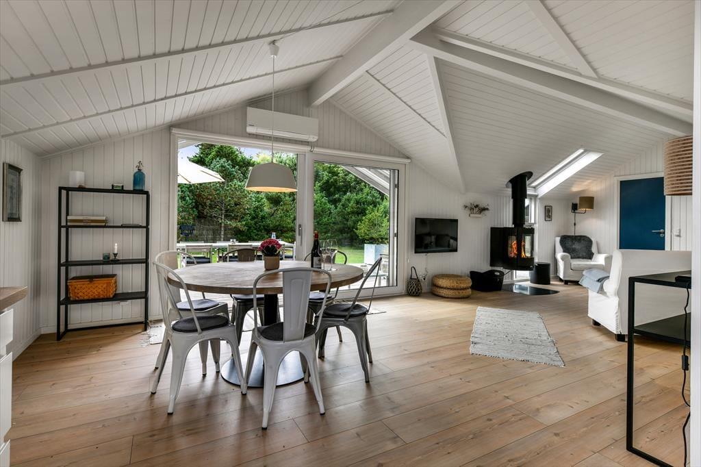 Sommerhuset er indrettet i lyse farvetoner, og det moderne interiør sørger for, at de indendørs rammer er både funktionelle, komfortable og kønne at kigge på. Det åbne køkken er godt at kokkerere i, og det runde spisebord er et hyggeligt sted at samles, når måltidet står klar – og hvis det ikke er spisetid, kan du i stedet mødes her med dine kære for at spille kort og brætspil eller bare hyggesnakke. Stuens sofa er placeret lige ved brændeovnen, og der hænger også et fladskærms-tv på væggen, hvis du er i humør til at se film eller serier. Det ene af de fire soveværelser ligger i annekset, og i det rummelige badeværelse fører en dør lige ud til det fri, så det er nemt at tage det udendørs wellnessareal i brug.