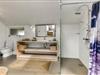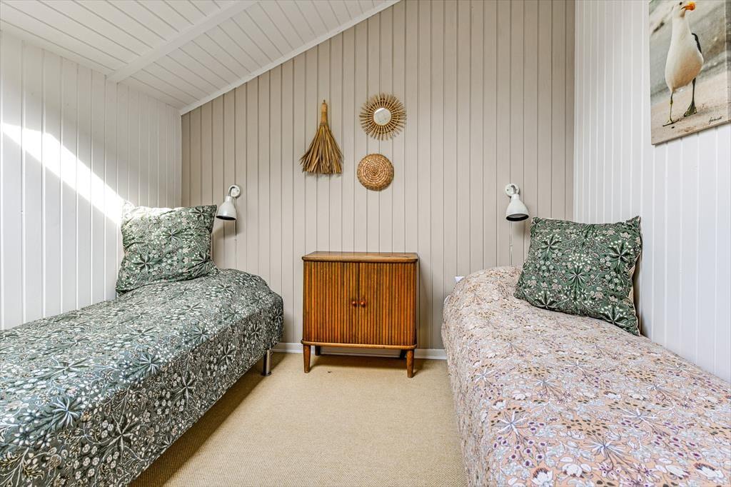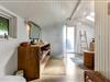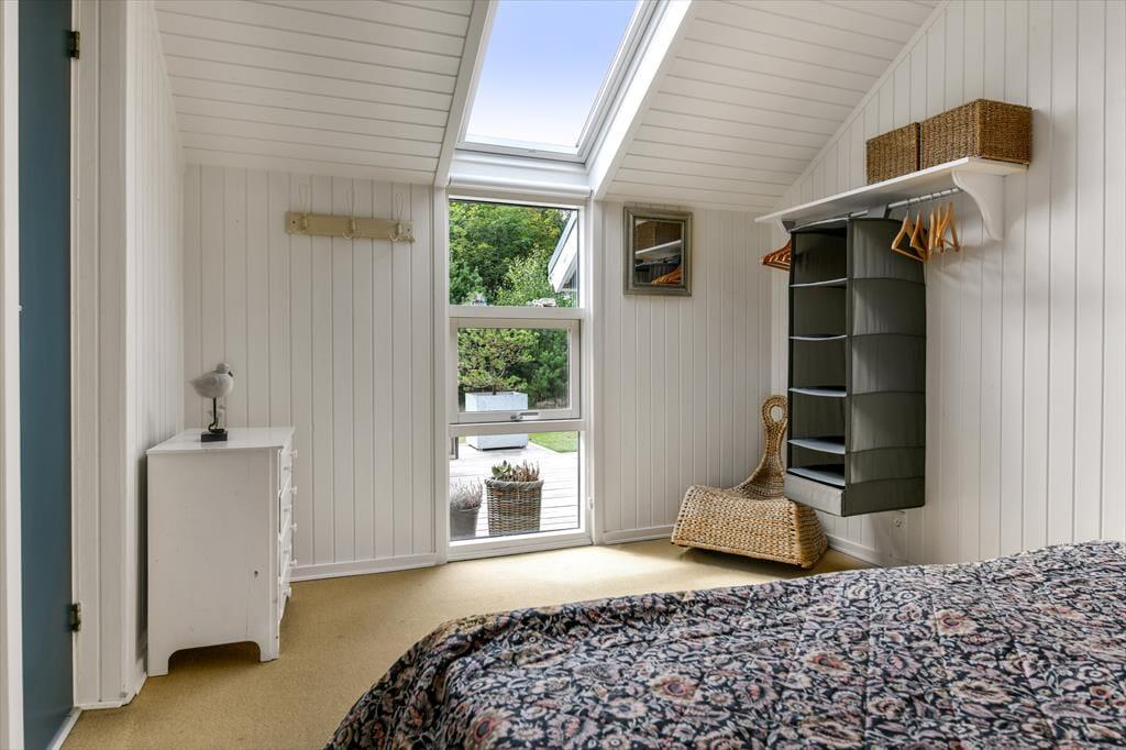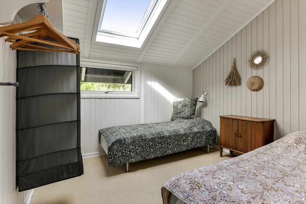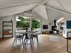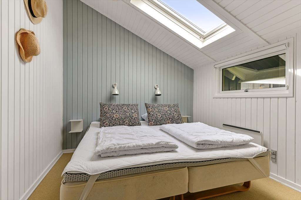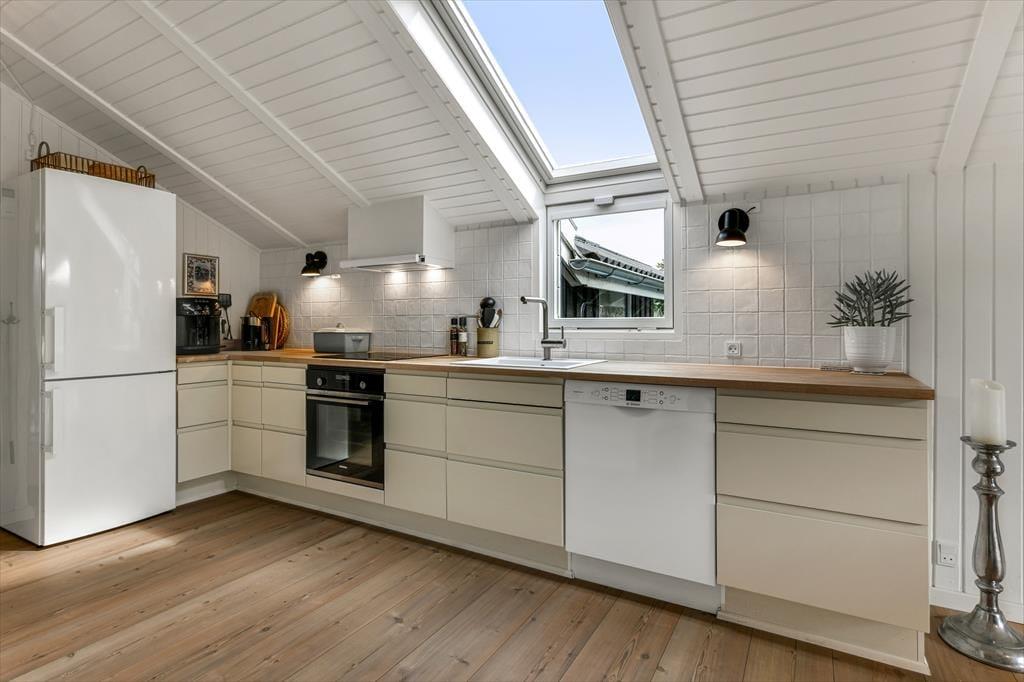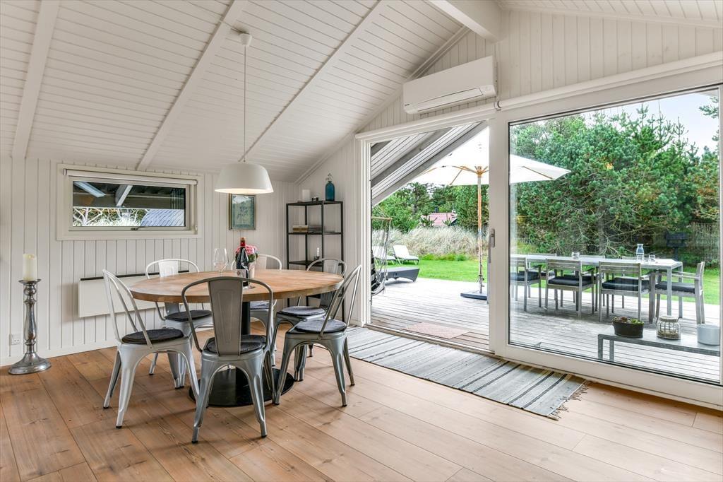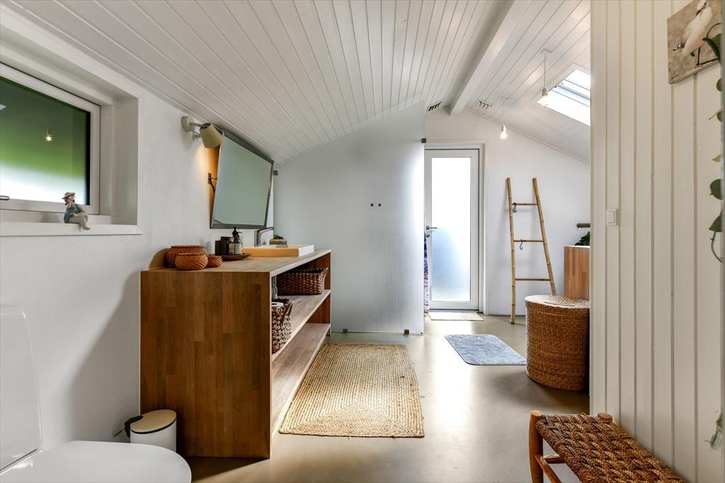 Sommerhuset er indrettet i lyse farvetoner, og det moderne interiør sørger for, at de indendørs rammer er både funktionelle, komfortable og kønne at kigge på. Det åbne køkken er godt at kokkerere i, og det runde spisebord er et hyggeligt sted at samles, når måltidet står klar – og hvis det ikke er spisetid, kan du i stedet mødes her med dine kære for at spille kort og brætspil eller bare hyggesnakke. Stuens sofa er placeret lige ved brændeovnen, og der hænger også et fladskærms-tv på væggen, hvis du er i humør til at se film eller serier. Det ene af de fire soveværelser ligger i annekset, og i det rummelige badeværelse fører en dør lige ud til det fri, så det er nemt at tage det udendørs wellnessareal i brug.