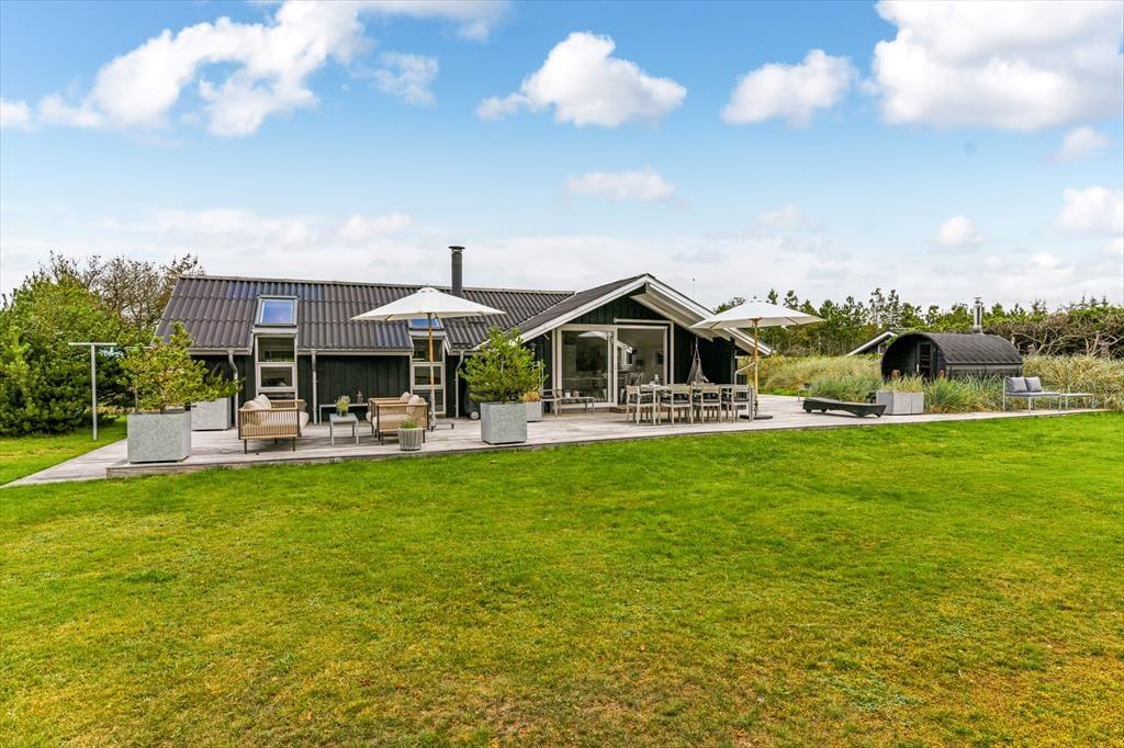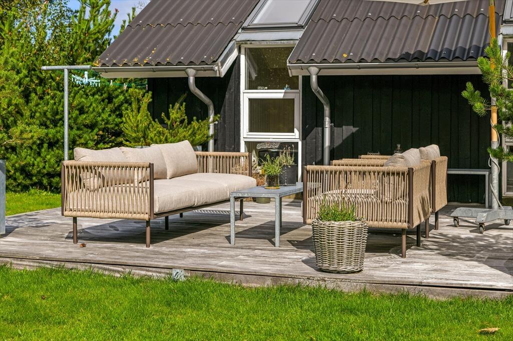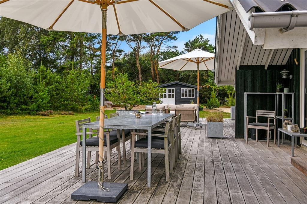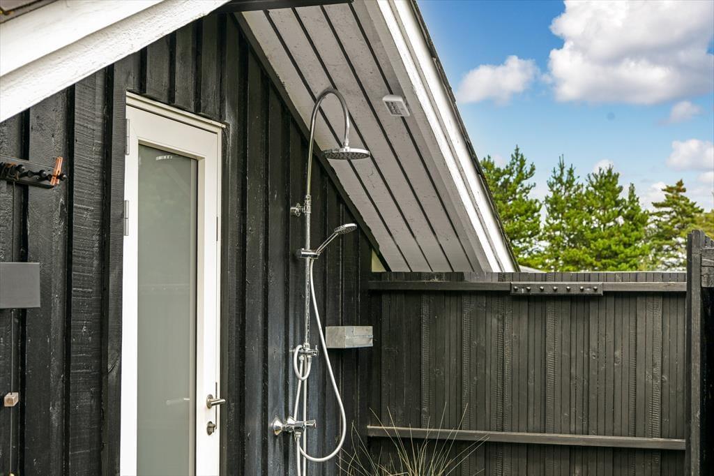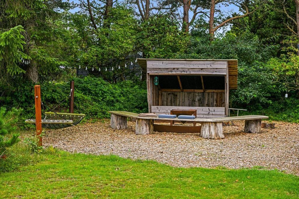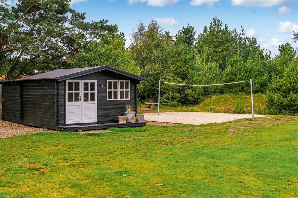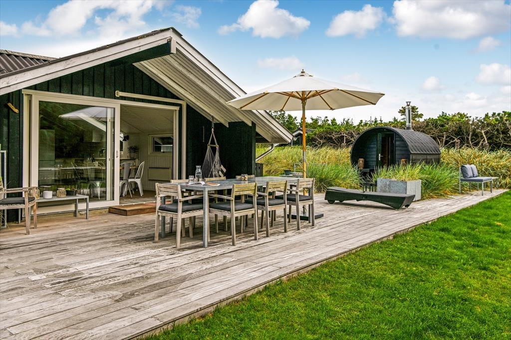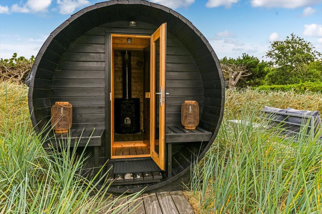 Et udespa, en tøndesauna og en udendørs bruser udgør tilsammen den perfekte treenighed, hvis du gerne vil forkæle dig selv og dine kære med wellness på ferien. Sommerhusets udearealer byder også på en stor træterrasse, hvor I kan flade ud i liggestolene eller mødes til sommerfrokoster eller en drink før aftensmaden. Måltidet kan du tilberede på grillen, og hvis I har energi til flere aktiviteter, når I har slået mave, kan I spille volley på den sandklædte bane. Alternativt er der mulighed for at samles på bålpladsen, hvor du også finder en dejlig hængekøje.
