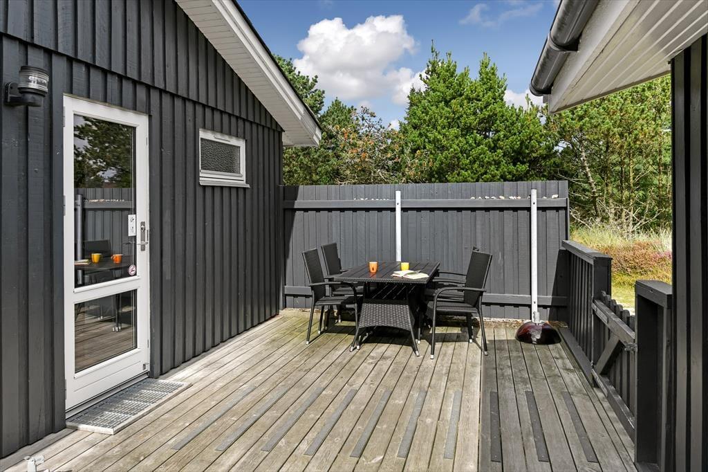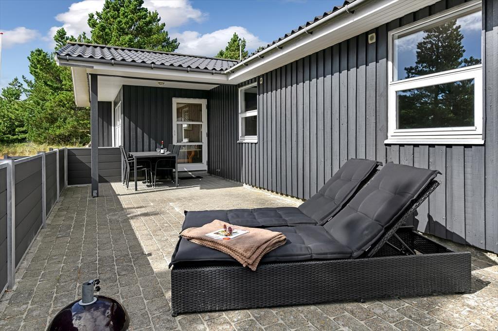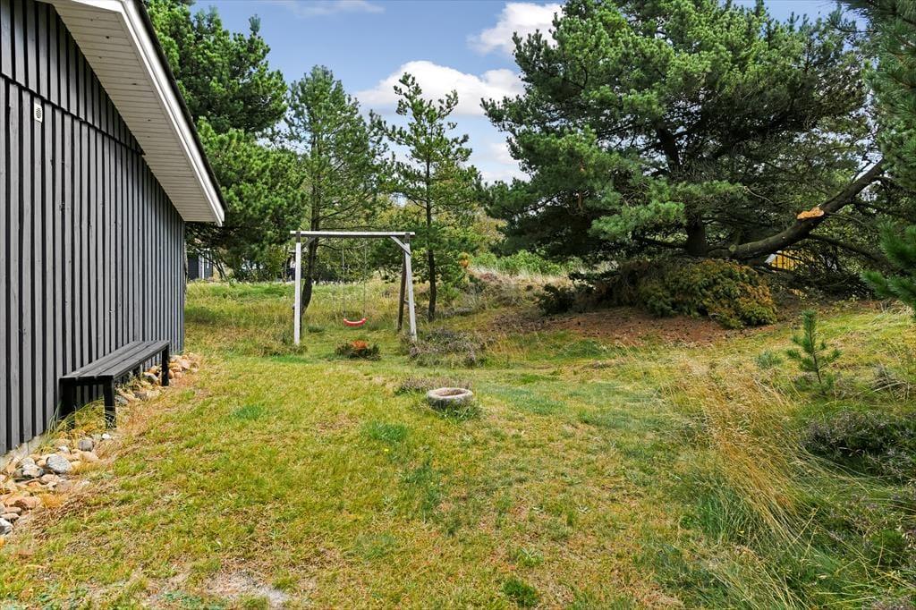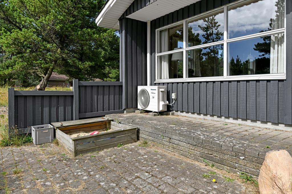 Et stort og lukket terrassemiljø breder sig omkring sommerhuset, og takket være stuens glasdør er det nemt at komme derud, så snart du får lyst. Der er et mindre areal med overdækning, men ellers er terrassen helt åben, så du finder flere kroge med gode muligheder for at finde både sol og læ. Hvis du har en hund med på ferie, vil den sikkert også trives i de rolige og trygge omgivelser – og børnefamilier kan glæde sig over, at der er en sandkasse og et gyngestativ at hygge sig med på den store naturgrund.