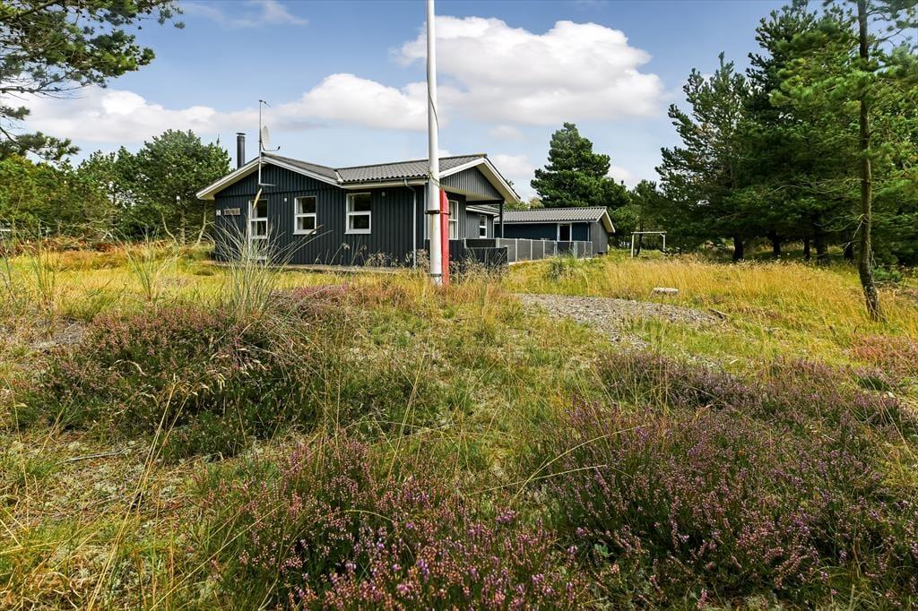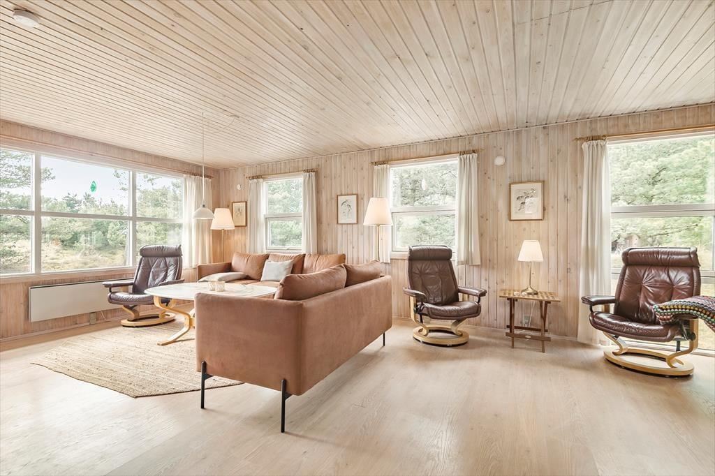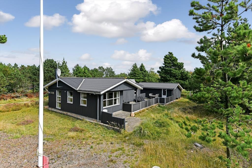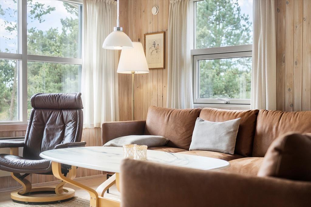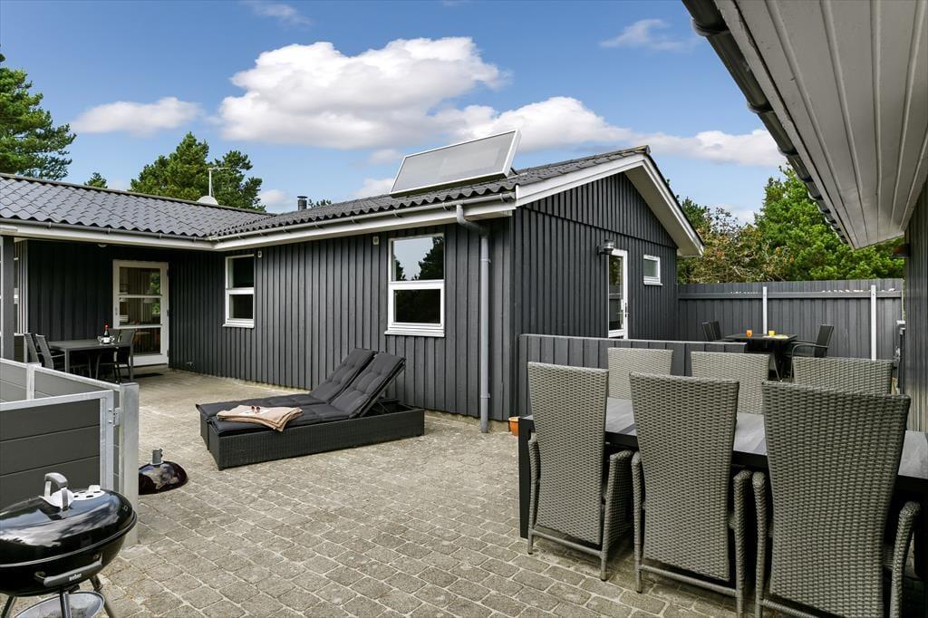 Et stort og lukket terrassemiljø breder sig omkring sommerhuset, og takket være stuens glasdør er det nemt at komme derud, så snart du får lyst. Der er et mindre areal med overdækning, men ellers er terrassen helt åben, så du finder flere kroge med gode muligheder for at finde både sol og læ. Hvis du har en hund med på ferie, vil den sikkert også trives i de rolige og trygge omgivelser – og børnefamilier kan glæde sig over, at der er en sandkasse og et gyngestativ at hygge sig med på den store naturgrund.