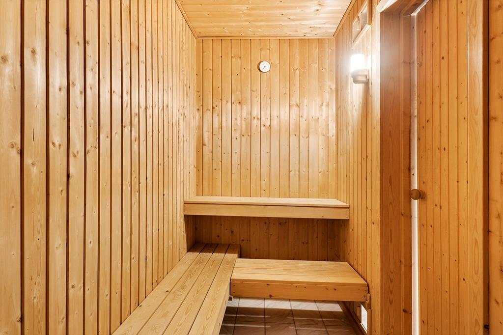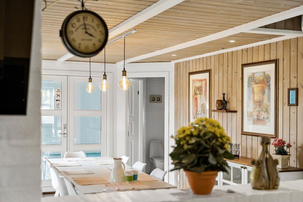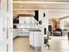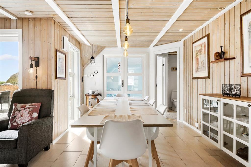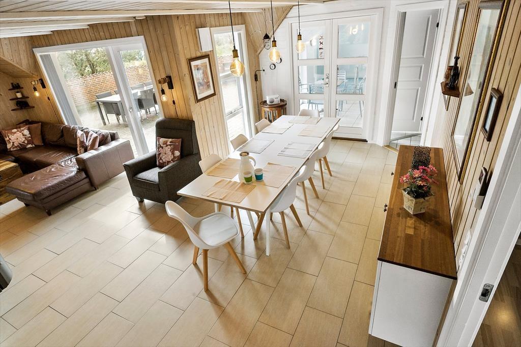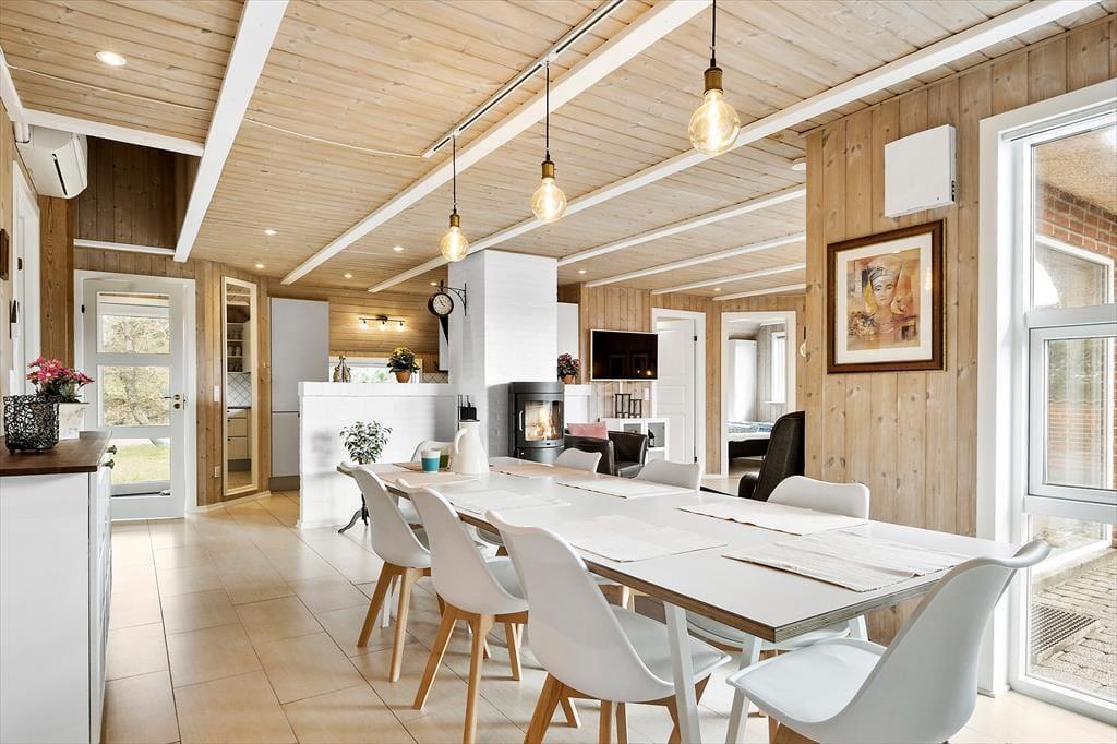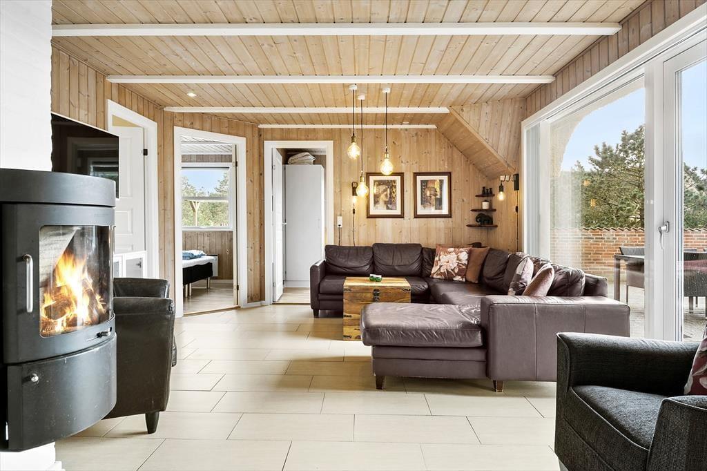 Hvis vi starter med at kigge ind i wellnessafdelingen, er en swimmingpool og et spabad placeret i samme rum, mens en god sauna ligger i forlængelse af badeværelset lige ved siden af. En stor del af ferien kan dermed oplagt blive brugt på at svømme, lege i vandet eller bare koble af i varmen – og hvis børnene kan fortsætte i længere tid end dig og de andre voksne, kan I holde øje med dem fra siddepladsen i poolrummet eller gennem vinduerne ind mod stuen. Netop stuen er et stemningsfuldt opholdsrum med brændeovn og pænt møblement, og det åbne køkken er udstyret med alt det nødvendige, når du vil diske op med et lækkert måltid. Endelig er det værd at fremhæve, at planløsningen med to badeværelser og fire soveværelser gør huset til en oplagt feriebolig for to børnefamilier.