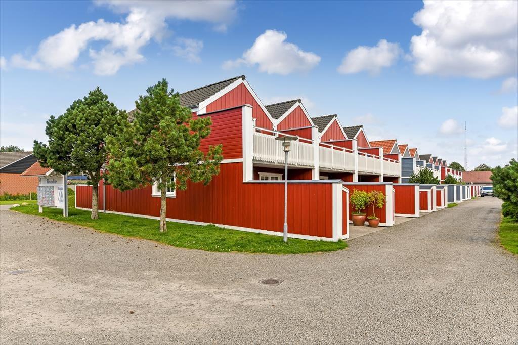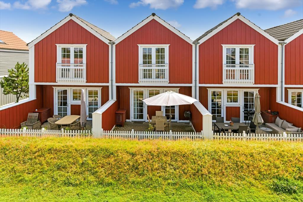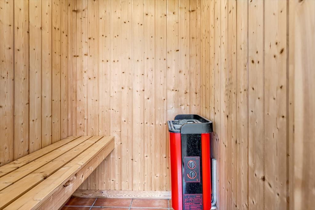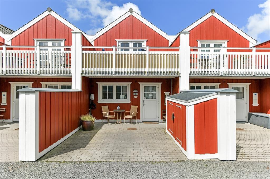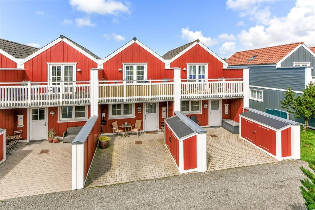 Nærmere præcist er der tale om et rækkehus med rød træfacade og en velformet planløsning i to niveauer. Inden døre er atmosfæren lys og venlig, og ikke mindst i den hyggelige stue er der skønt at være, så du kan roligt sætte dig godt til rette i sofaen eller slå dig ned med familien ved spisebordet. Fra stuen er der åben forbindelse til køkkenet, og i stueplan finder du også et rummeligt badeværelse, der lokker med både spabad og sauna. Husets andet badeværelse ligger på førstesalen, og her er der også to dejlige soveværelser, hvor du og dine kære kan sove godt og længe.