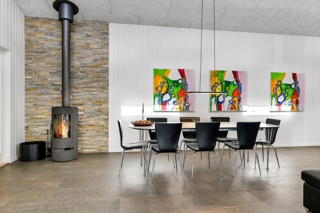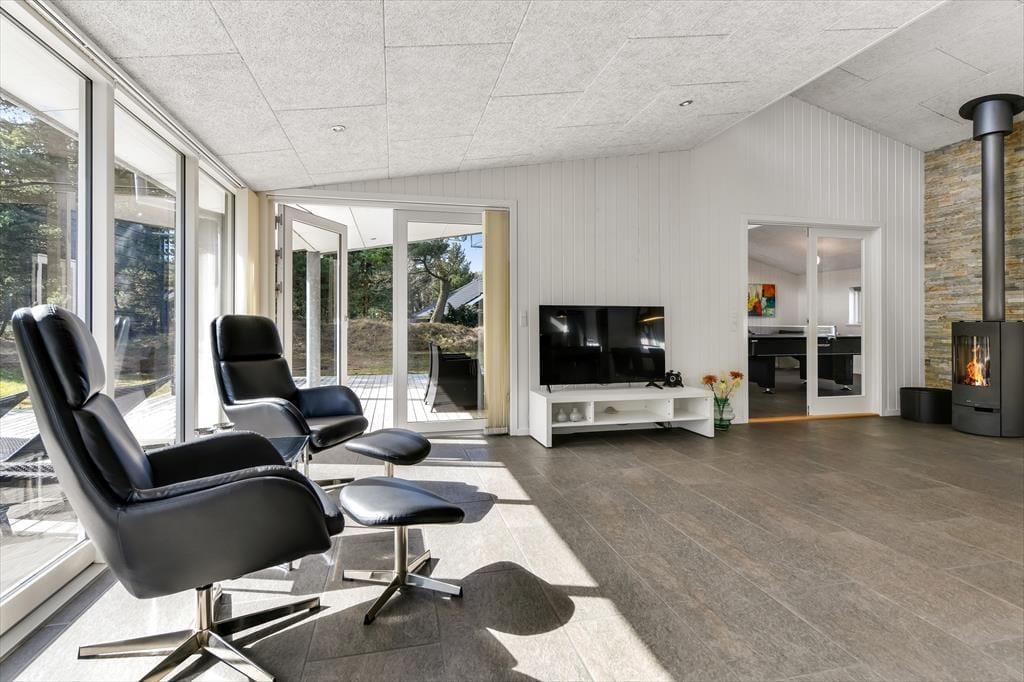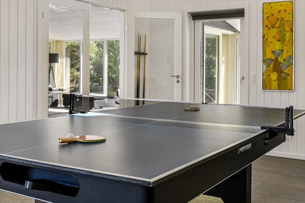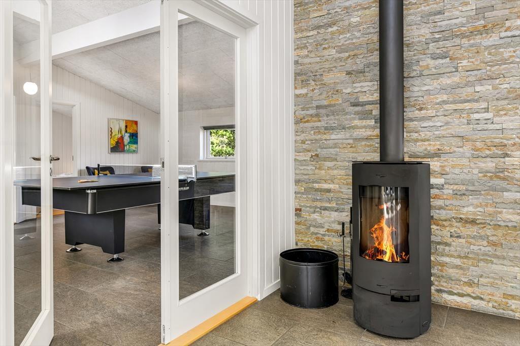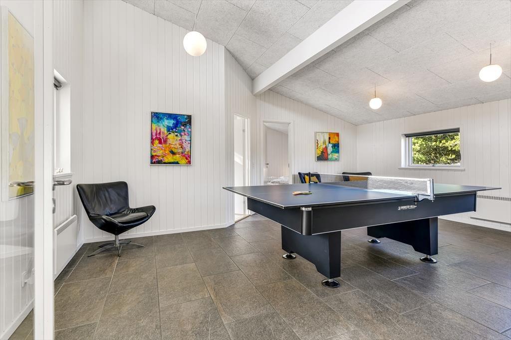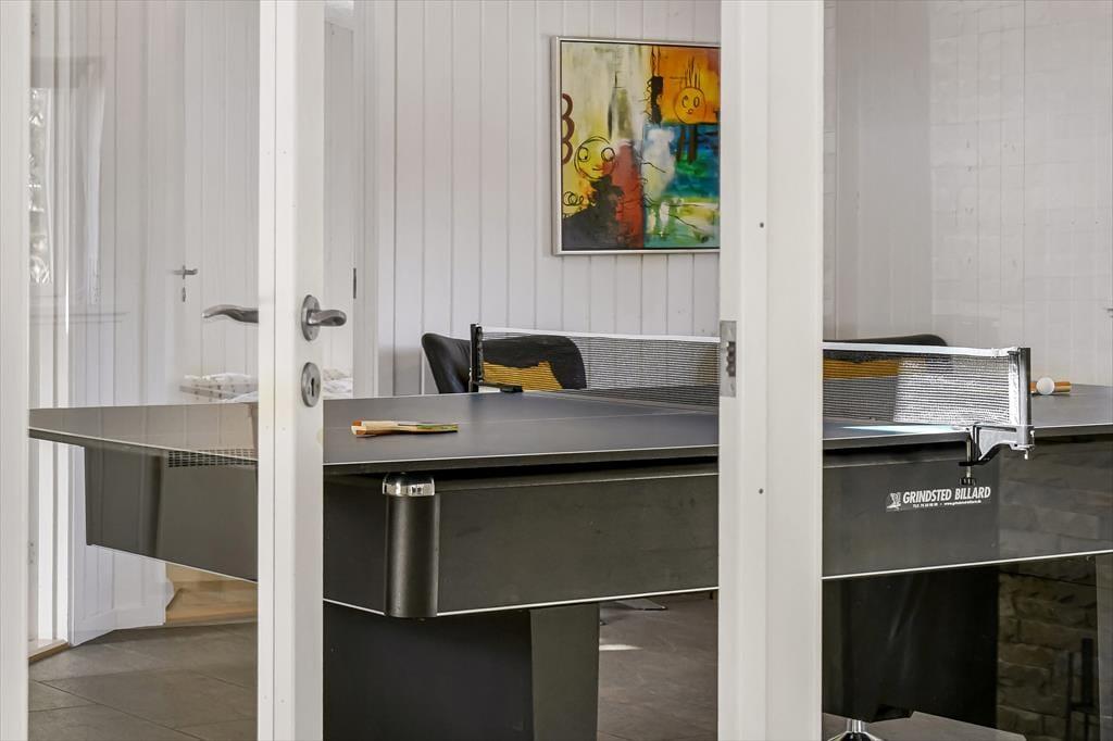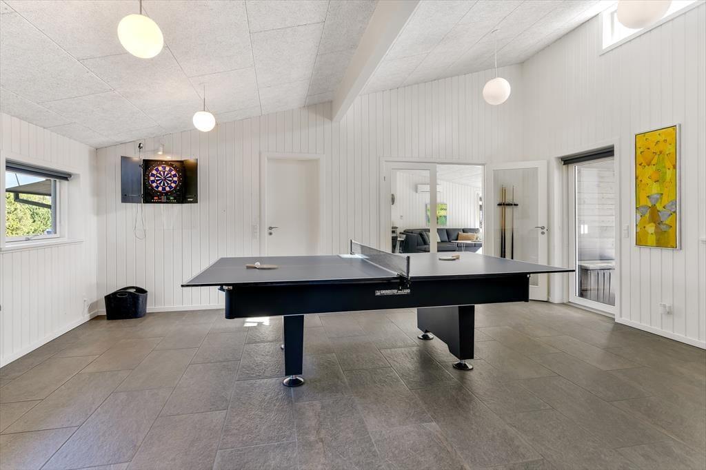 Med en tjekket rumfordeling og hele 167 m2 kan sommerhuset sagtens rumme otte personer - for eksempel to børnefamilier, der gerne vil holde en hyggelig ferie sammen. Uanset hvem du er her med, kan du nyde den gode plads og rummenes stilfulde indretning, for slet ikke at tale om de lækre detaljer, der gør driverlivet endnu mere komfortabelt. På det ene af badeværelserne er der således både spabad og sauna, og i stuen står en brændeovn, der kan give måltiderne og de tilbagelænede sofastunder et ekstra strejf af varme og hygge. Skal der være lidt mere gang i den, kan du udfordre de andre i pool, bordtennis eller dart i aktivitetsrummet.