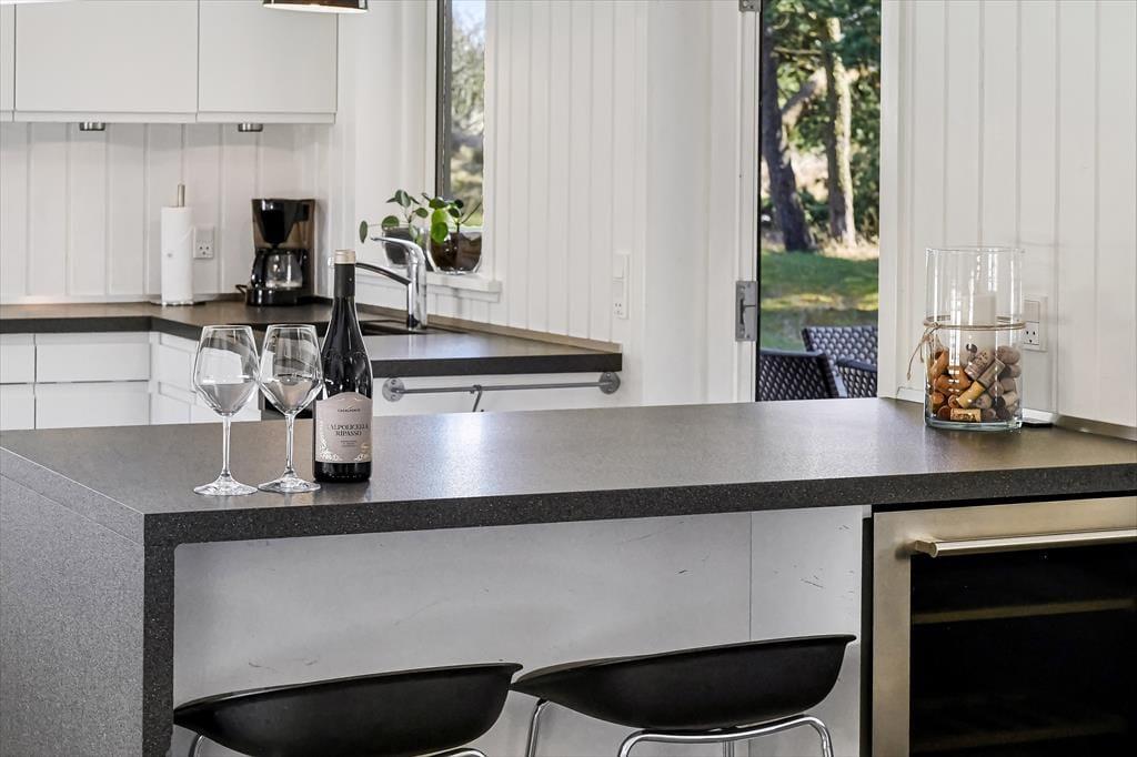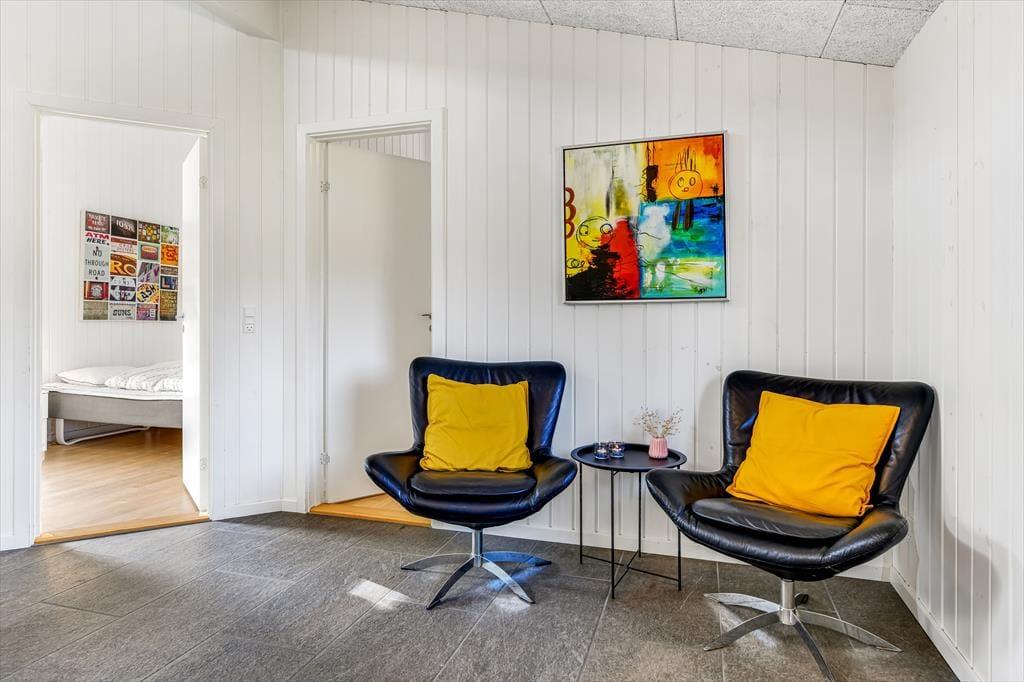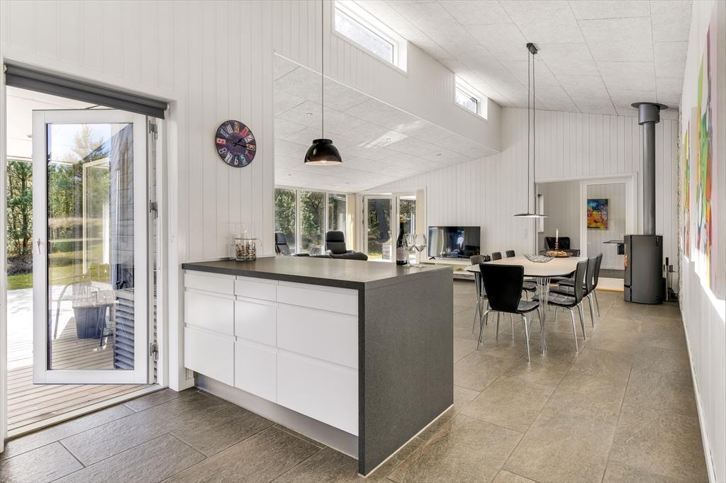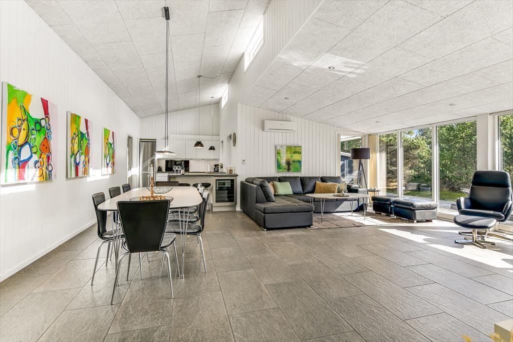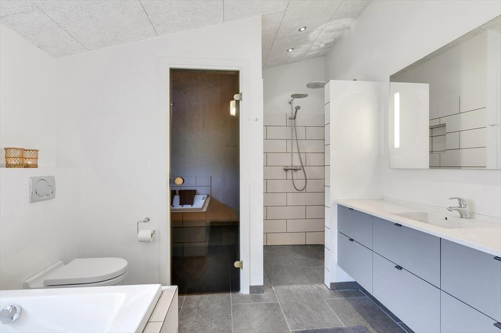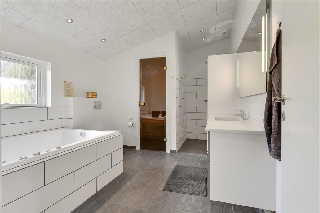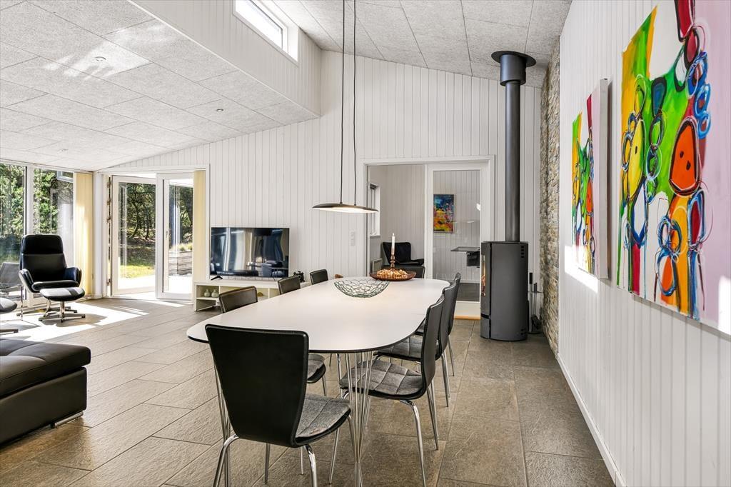 Med en tjekket rumfordeling og hele 167 m2 kan sommerhuset sagtens rumme otte personer - for eksempel to børnefamilier, der gerne vil holde en hyggelig ferie sammen. Uanset hvem du er her med, kan du nyde den gode plads og rummenes stilfulde indretning, for slet ikke at tale om de lækre detaljer, der gør driverlivet endnu mere komfortabelt. På det ene af badeværelserne er der således både spabad og sauna, og i stuen står en brændeovn, der kan give måltiderne og de tilbagelænede sofastunder et ekstra strejf af varme og hygge. Skal der være lidt mere gang i den, kan du udfordre de andre i pool, bordtennis eller dart i aktivitetsrummet.