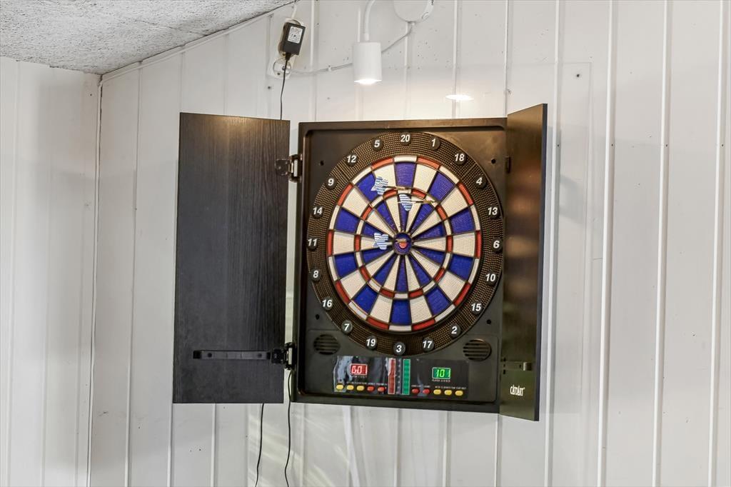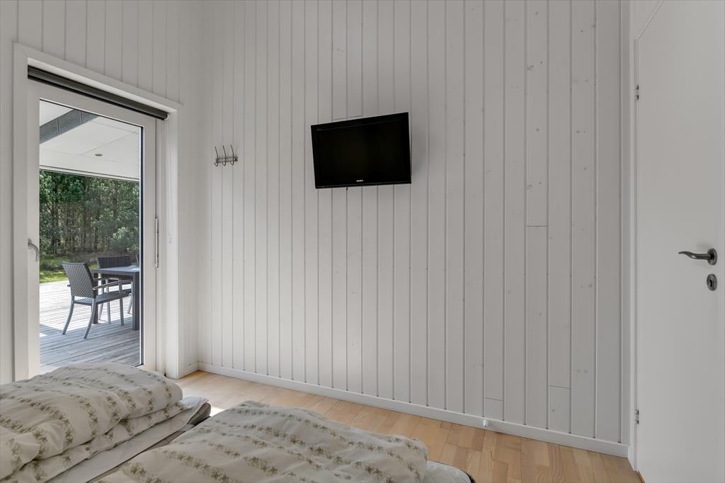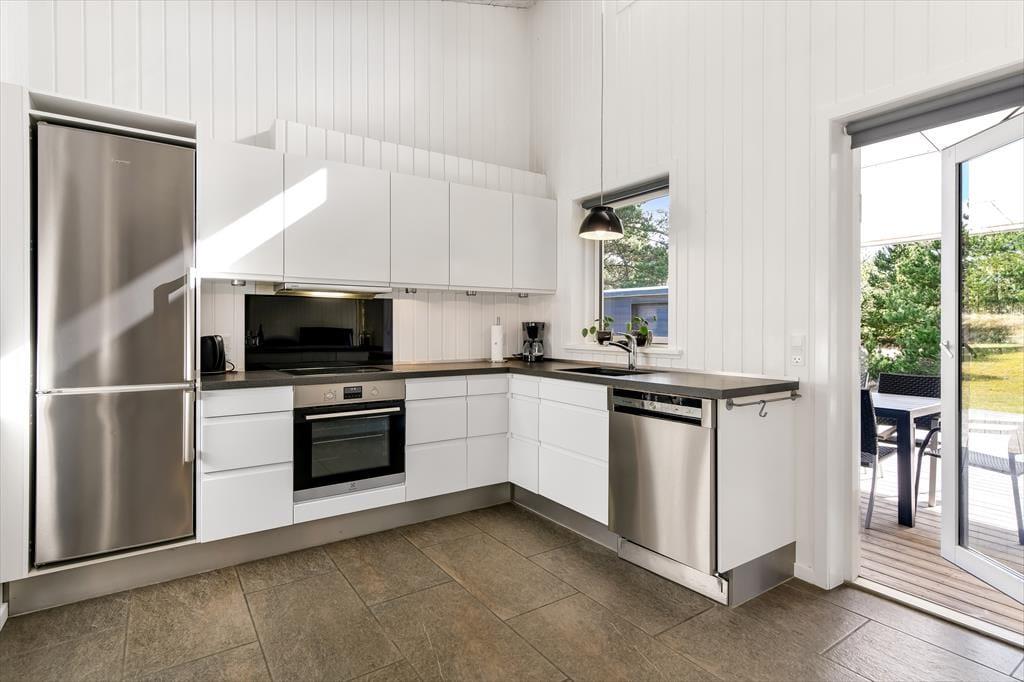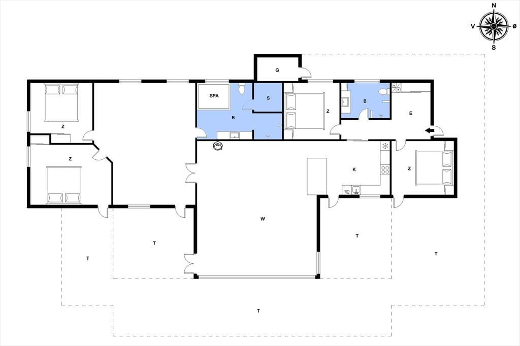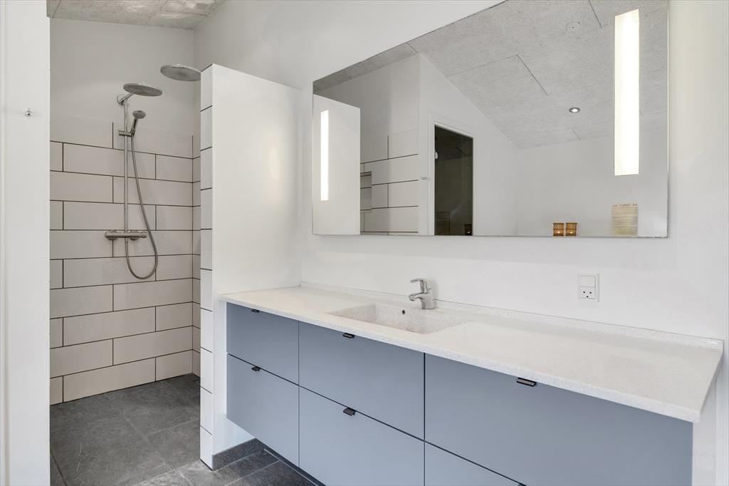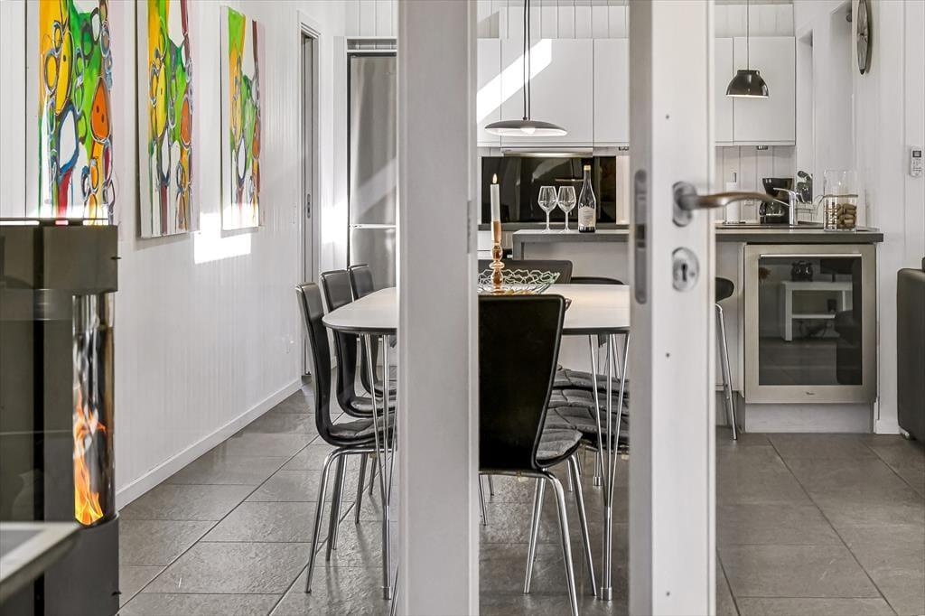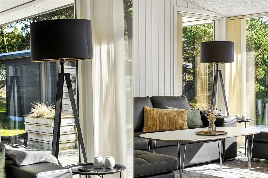 Med en tjekket rumfordeling og hele 167 m2 kan sommerhuset sagtens rumme otte personer - for eksempel to børnefamilier, der gerne vil holde en hyggelig ferie sammen. Uanset hvem du er her med, kan du nyde den gode plads og rummenes stilfulde indretning, for slet ikke at tale om de lækre detaljer, der gør driverlivet endnu mere komfortabelt. På det ene af badeværelserne er der således både spabad og sauna, og i stuen står en brændeovn, der kan give måltiderne og de tilbagelænede sofastunder et ekstra strejf af varme og hygge. Skal der være lidt mere gang i den, kan du udfordre de andre i pool, bordtennis eller dart i aktivitetsrummet.