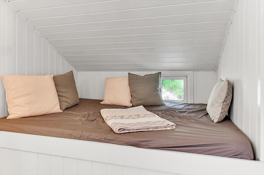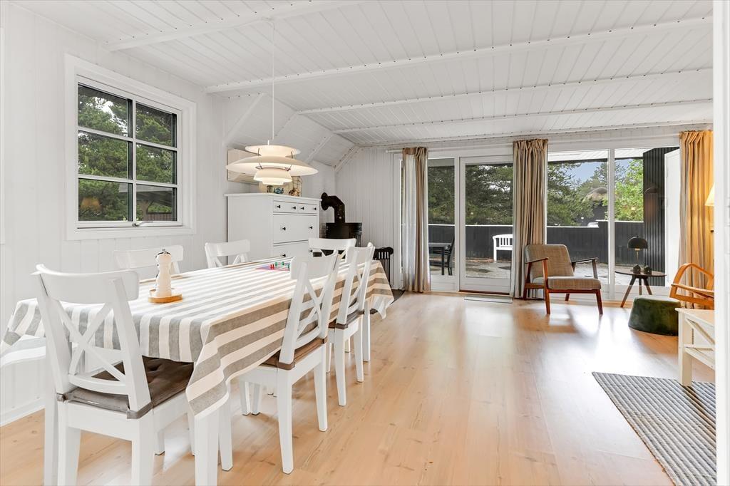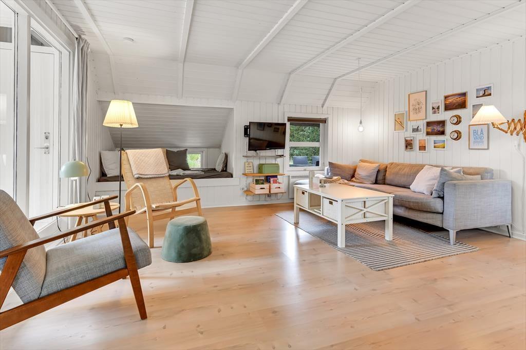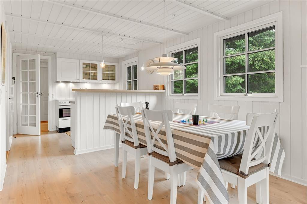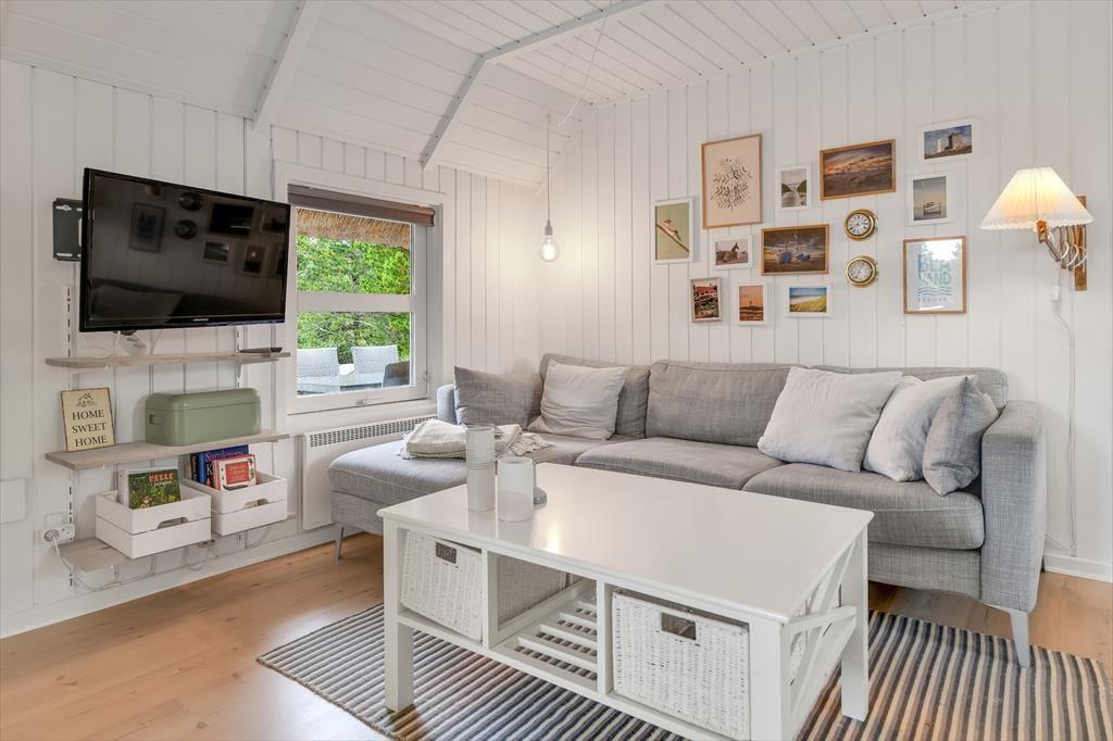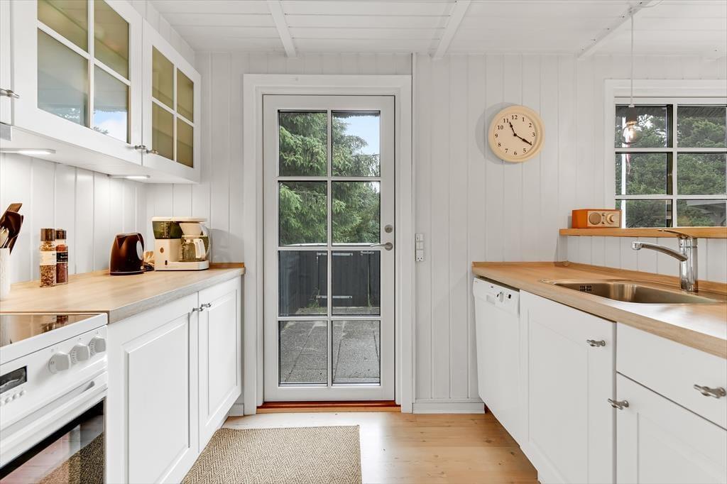 Sommerhuset er indrettet med lyse farvetoner og møblement, der har en køn og klassisk stil, og det er selvfølgelig med til at skrue op for hyggestemningen inden døre. Det er også rart, at der er en brændeovn inden døre – især på en mørk aften, hvor I vil hygge jer i stuen med strikketøj, gode bøger eller brætspil. Hvis du ikke vil være eneansvarlig for madlavningen, kan du sikkert overtale nogle af de andre til at hjælpe dig med madlavningen i det åbne køkken, og hvis du har brug for at slå mave inden desserten, kan du lægge dig et øjeblik i stuens hyggelige alkove.