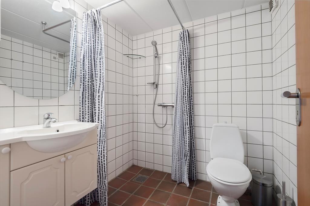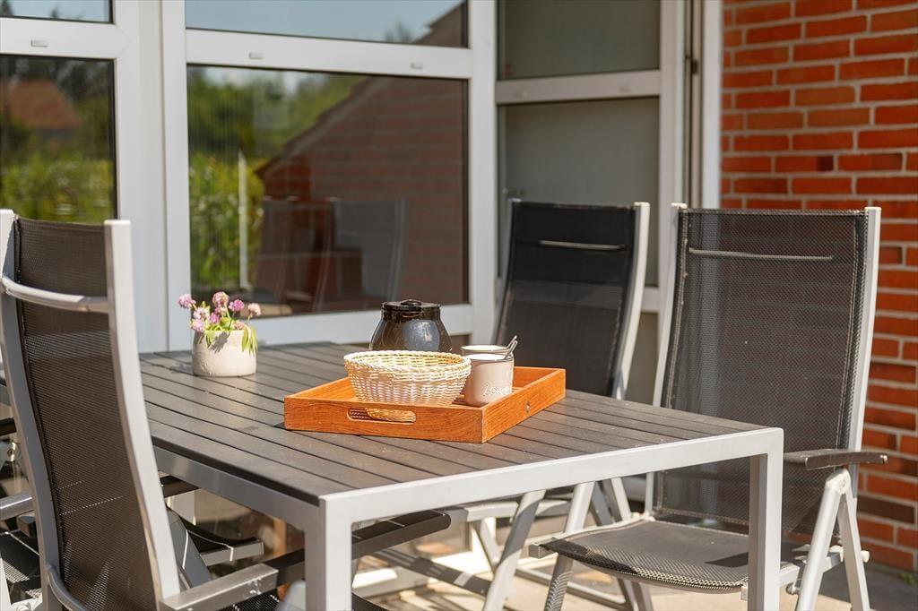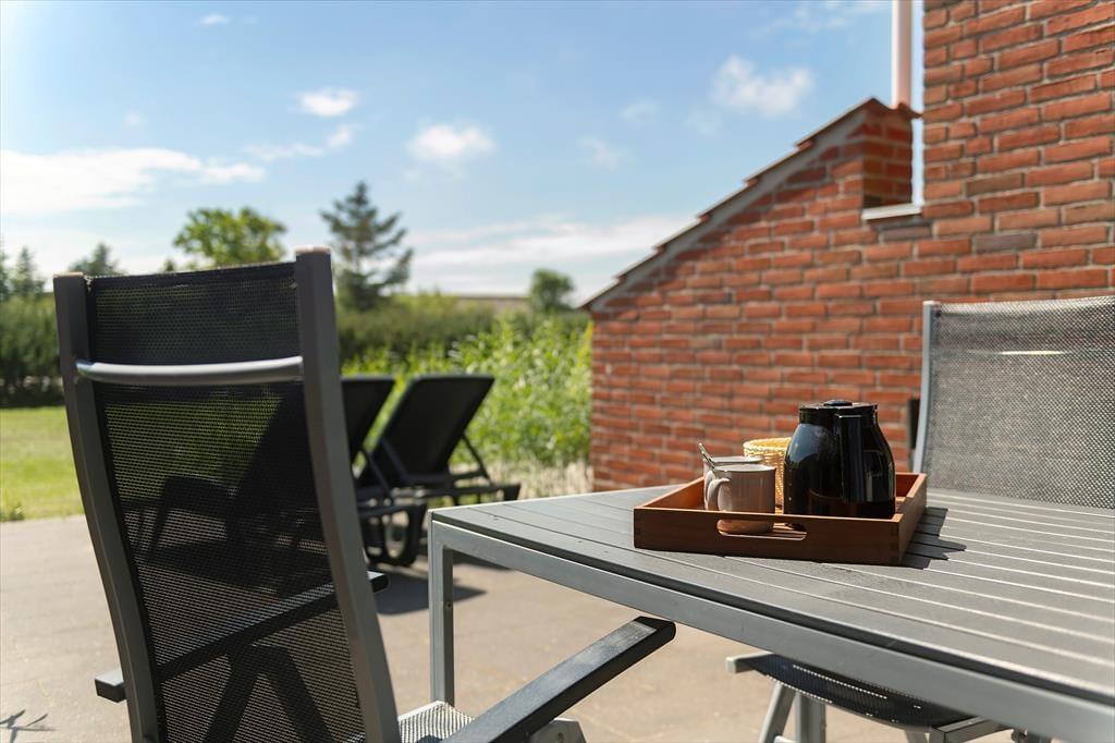 Hvis du har lavet iskaffe en på en solrig dag, er det tillokkende at tage den med ud på den dejlige terrasse, der breder sig i forlængelse af stuen. Terrassen er godt skærmet af ind mod naboerne, og det er det helt rette sted at læne sig tilbage og lukke øjnene – uanset om du vil sidde i en solstråle eller foretrækker parasollens skygge. På de grønne fællesarealer har børnene plads til at lege, og der er også et bord-bænke-sæt at slå sig ned ved. Der er sågar også plads til at hænge badetøjet på vasketøjsnorene, og bilen kan holde på den fælles parkeringsplads.