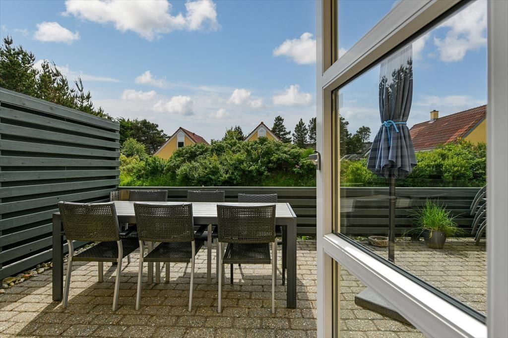 Sommerhusets terrasse er helt aflukket, godt afskærmet og dejligt solrig, så det er en herlig oase – også for små børn eller hunde, der kan hygge sig her i de trygge omgivelser. Skulle du trænge til lidt skygge, kan du slå parasollen op, og hvis du eller de andre i selskabet begynder at blive sultne, kan I gøre havegrillen klar og begynde at tilberede måltidet under åben himmel. Og hvis sommeraftenen viser sig fra sin smukkeste side, er der ingen grund til at gå indenfor, før det er sengetid. På græsplænen nær terrassen er der gyngestativ og sandkasse, og på den anden side af huset er der plads til at parkere bilen.