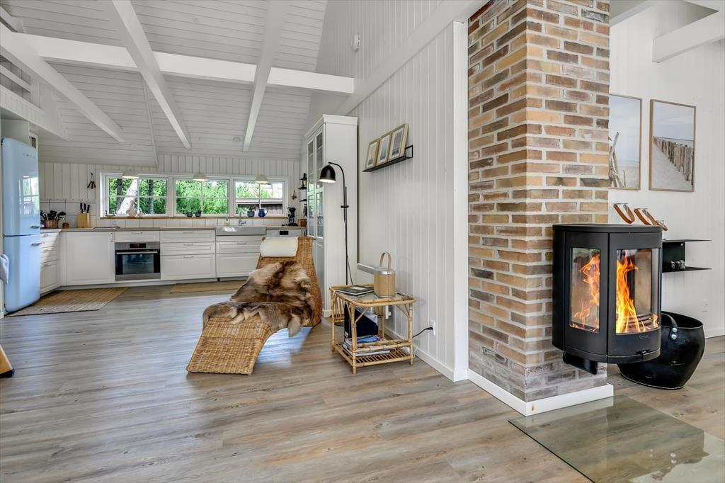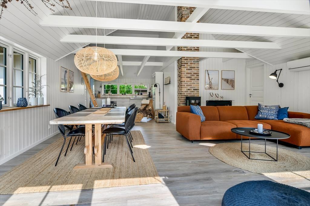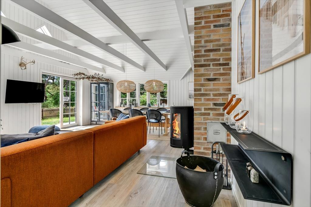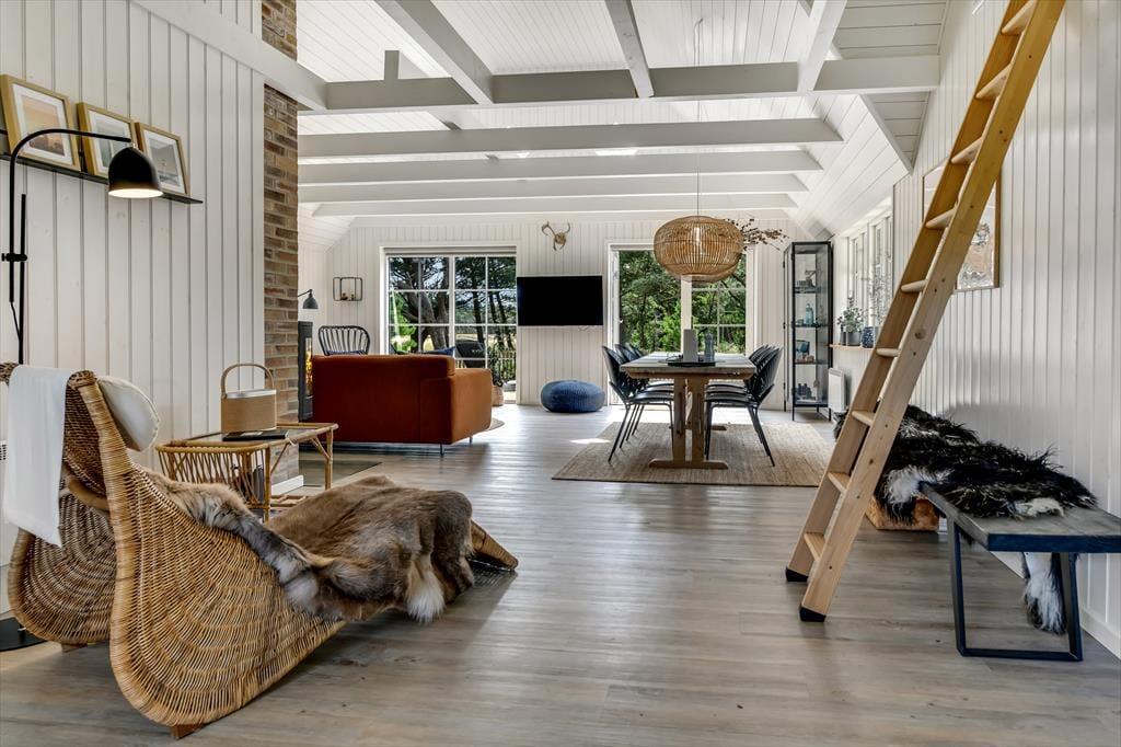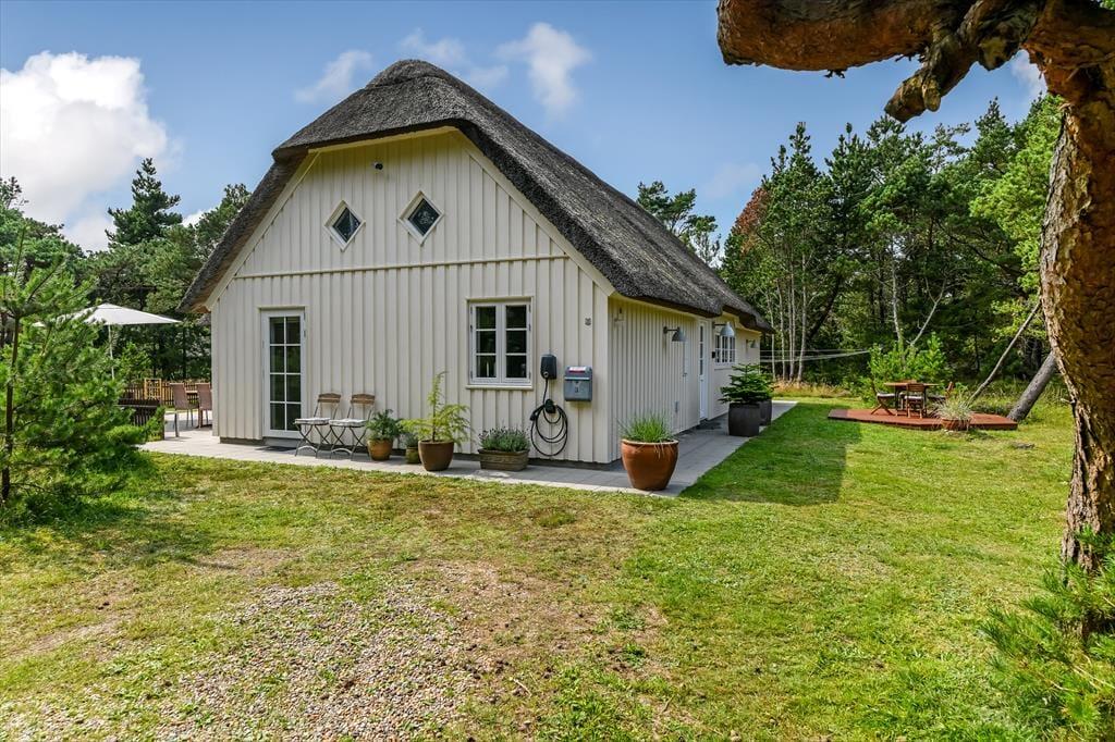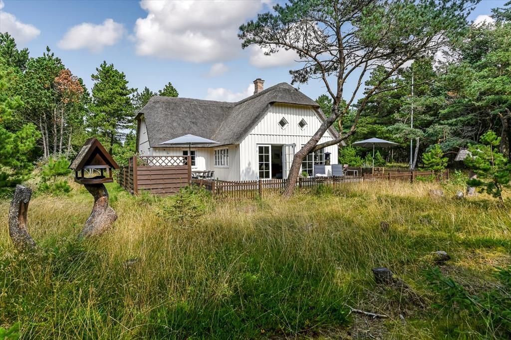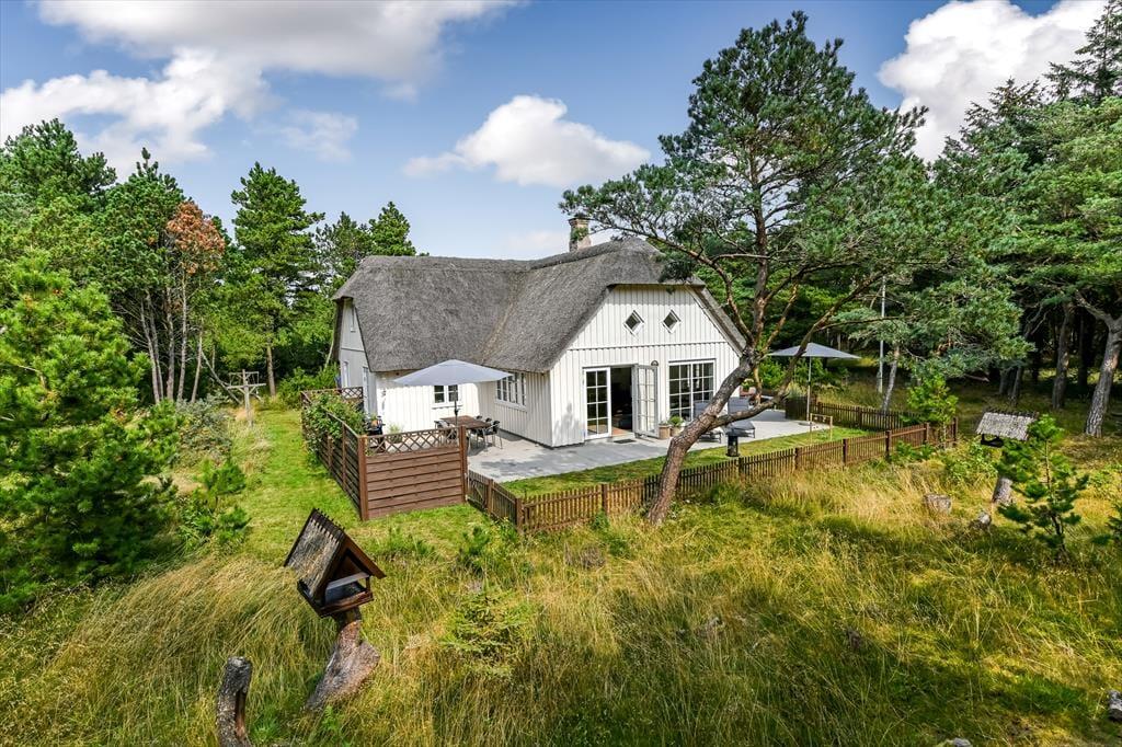 Med sit smukke stråtag og sin hvide træfacade er arkitekturen klassisk, men det 133 m2 store sommerhus har nu kun stået her på naturgrunden siden 2015. Inden døre byder indretningen på en velfungerende blanding af det tidsløse og det mere moderne, så du er sikker på at bo komfortabelt og samtidig i særdeles stemningsfulde rammer. Med to lækre badeværelser, tre gode soveværelser og en stor hems med ekstra sovepladser kan du nemt invitere familie eller venner med på ferien – og I kan alle glæde jer til at samles til leg, hygge og afslapning i det flotte opholdsrum. Her er der brændeovn til eventuelle kølige dage og et åbent køkken, hvor I kan trylle alle jeres favoritretter frem, og gennem vinduerne kan I nyde det smukke lysindfald og se lige ud på de naturskønne omgivelser.
