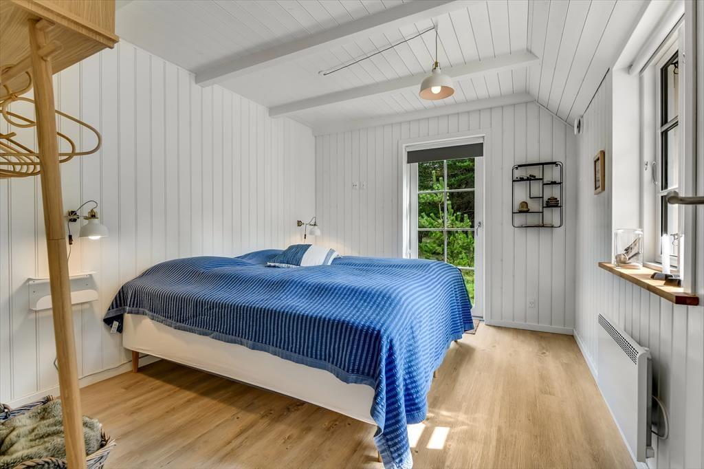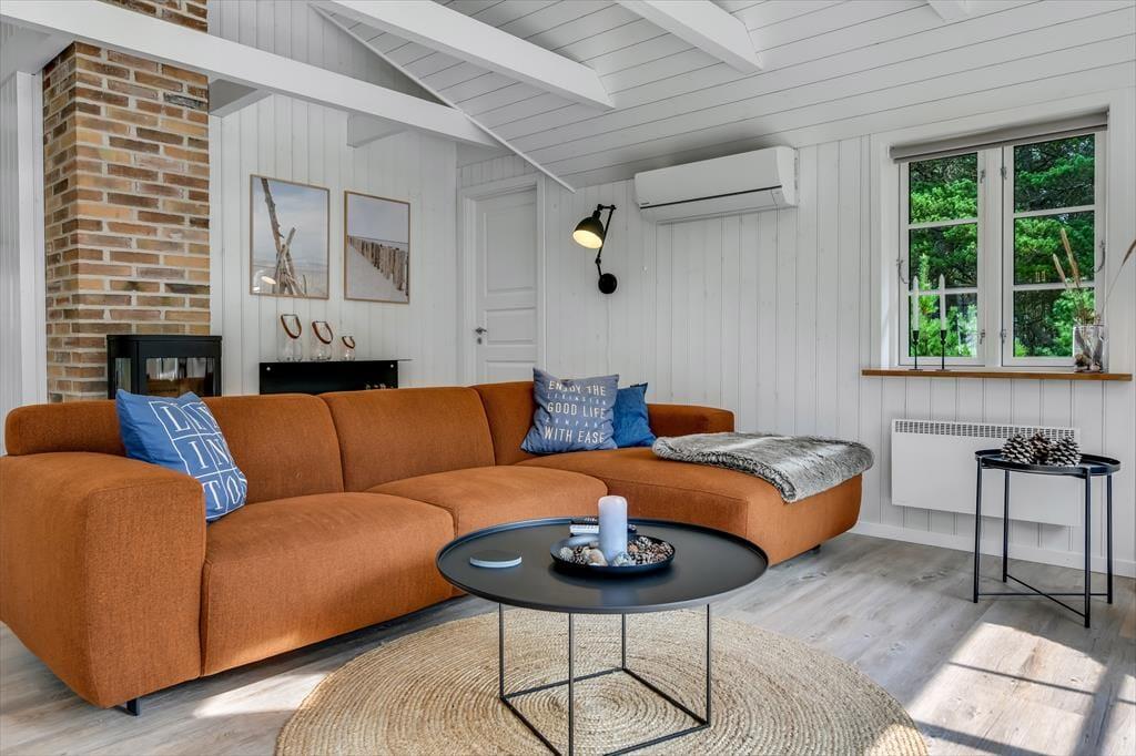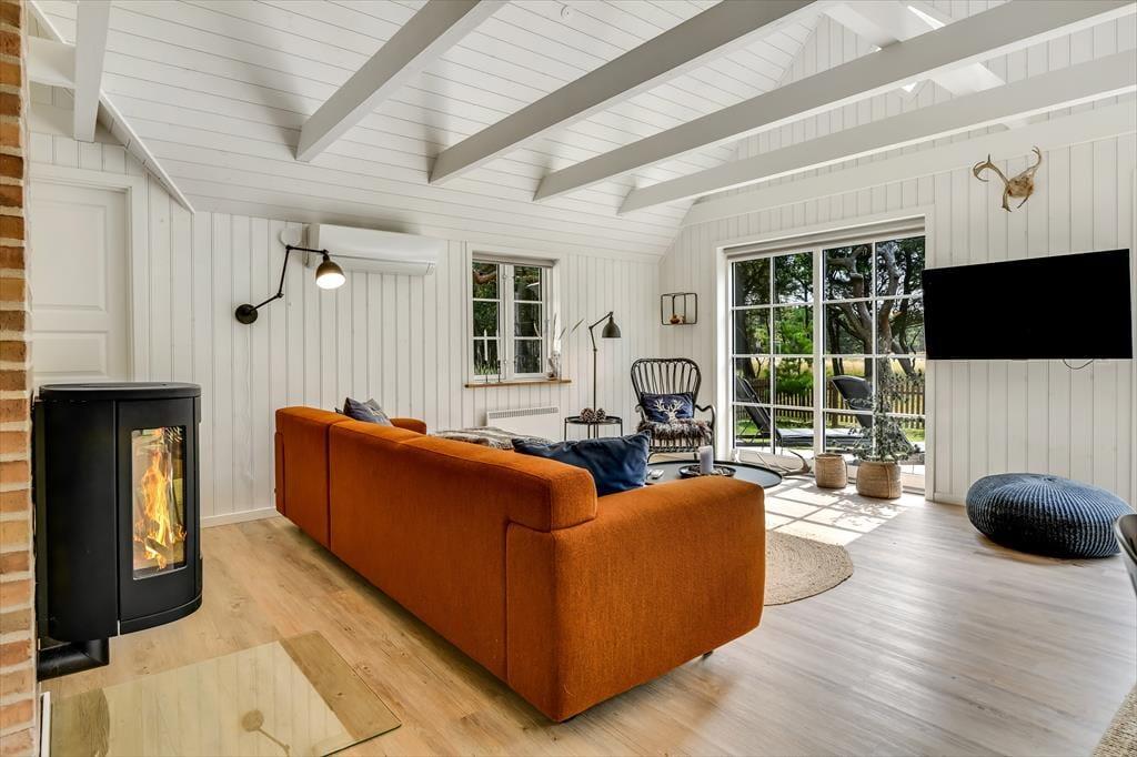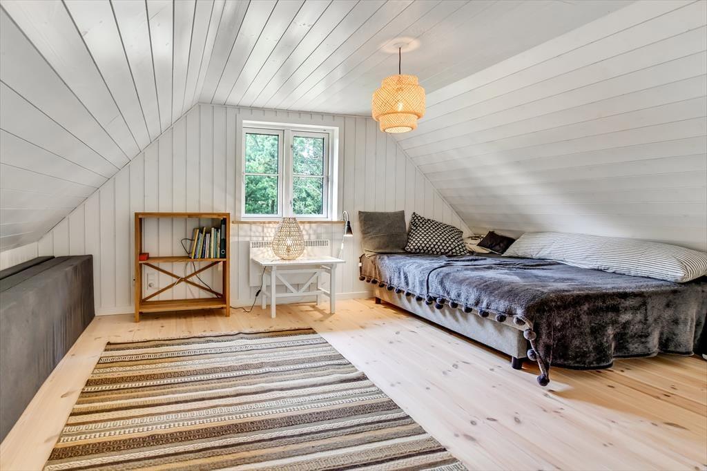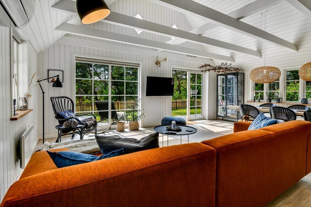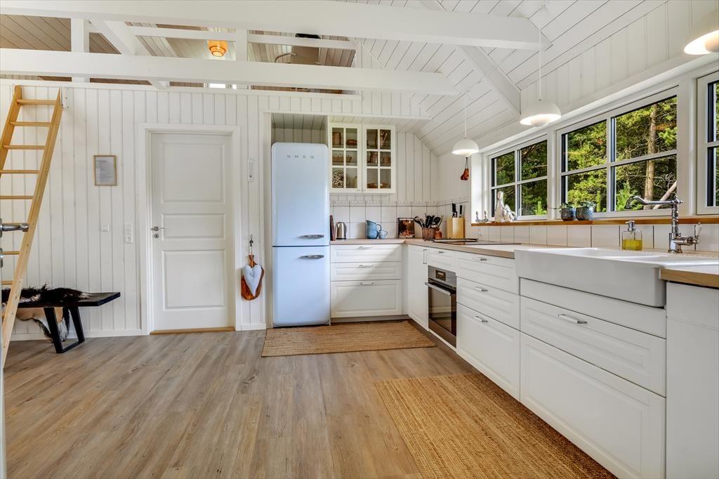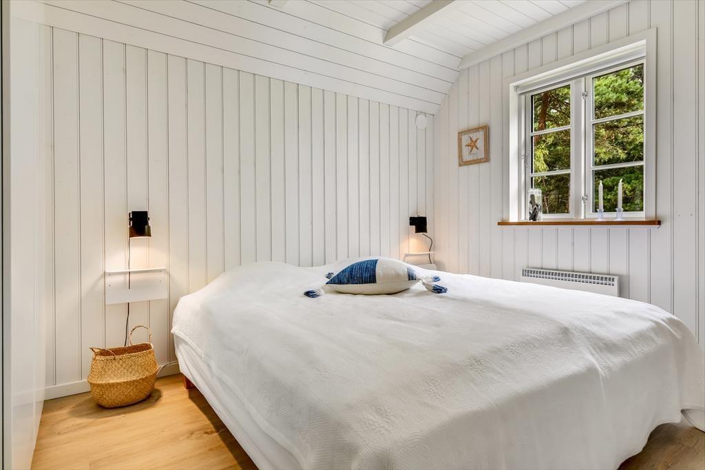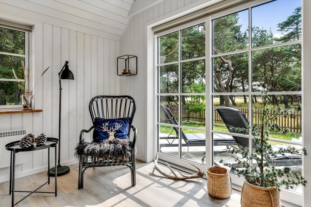Med sit smukke stråtag og sin hvide træfacade er arkitekturen klassisk, men det 133 m2 store sommerhus har nu kun stået her på naturgrunden siden 2015. Inden døre byder indretningen på en velfungerende blanding af det tidsløse og det mere moderne, så du er sikker på at bo komfortabelt og samtidig i særdeles stemningsfulde rammer. Med to lækre badeværelser, tre gode soveværelser og en stor hems med ekstra sovepladser kan du nemt invitere familie eller venner med på ferien – og I kan alle glæde jer til at samles til leg, hygge og afslapning i det flotte opholdsrum. Her er der brændeovn til eventuelle kølige dage og et åbent køkken, hvor I kan trylle alle jeres favoritretter frem, og gennem vinduerne kan I nyde det smukke lysindfald og se lige ud på de naturskønne omgivelser.