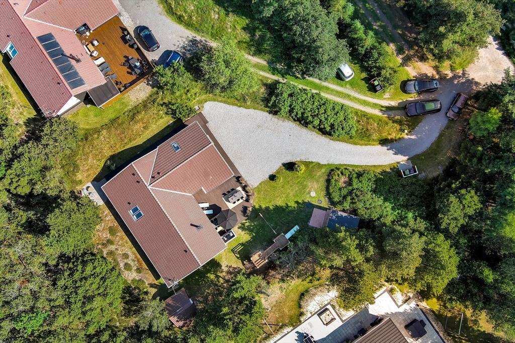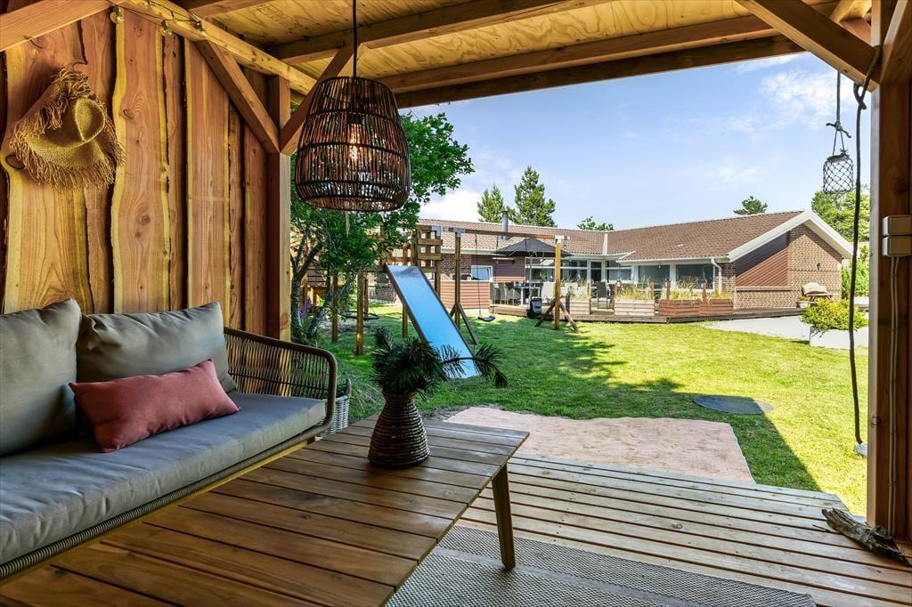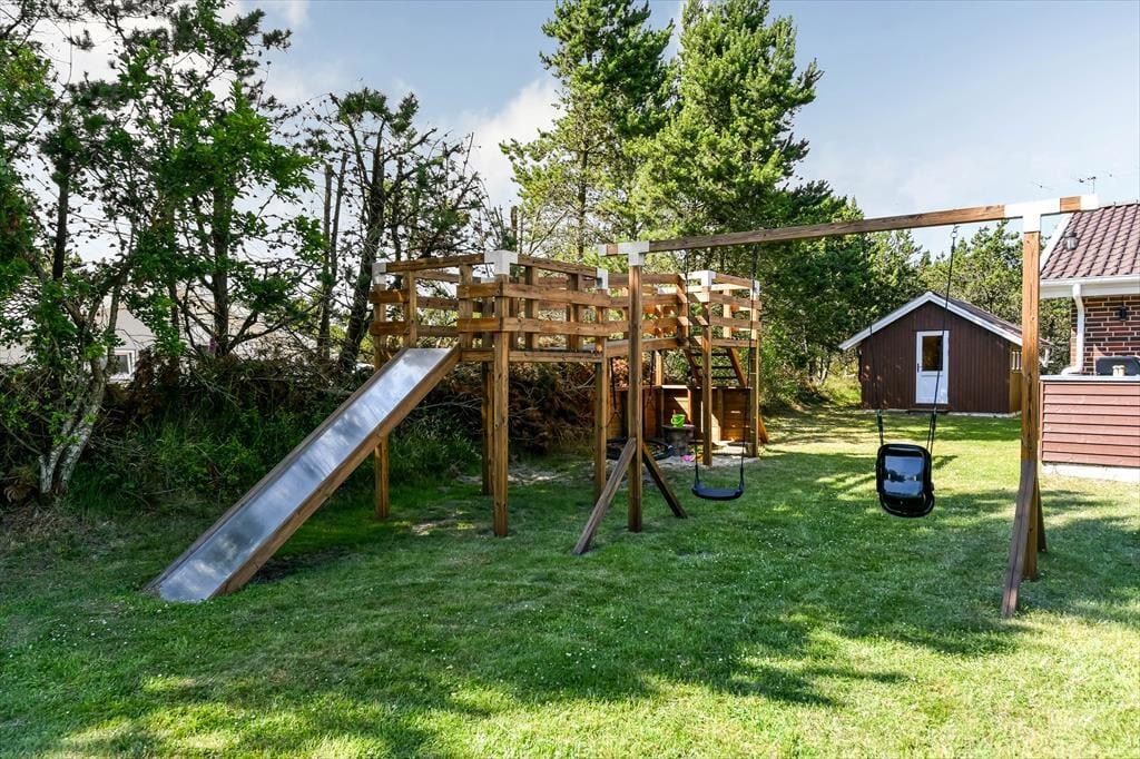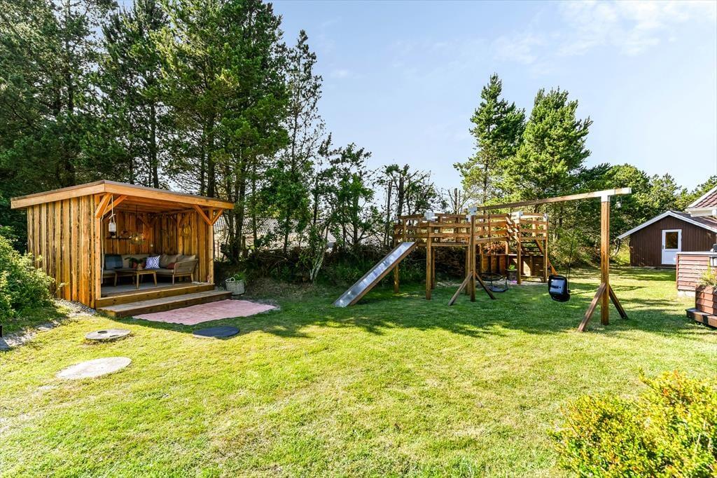 Også ude i det fri er der taget højde for, at både børn og voksne skal have det dejligt. Legetårnet med rutsjebane, gynger og gangbro kan sikkert underholde de yngste i timevis – når hele familien altså ikke leger på græsset eller sidder samlet om et lækkert måltid mad på terrassen. Den smukke træterrasse ligger på praktisk vis lige ved siden af legeområdet og samtidig godt i forhold til solen, og her er der både haveborde og liggestole til alle livsnyderne. På den anden side af huset finder du et mindre terrasseareal, som passer perfekt, hvis du vil sidde med en varm kop kaffe først på dagen, mens huset og de naturskønne omgivelser langsomt vågner.