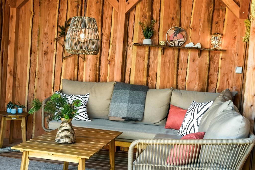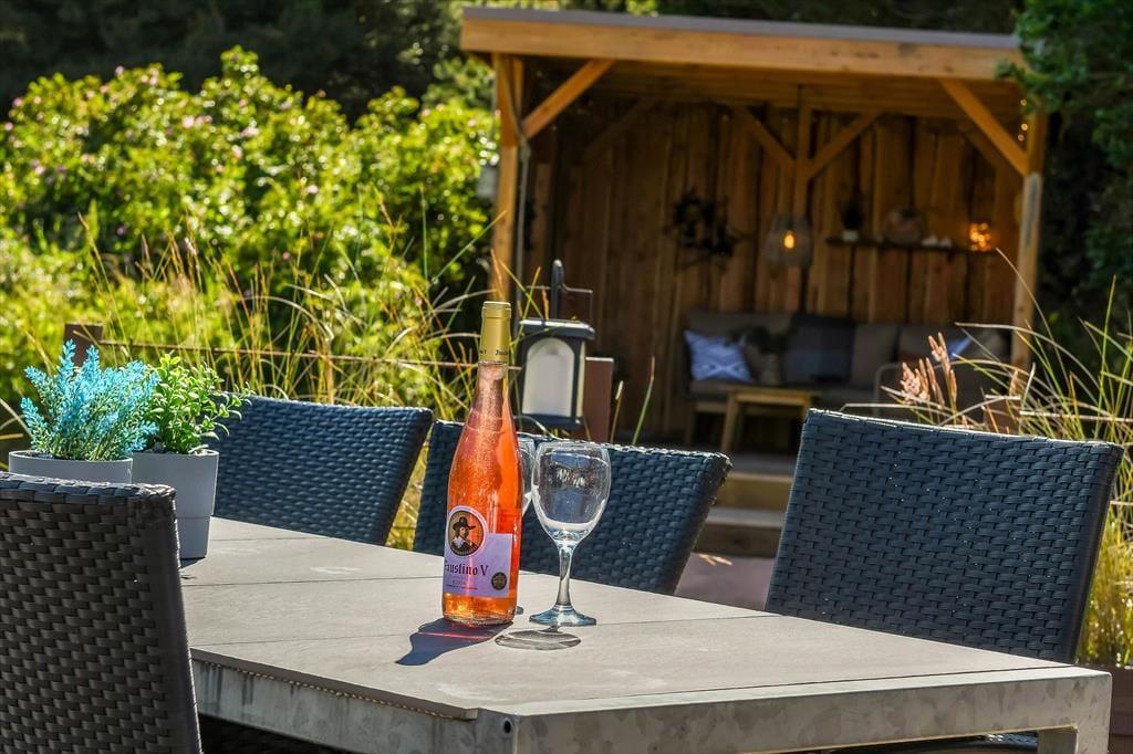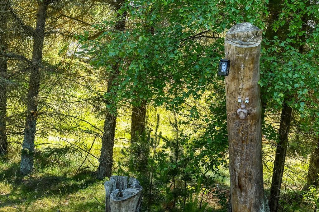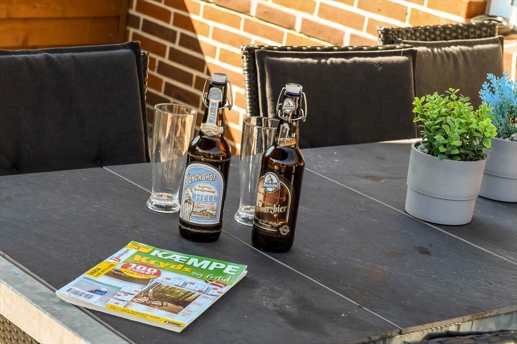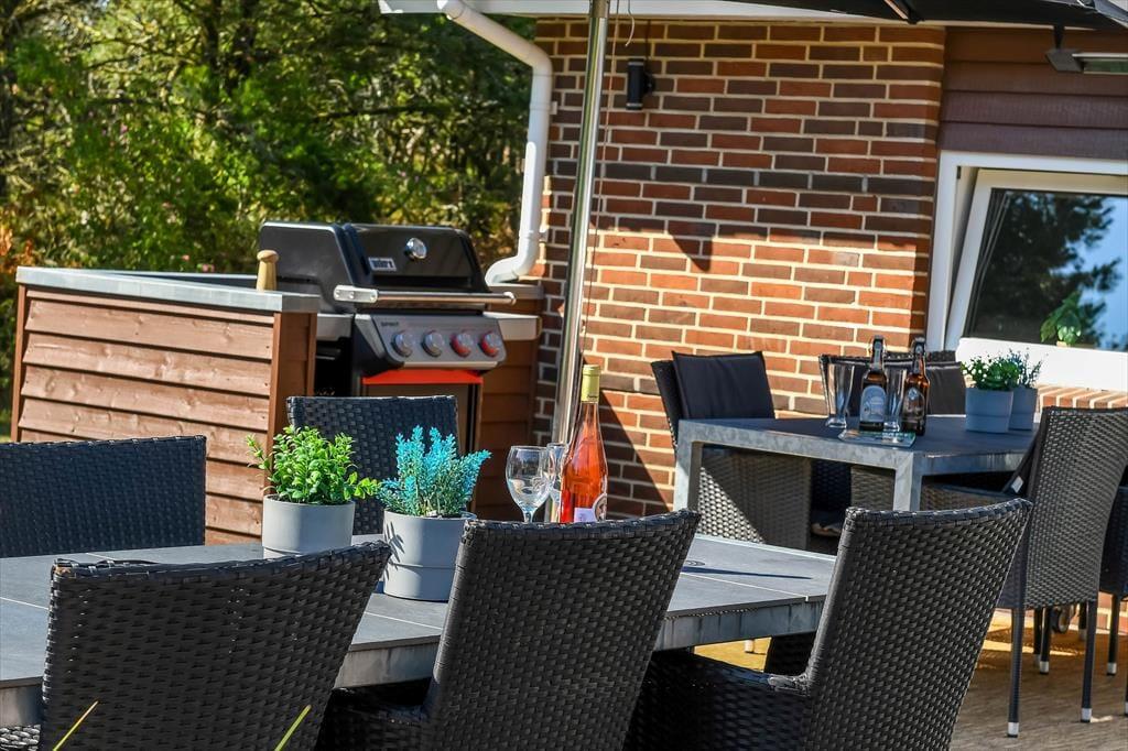 Også ude i det fri er der taget højde for, at både børn og voksne skal have det dejligt. Legetårnet med rutsjebane, gynger og gangbro kan sikkert underholde de yngste i timevis – når hele familien altså ikke leger på græsset eller sidder samlet om et lækkert måltid mad på terrassen. Den smukke træterrasse ligger på praktisk vis lige ved siden af legeområdet og samtidig godt i forhold til solen, og her er der både haveborde og liggestole til alle livsnyderne. På den anden side af huset finder du et mindre terrasseareal, som passer perfekt, hvis du vil sidde med en varm kop kaffe først på dagen, mens huset og de naturskønne omgivelser langsomt vågner.