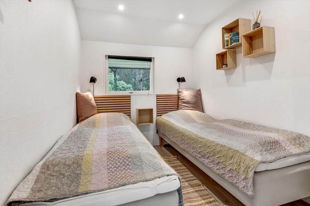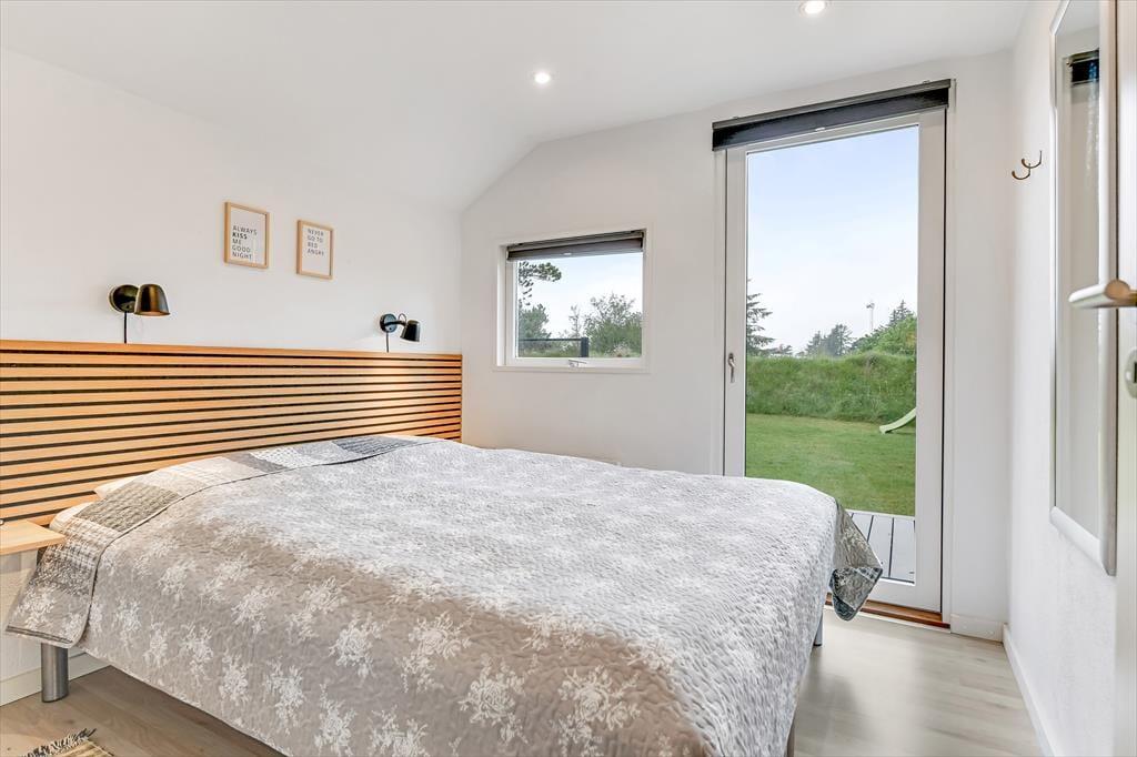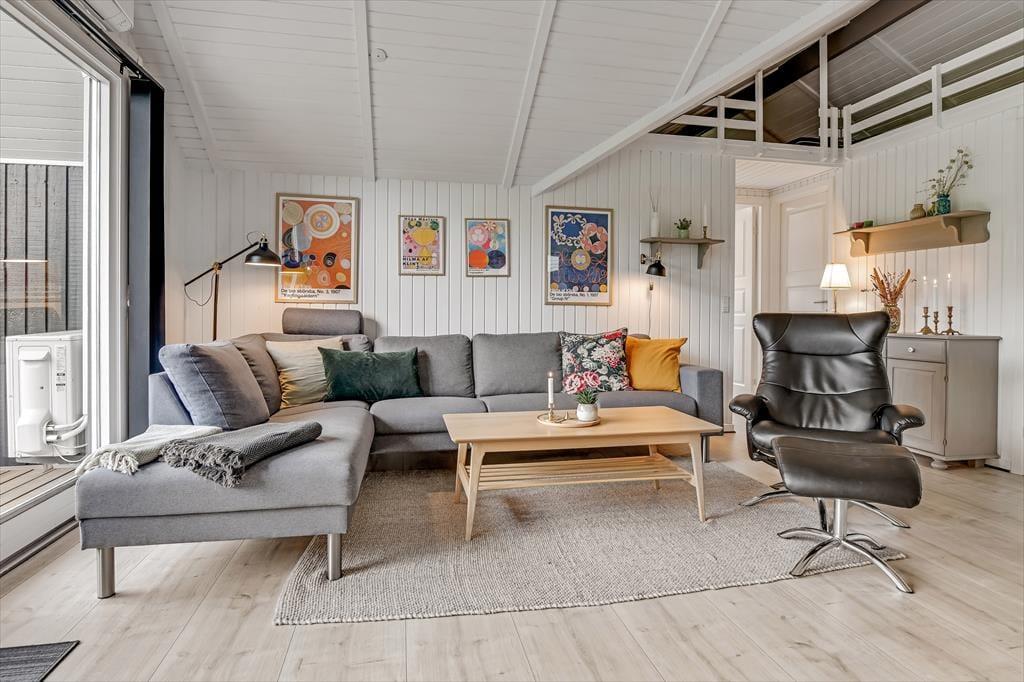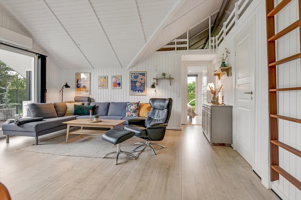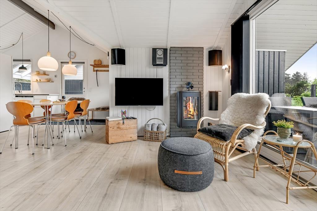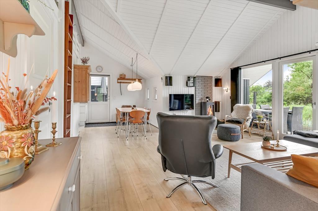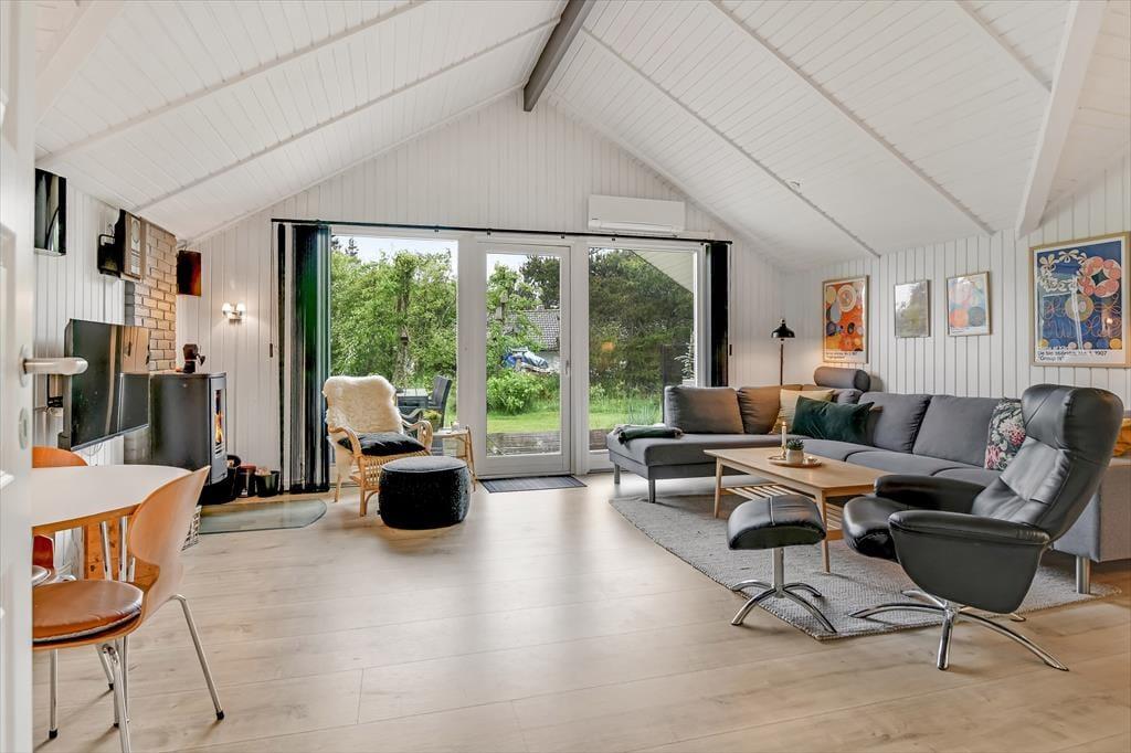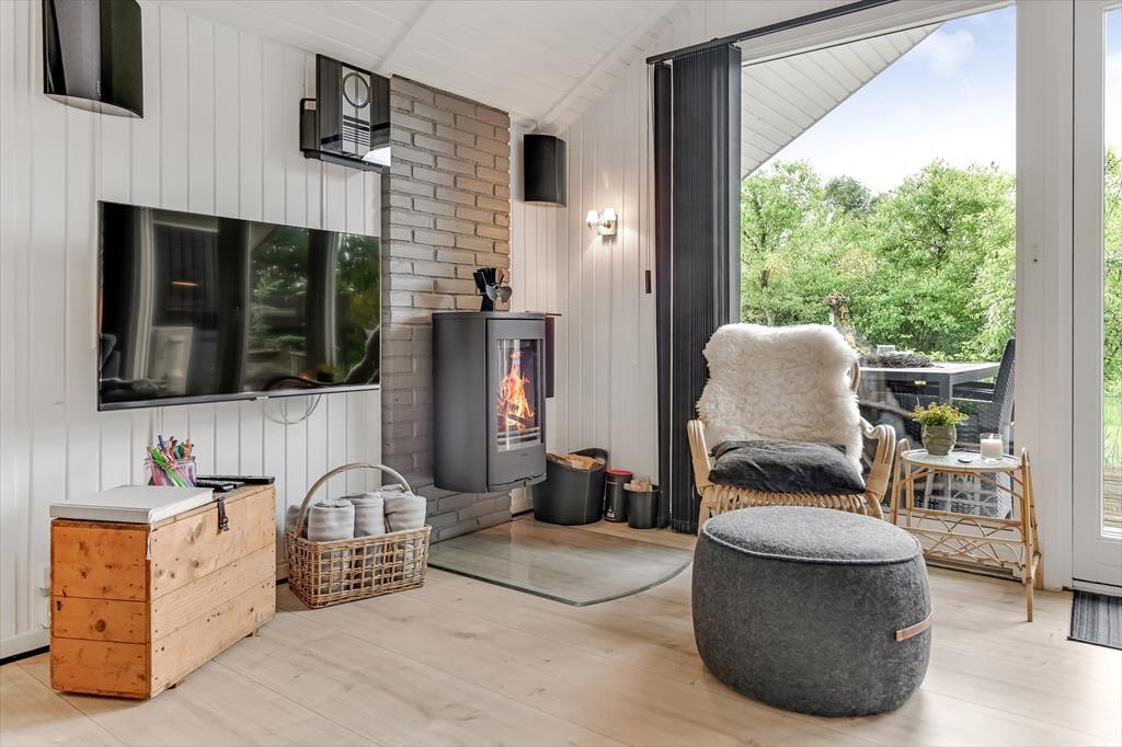 Indenfor møder du et sommerhus, der kombinerer hyggelig charme med moderne komfort. De dejlige soveværelser inviterer til afslapning og gode nætter med søvn, mens de fælles opholdsrum byder på rig mulighed for samvær. Stuen med brændeovn bliver hurtigt familiens foretrukne samlingspunkt, hvor I kan hygge jer med brætspil eller en god film på de kølige aftener. Køkkenet er lyst og veludstyret, så du nemt kan tilberede feriens måltider, mens du stadig kan være en del af selskabet.
