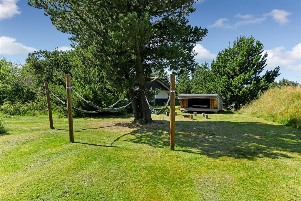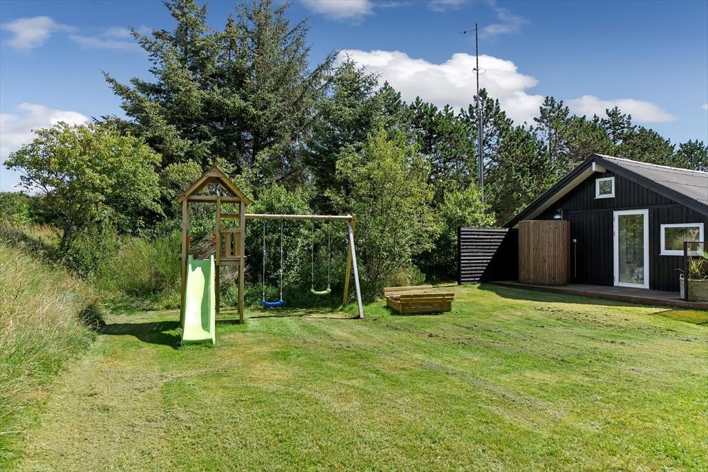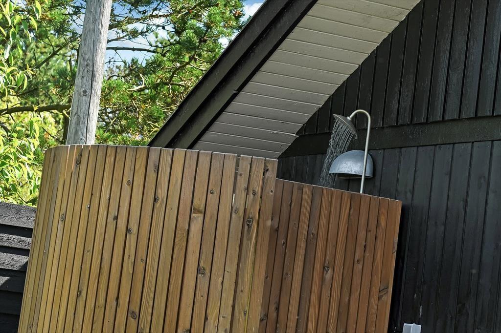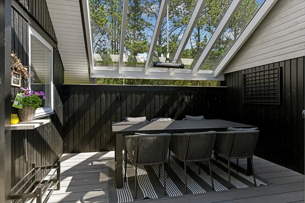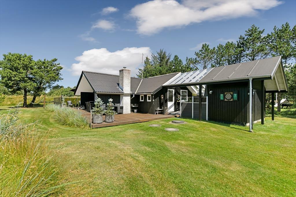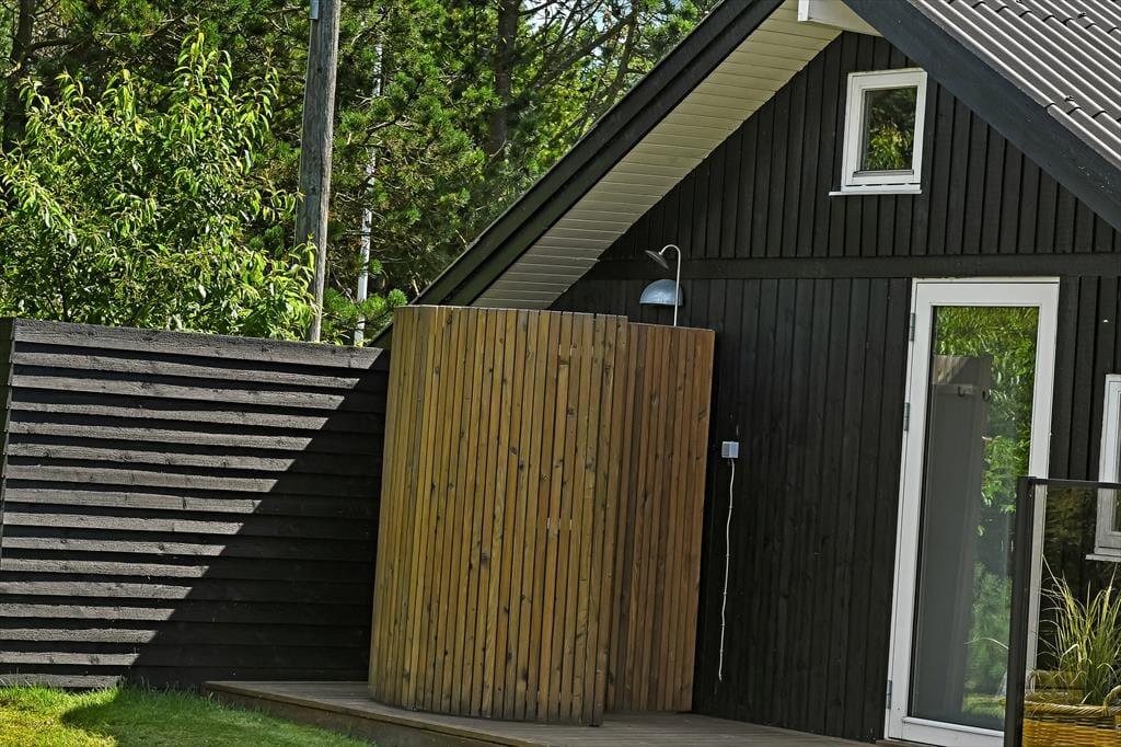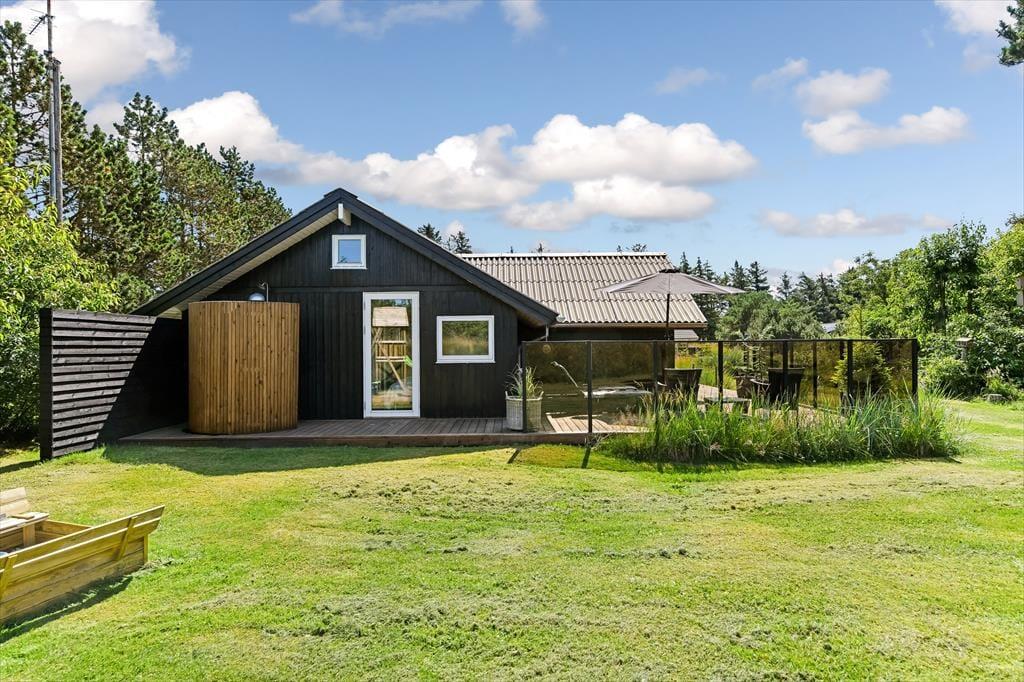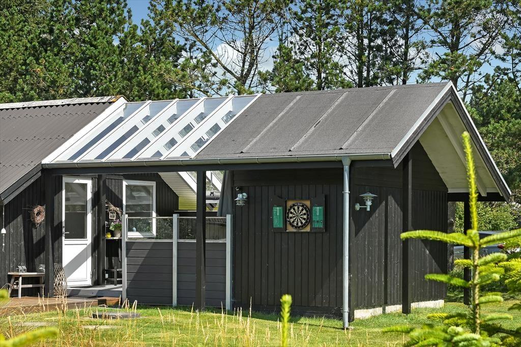 Udenfor er sommerhuset omgivet af en stor grund, der giver rig mulighed for leg og udendørs aktiviteter. Her kan børnene løbe frit omkring, spille bold eller måske endda bygge en lille hule i skovens skygge. Terrassen, som løber rundt om huset, er perfekt til solbadning og afslapning, mens den overdækkede terrasse gør det muligt at nyde udendørslivet uanset vejret. Her kan du sidde hele dagen med en god bog, nyde måltiderne i det fri eller bare lytte til naturens lyde. Når solen går ned, og duggen falder, kan du stadig sidde behageligt udenfor og nyde den friske luft.