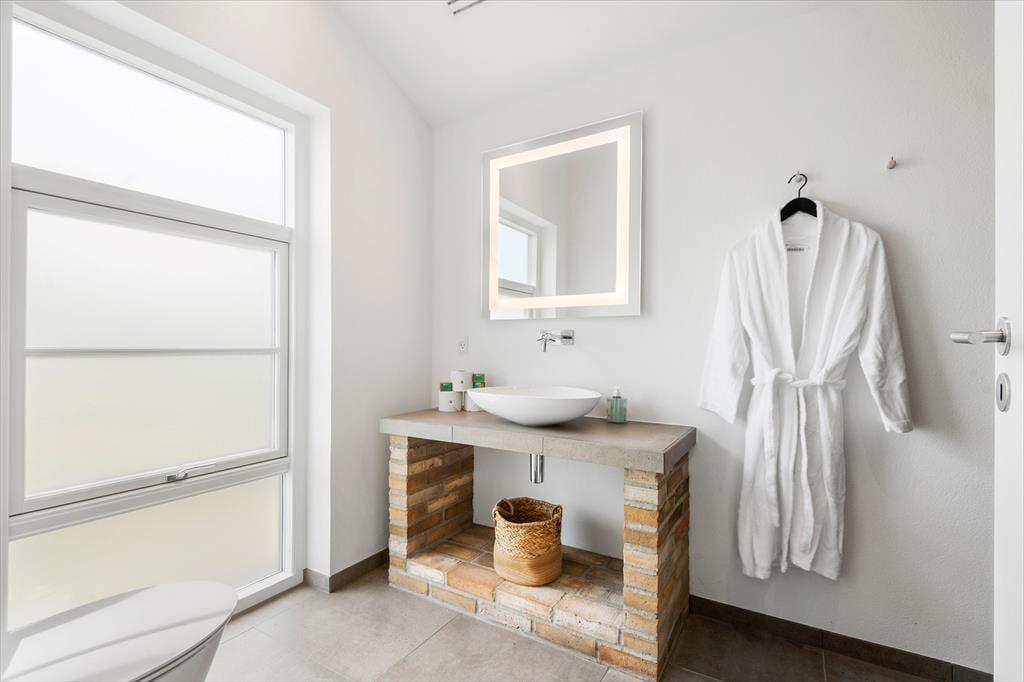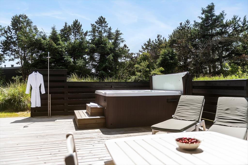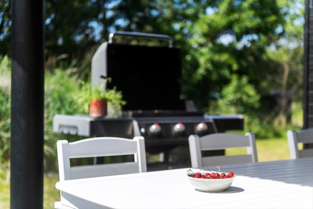 Sommerhusets terrasse er indbydende med en dejlig, og er samtidig perfekt til at slikke sol eller nyde en kølig drink. Der er indrettet flere siddegrupper, og på de lune sommeraftener kan du tænde op i grillen og tilberede et lækkert måltid, som kan nydes under åben himmel. Haven er omkranset af grøn beplantning, hvilket sikrer privatliv og ro. Når du har brug for en pause fra solen, kan du slappe af i en af havens hyggelige kroge, hvor du kan høre fuglene kvidre og mærke en let brise fra Vesterhavet.