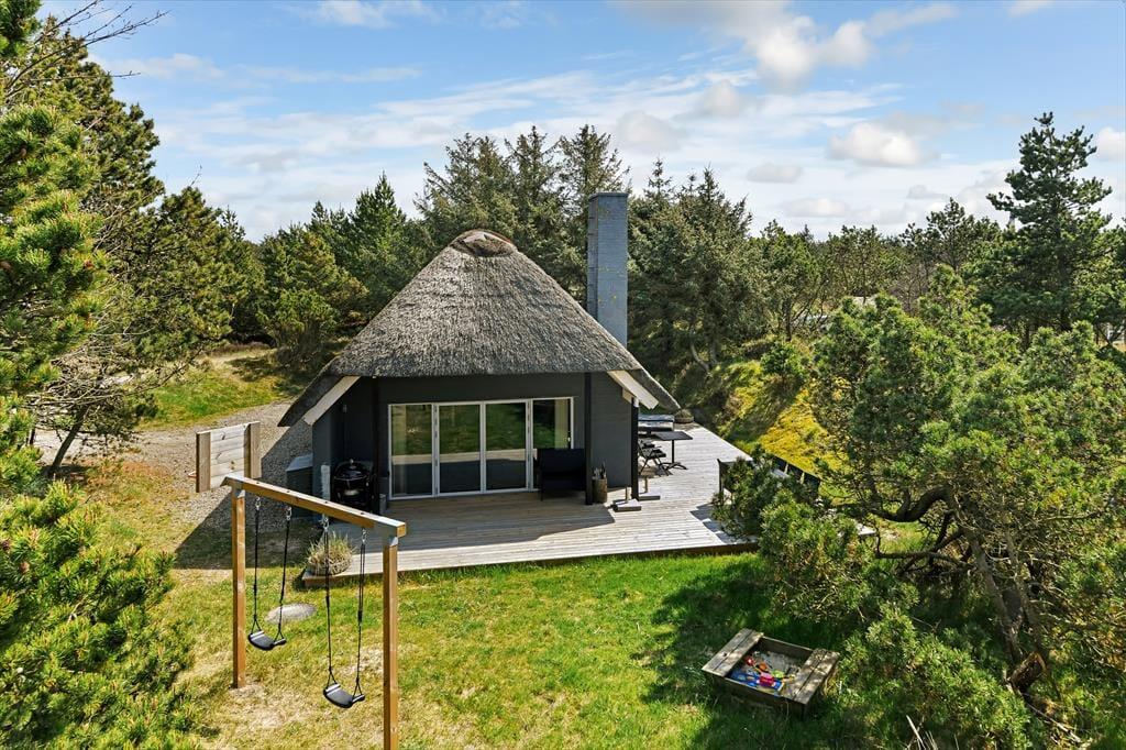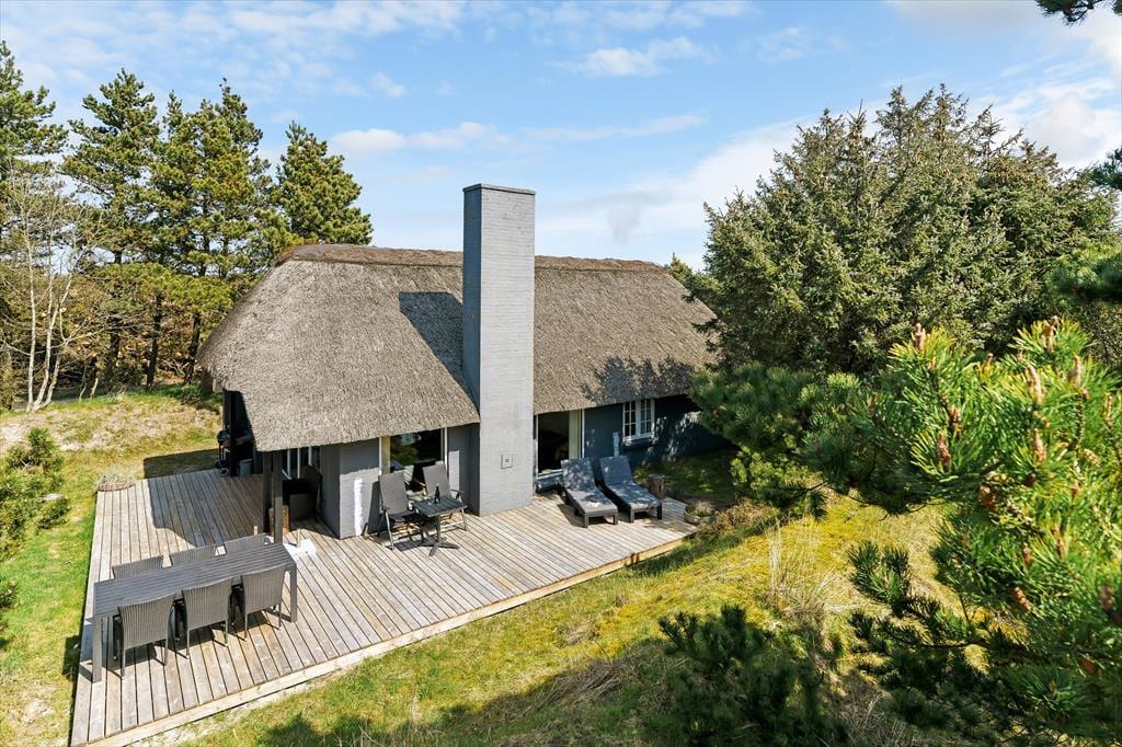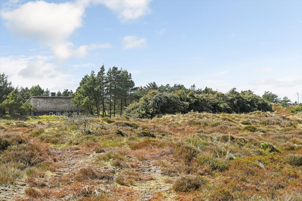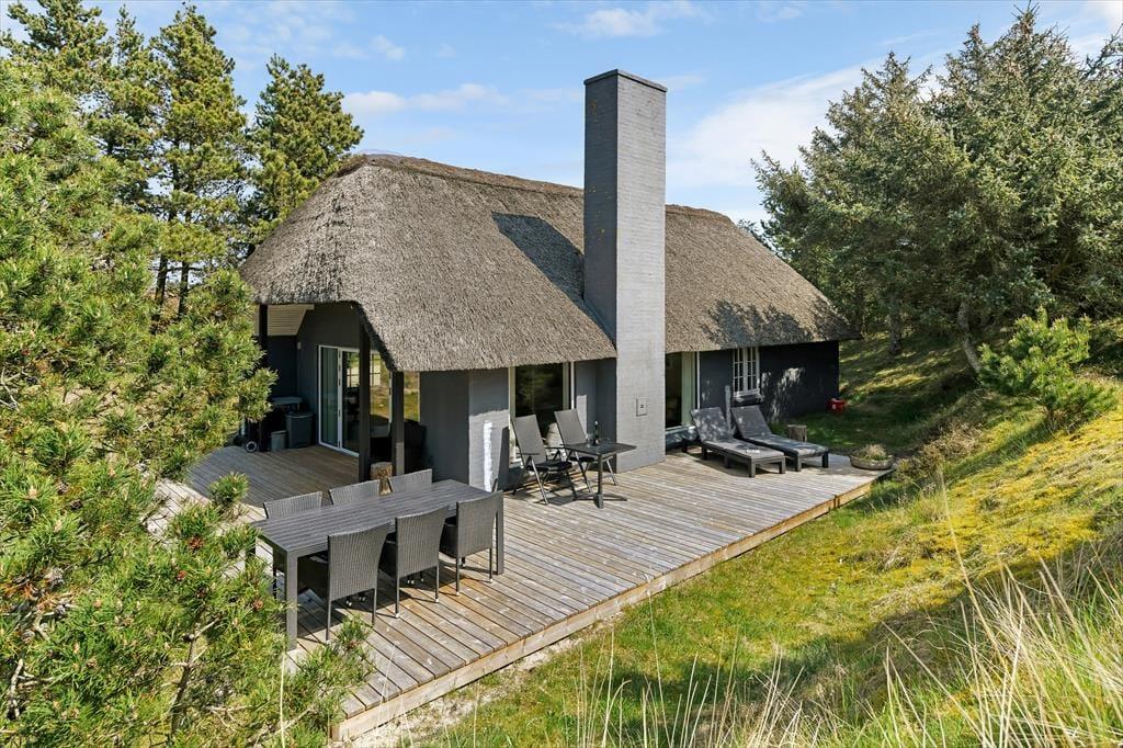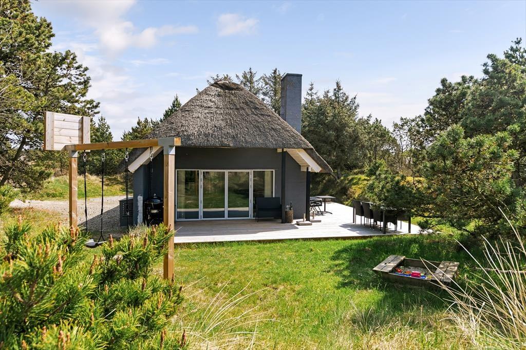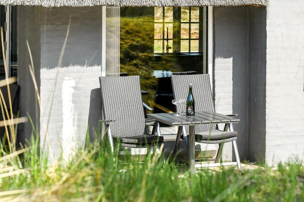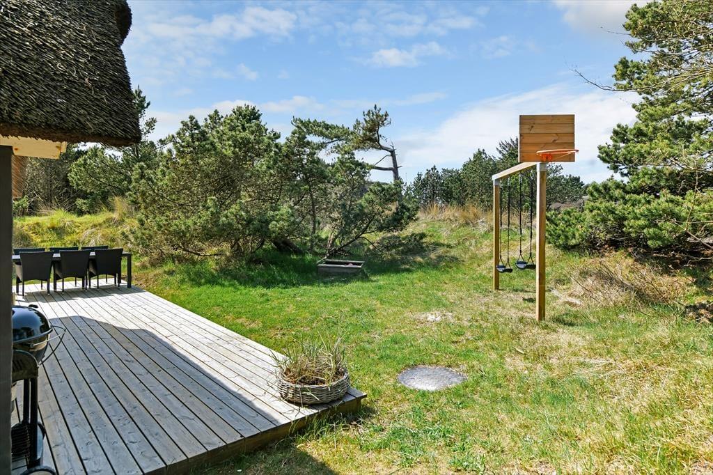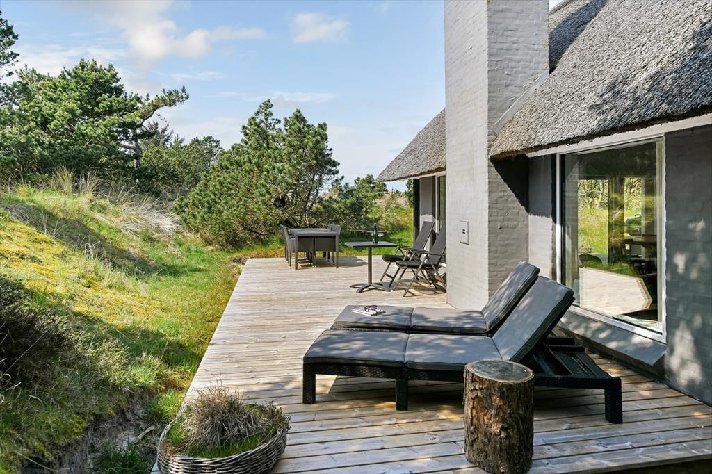 Udenfor fortsætter feriestemningen på bedste vis. Sommerhuset er placeret i en gryde, der gør, man føler sig helt alene - kun omgivet af en flot naturgrund, hvor lyng og marehalm vugger blidt i vinden, og det fredelige område gør det nemt at koble helt af. På den store træterrasse kan du nyde solen i fulde drag – måske med en bog i hånden og en kop kaffe inden for rækkevidde. Her kan du nyde en lækker middag under åben himmel, f.eks. grille de friske råvarer fra lokalområdet eller bare læne dig tilbage og lade lydene af naturen fylde ørene. Terrassen er både hyggelig og funktionel – et oplagt sted at tilbringe mange af feriens timer, uanset om solen skinner fra en blå himmel, eller du sidder i læ med et tæppe omkring dig og mærker den friske vestjyske luft.