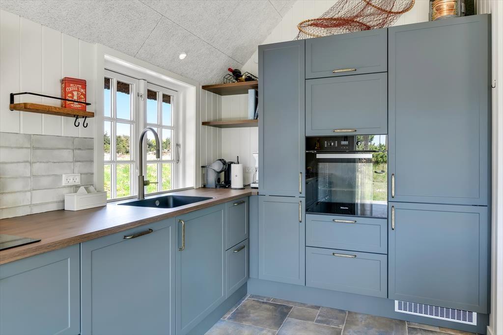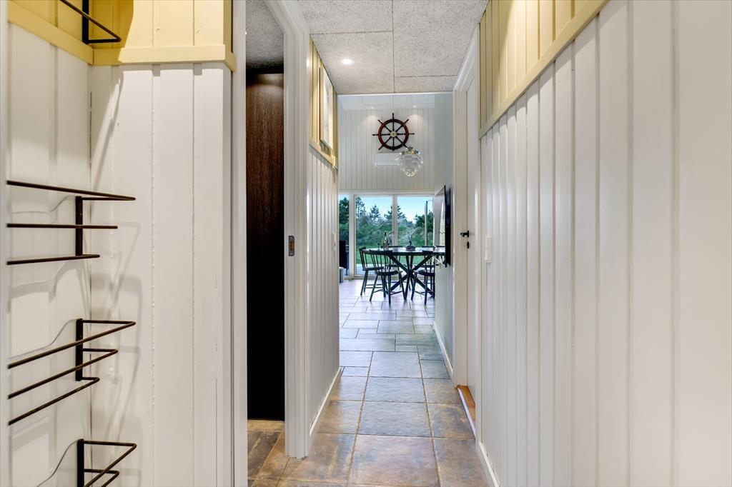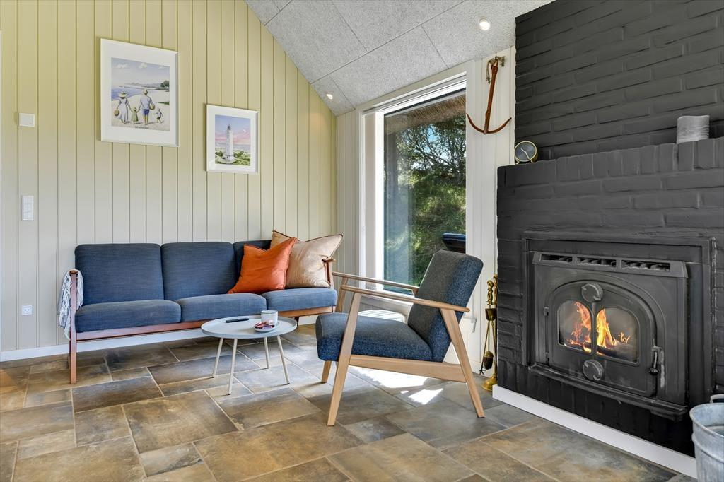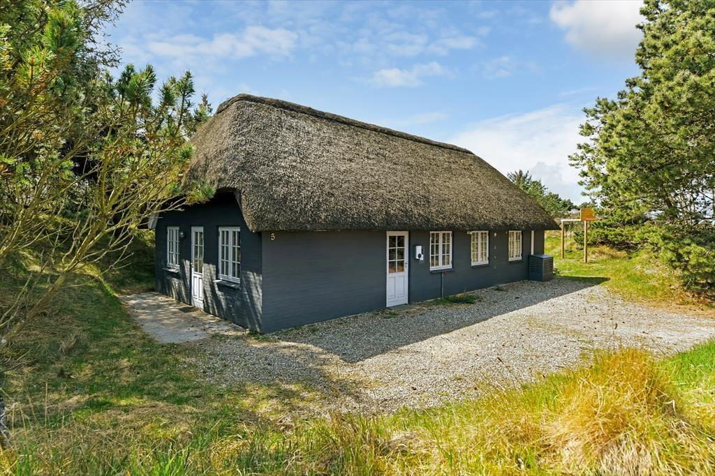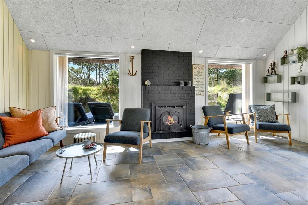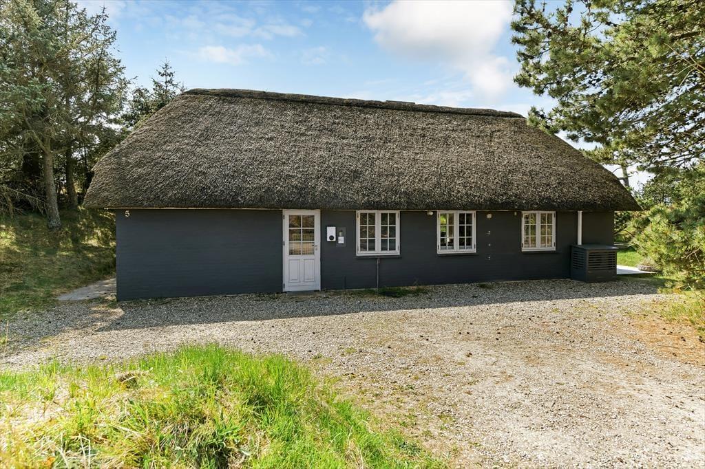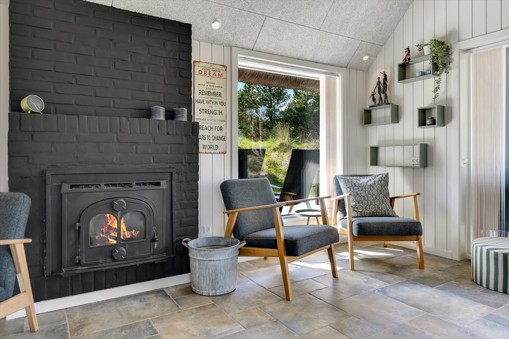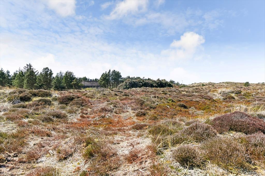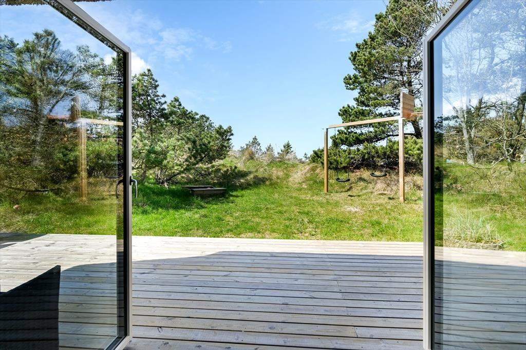 Udenfor fortsætter feriestemningen på bedste vis. Sommerhuset er placeret i en gryde, der gør, man føler sig helt alene - kun omgivet af en flot naturgrund, hvor lyng og marehalm vugger blidt i vinden, og det fredelige område gør det nemt at koble helt af. På den store træterrasse kan du nyde solen i fulde drag – måske med en bog i hånden og en kop kaffe inden for rækkevidde. Her kan du nyde en lækker middag under åben himmel, f.eks. grille de friske råvarer fra lokalområdet eller bare læne dig tilbage og lade lydene af naturen fylde ørene. Terrassen er både hyggelig og funktionel – et oplagt sted at tilbringe mange af feriens timer, uanset om solen skinner fra en blå himmel, eller du sidder i læ med et tæppe omkring dig og mærker den friske vestjyske luft.