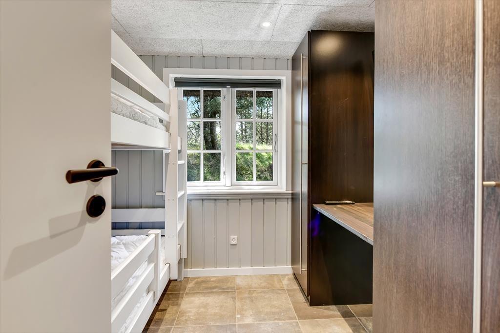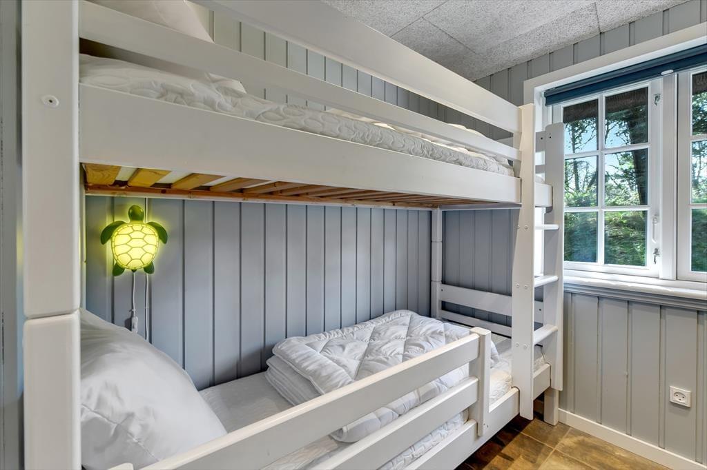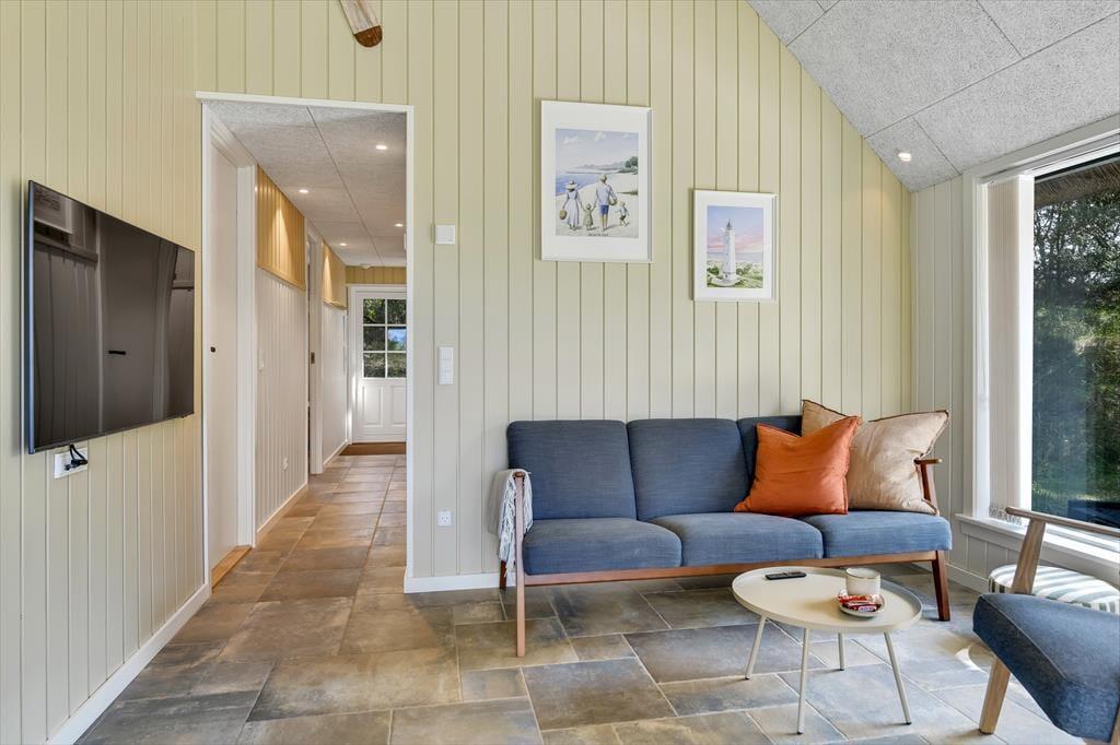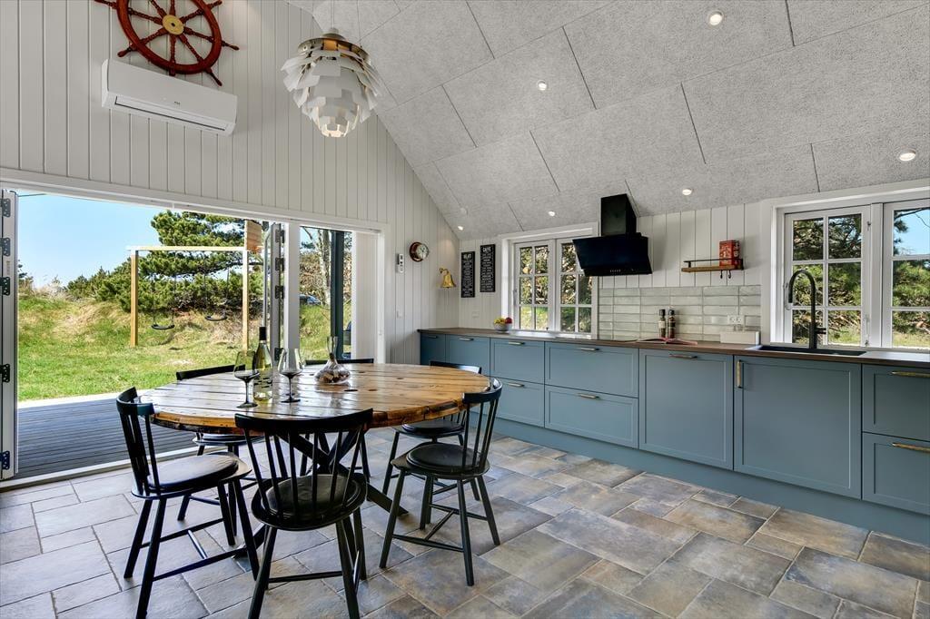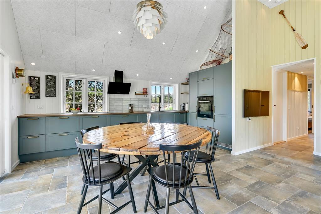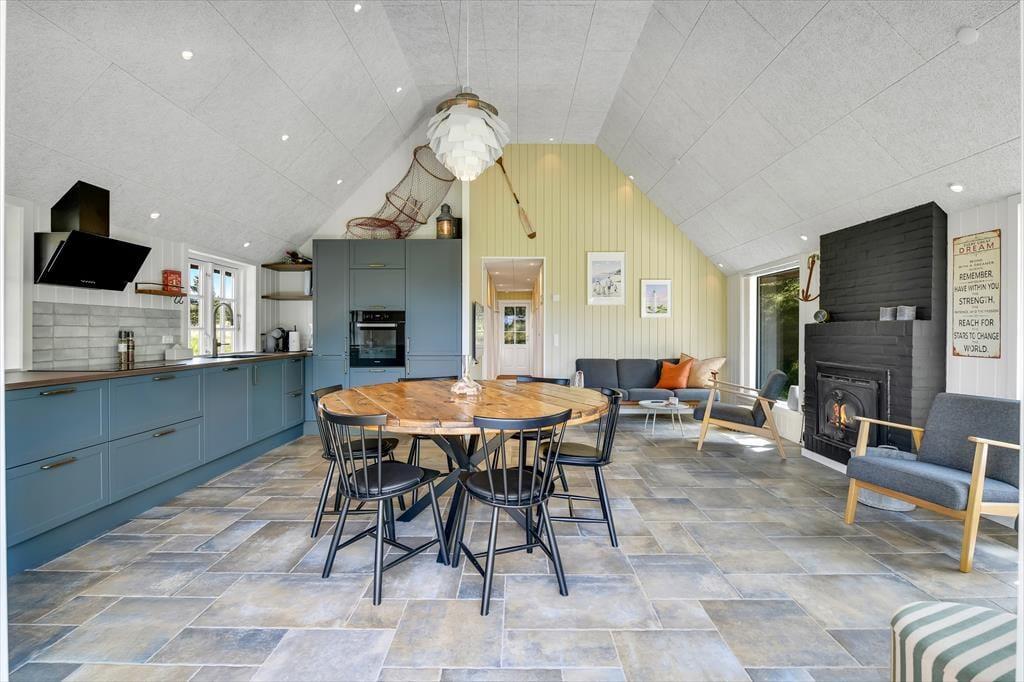 Der er lagt op til ægte sommerhusstemning, når ferien går til Nordslugen 5. Det første, der møder dig, er det lyse og åbne opholdsrum, hvor køkken, spiseplads og stue er samlet i ét – et dejligt samlingspunkt for både hverdagens gøremål og feriens hyggestunder. Mens nogen laver mad, kan andre spille spil ved spisebordet, læse i sofaen eller bare nyde hinandens selskab. Rummene har en afslappet atmosfære, hvor man hurtigt føler sig hjemme, og de store vinduer lukker masser af dagslys ind, og hvis du slår terrassedørene op, er du næsten ét med naturen udenfor, selv når du er inde. Der er god plads til at finde sig til rette og lade roen falde på – for det er præcis, hvad huset inviterer til.