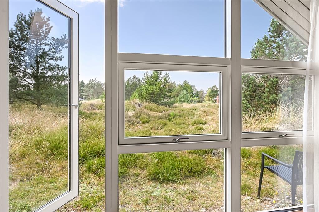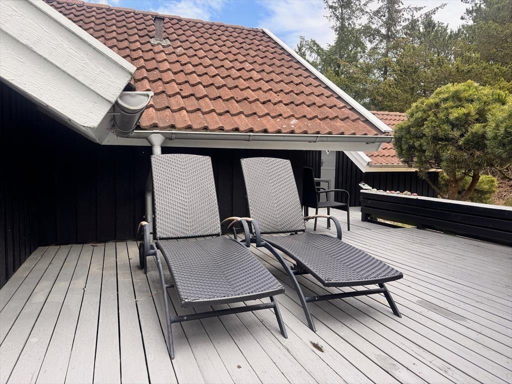 Udenfor fortsætter den hyggelige stemning på den store terrasse, som fordeler sig rundt om en stor del af huset. Her kan du vælge mellem sol og skygge dagen igennem – måske starter du morgenen med kaffe på østterrassen, nyder en god frokost i læ midt på dagen og runder af med grillmiddag og aftensol på den sydvendte terrasse. Udsigten til de grønne omgivelser og det omkringliggende hedelandskab skaber en særlig ro, som gør det let at finde ferieglæden frem. Du hører fuglene synge i træerne, mærker vinden i håret og kan nyde duften af naturen, der skifter karakter fra morgen til aften. Når børnene leger på naturgrunden, kan de voksne finde sig til rette i havestolene med en bog, et brætspil eller blot roen. Der er kort sagt skabt rum til både aktivitet og afslapning i det fri.