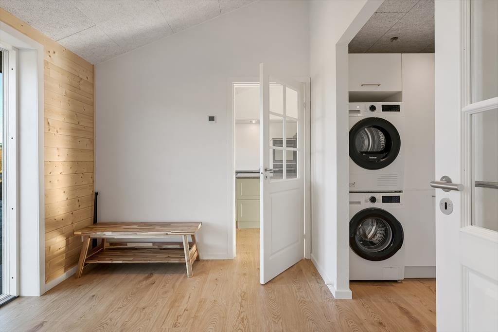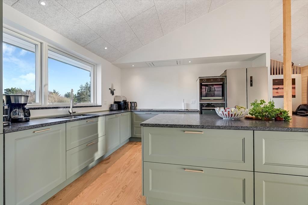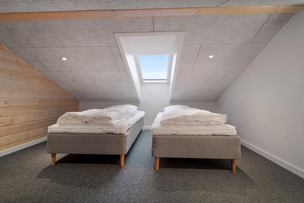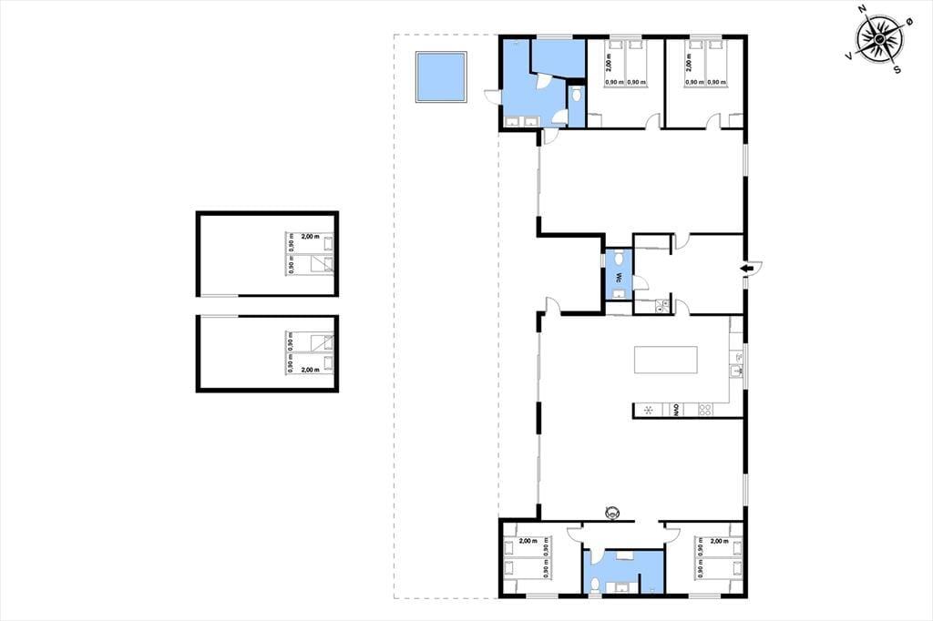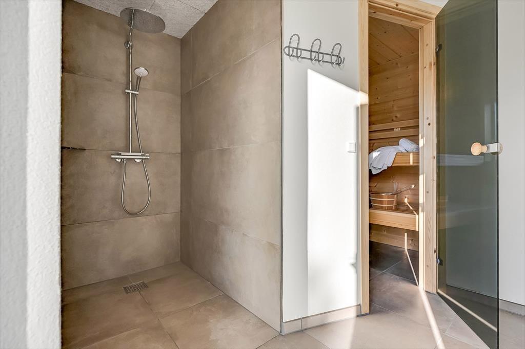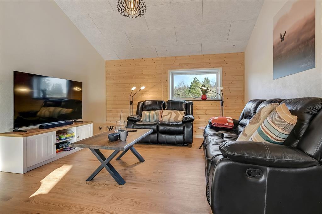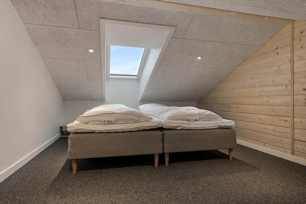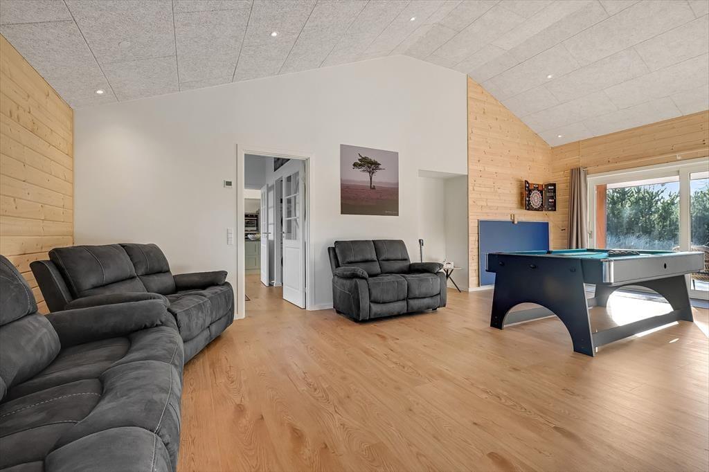 Indenfor mødes du af et stilrent og indbydende sommerhus, hvor rummelighed og kvalitet går hånd i hånd. Det store køkken-alrum er husets naturlige samlingspunkt, og her er der god plads til, at hele familien kan være sammen – uanset om der laves mad, dækkes op til fælles måltider eller hygges med spil og samtaler ved spisebordet. De store vinduespartier lukker dagslyset ind og skaber en behagelig atmosfære, der understreger fornemmelsen af luft og ro. Sommerhuset rummer hele fire store værelser med dobbeltsenge, og derudover finder du to hemse med dobbeltseng, som giver ekstra fleksibilitet og gør huset ideelt til flere generationer eller større familier. Wellnessafdelingen er noget helt særligt: Her kan du nyde varmen i saunaen og fortsætte afslapningen med direkte udgang til det udendørs spabad – perfekt efter en dag i den friske vestjyske luft. Og når konkurrencegenet melder sig, står aktivitetsrummet klar til timevis af sjov og venskabelige dyste.