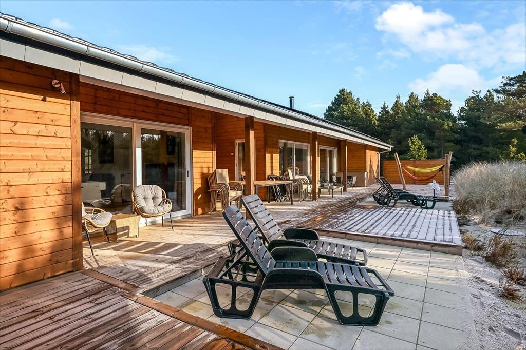 Udelivet får fremragende betingelser på Vesterballevej 16. Fra køkken-alrummet er der direkte udgang til en overdækket terrasse, hvor du kan nyde måltider og kaffepauser i læ for vind og vejr. Terrassen indbyder til lange sommeraftener med grill, latter og gode samtaler, mens solen langsomt går ned over Ho. Haven giver plads til leg, afslapning og stille stunder, hvor du kan læne dig tilbage i en havestol og lytte til fuglenes kvidren. Det udendørs spabad bliver hurtigt et populært samlingspunkt, hvor du kan synke ned i det varme vand og lade skuldrene falde helt ned – måske under stjernehimlen på en klar aften. Her er der tænkt på både ro og samvær, så udelivet kan nydes i netop det tempo, ferien kalder på.