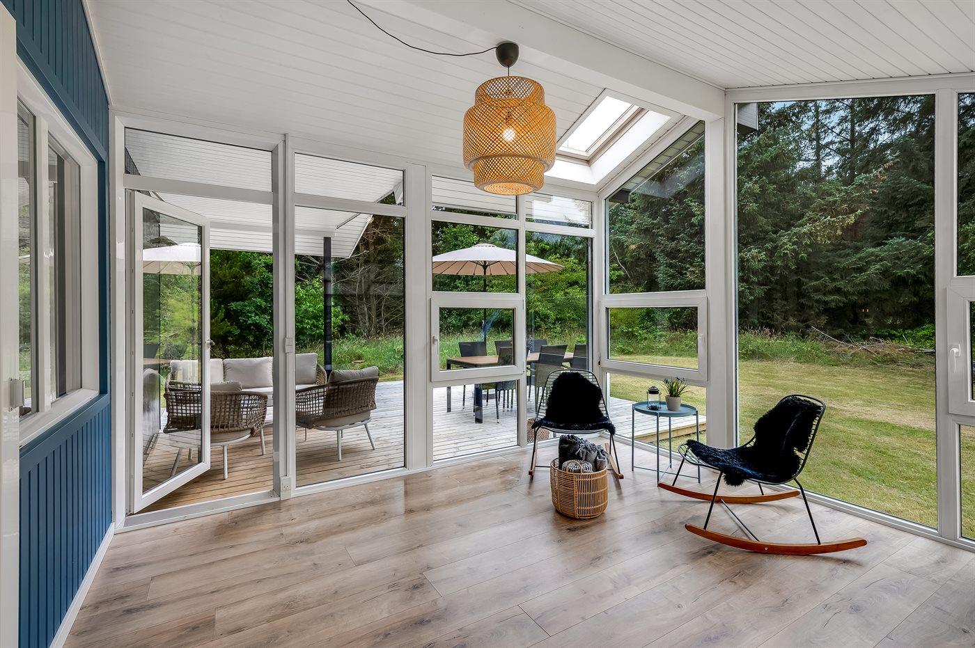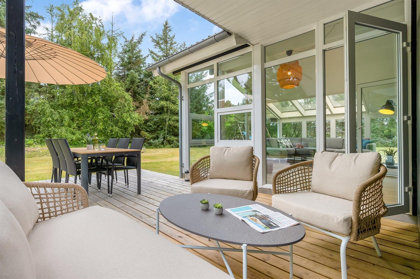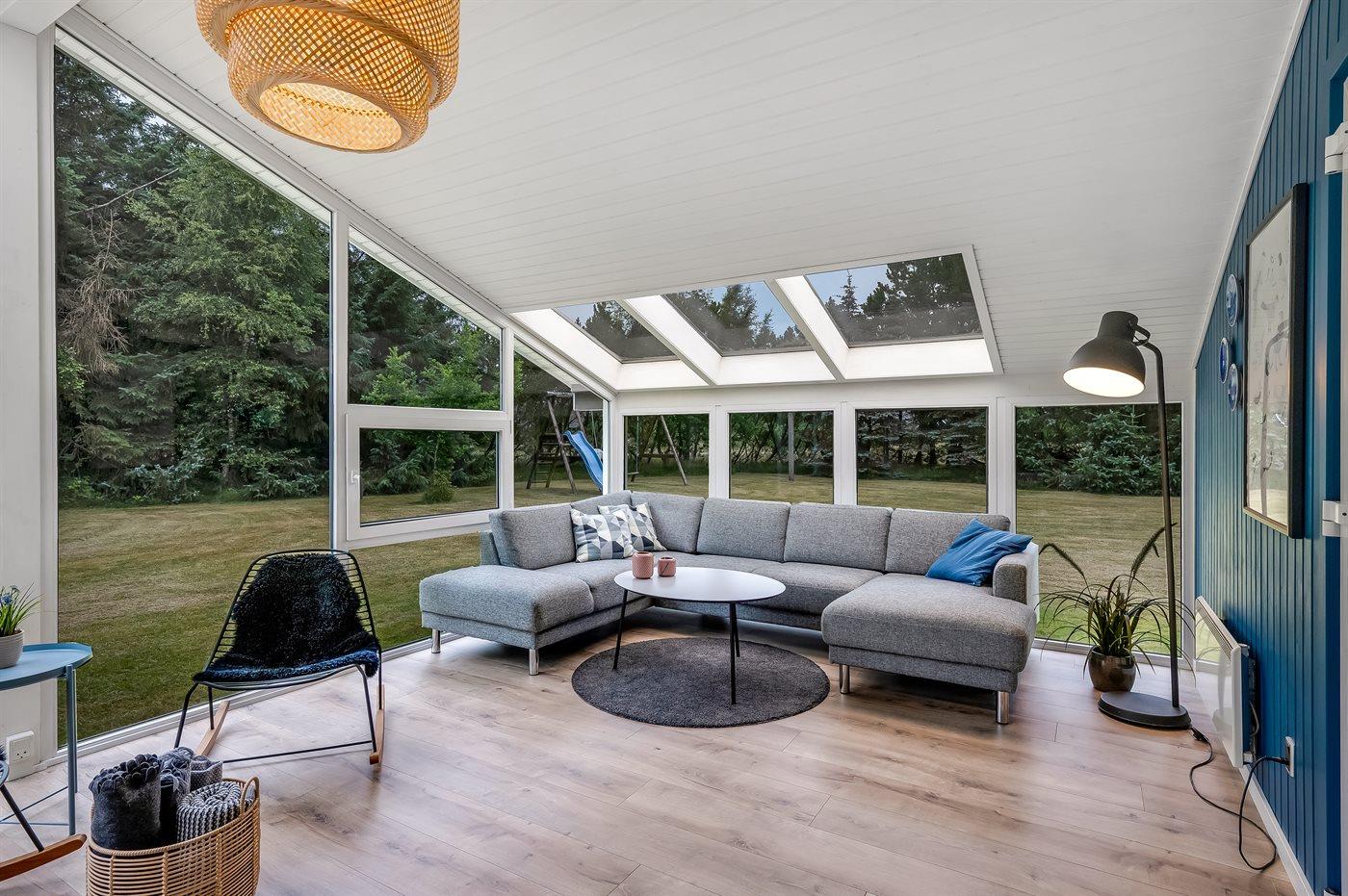 Et flot sommerhus med en pragtfuld udestue beliggende på en meget stor og velplejet grund med plads til leg og boldspil.
