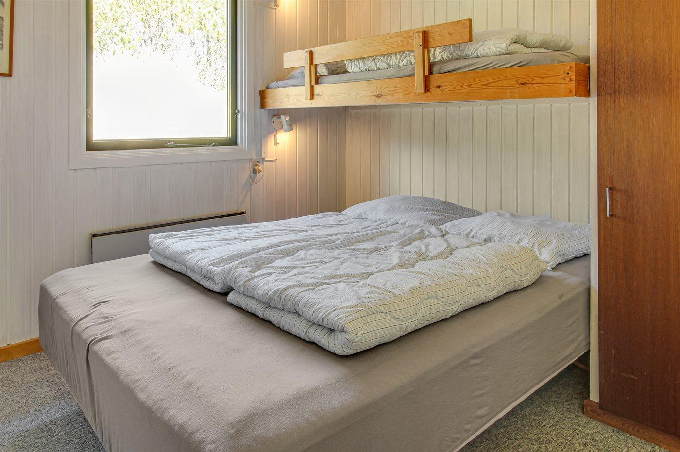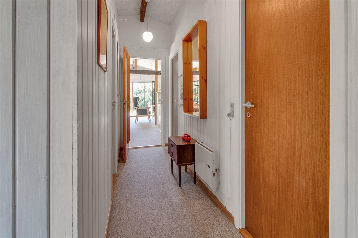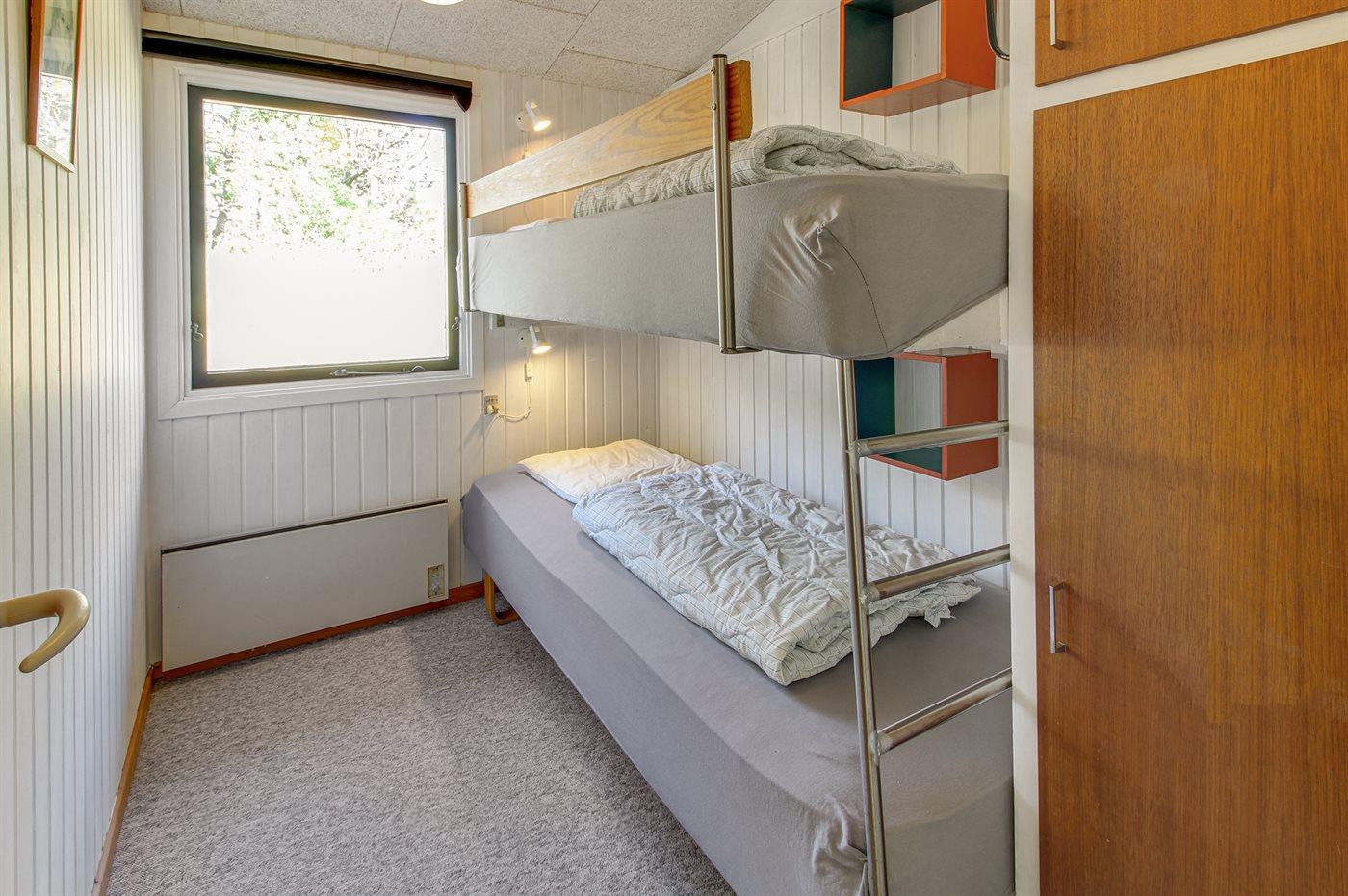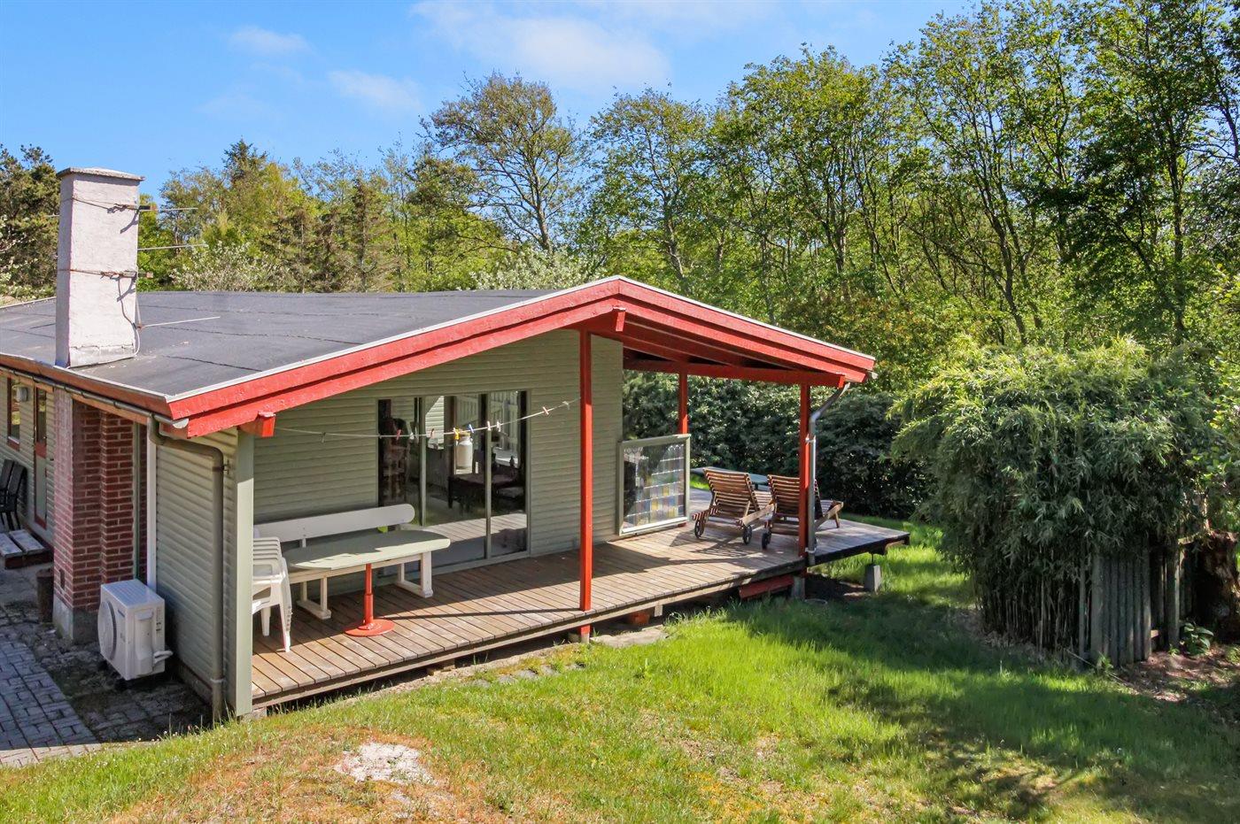 Velholdt sommerhus i træ, bygget i 1971, beliggende på en kuperet naturgrund med fyrretræer og lyng. Såvel åben som overdækket terrasse med havemøbler. Gulvene er belagt med tæpper. Væggene og lofterne er i træ. Synlige loftsbjælker. Badeværelse med bruser og flisegulv. Køkkenet er bl. a. udstyret med mikrobølgeovn. Opholdsstuen indeholder brændeovn, radio samt TV med parabol (digital). Husets sovepladser fordeler sig på 2 værelser med dobbeltseng og 1 med 1 enkeltseng samt køjeseng. Et hyggeligt sommerhus, hvortil der desuden hører carport.