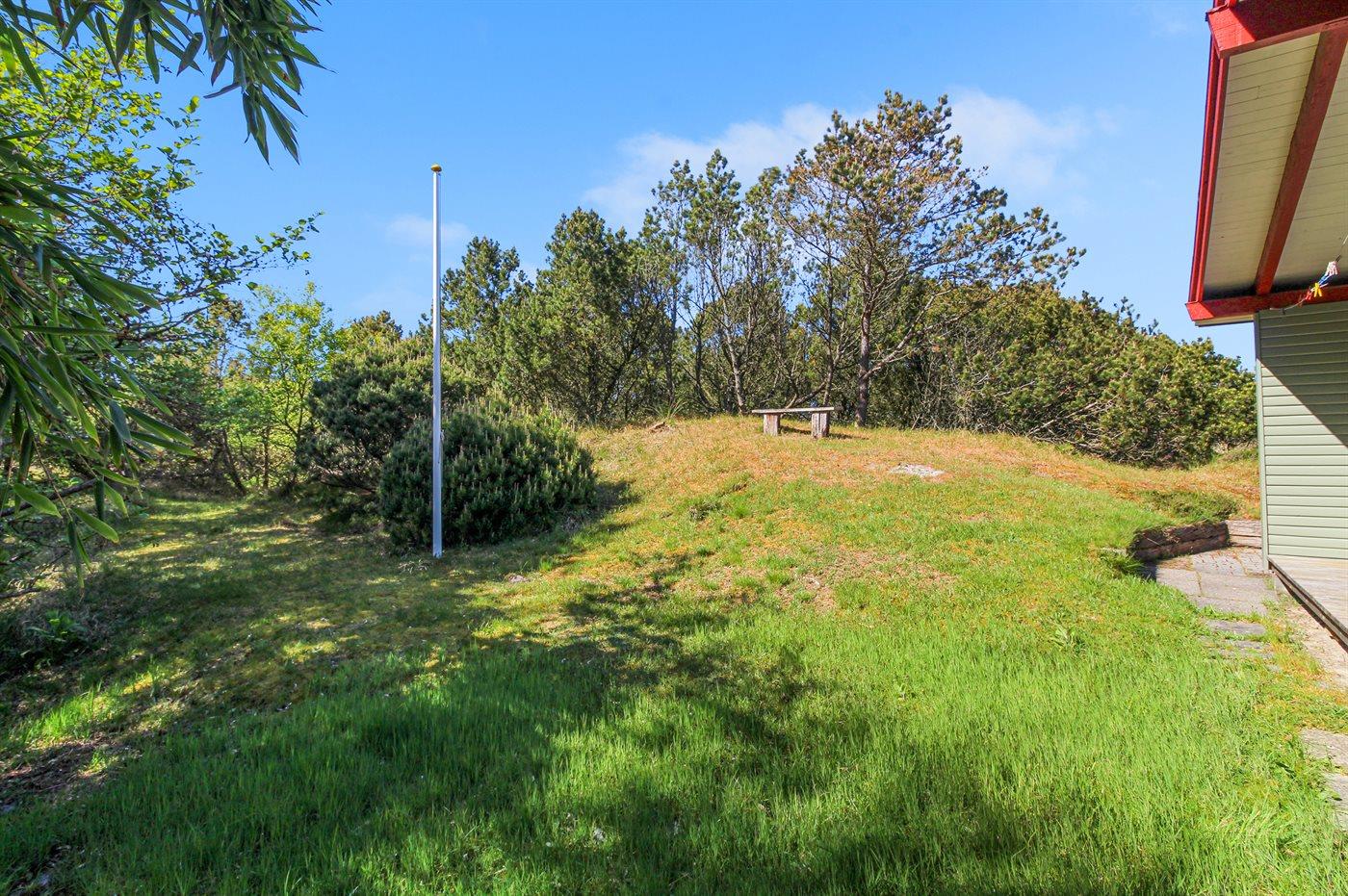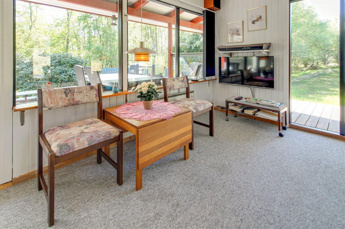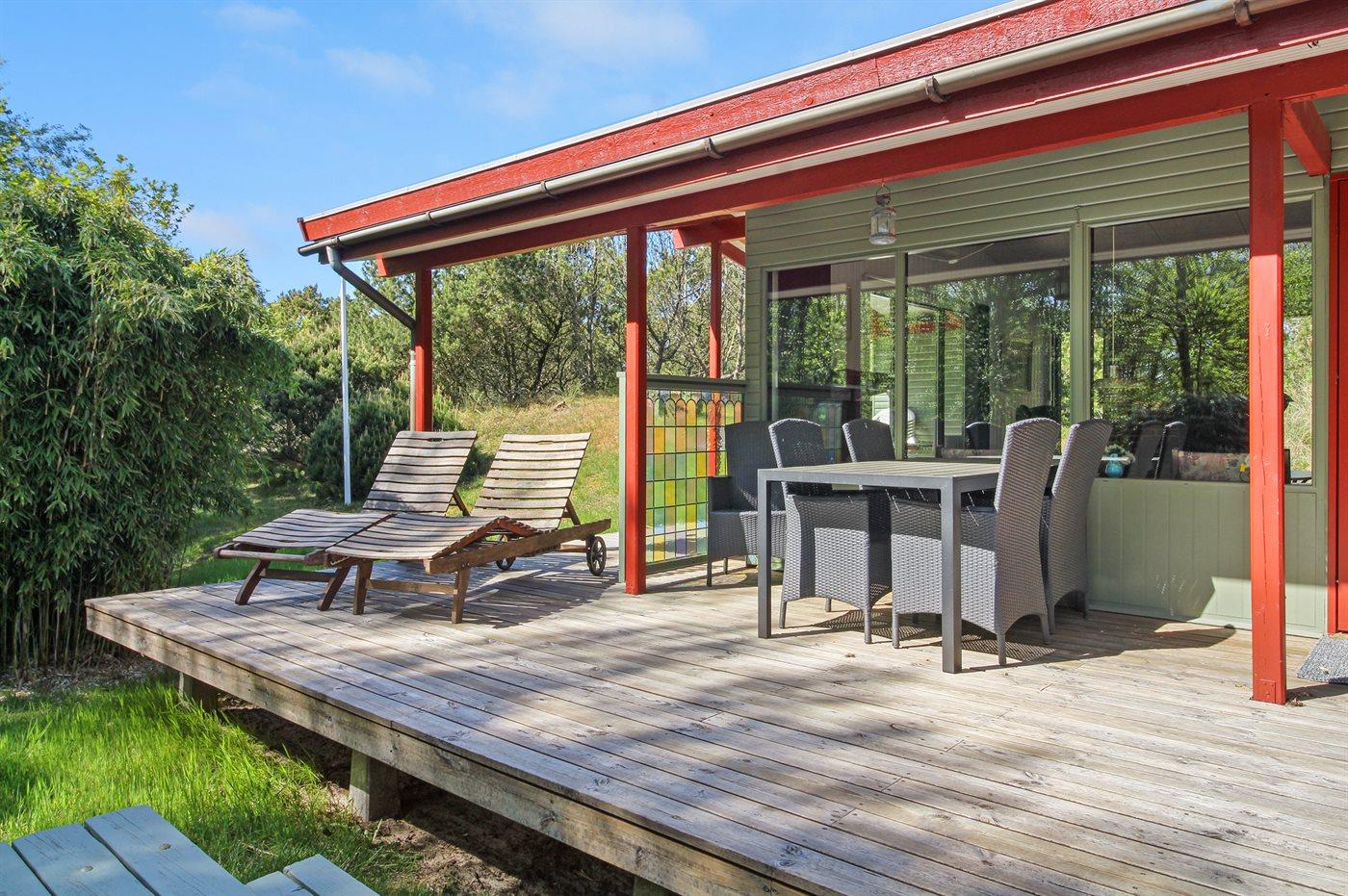 Velholdt sommerhus i træ, bygget i 1971, beliggende på en kuperet naturgrund med fyrretræer og lyng. Såvel åben som overdækket terrasse med havemøbler. Gulvene er belagt med tæpper. Væggene og lofterne er i træ. Synlige loftsbjælker. Badeværelse med bruser og flisegulv. Køkkenet er bl. a. udstyret med mikrobølgeovn. Opholdsstuen indeholder brændeovn, radio samt TV med parabol (digital). Husets sovepladser fordeler sig på 2 værelser med dobbeltseng og 1 med 1 enkeltseng samt køjeseng. Et hyggeligt sommerhus, hvortil der desuden hører carport.