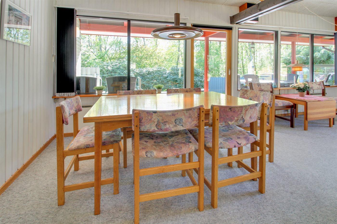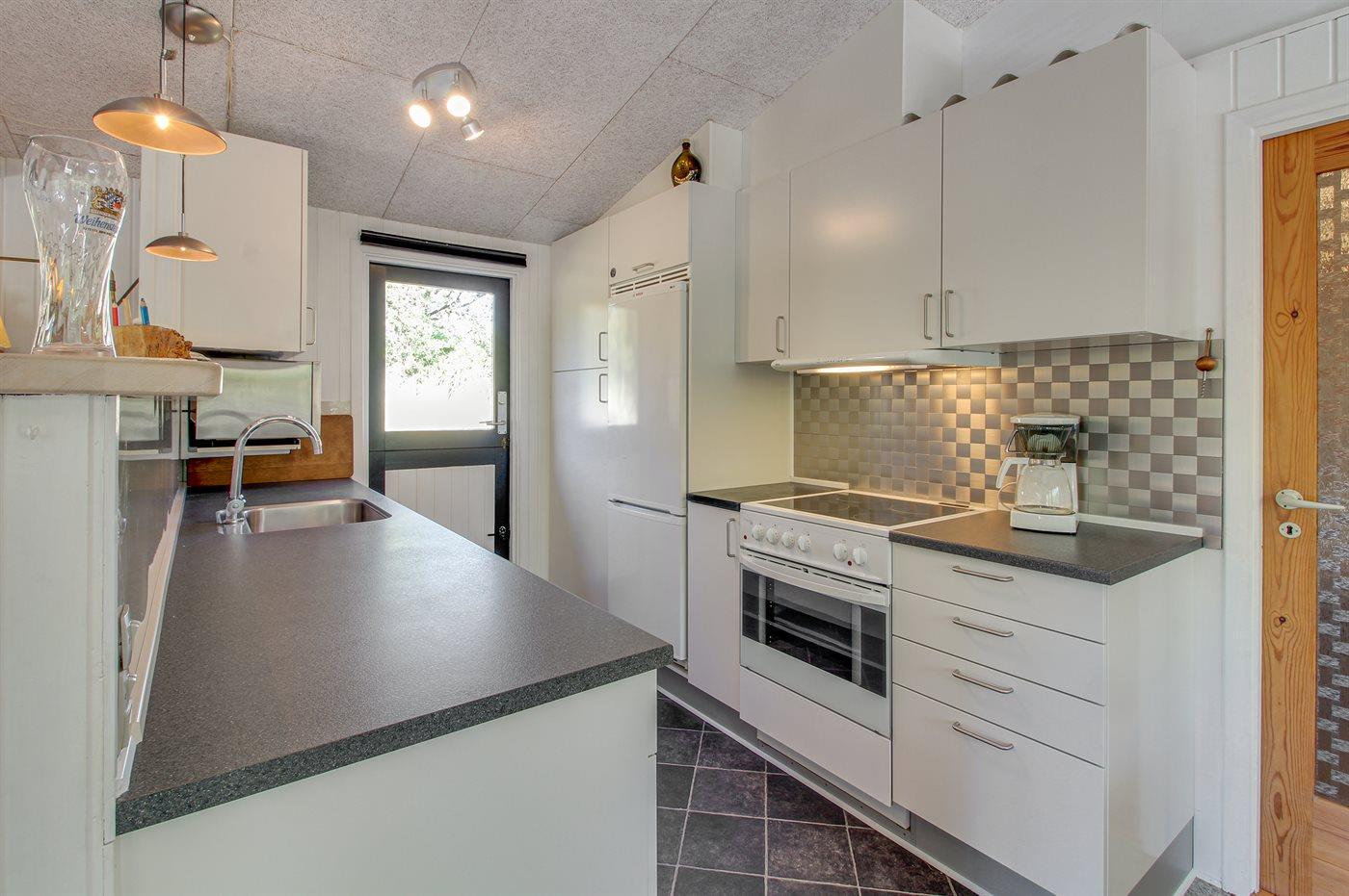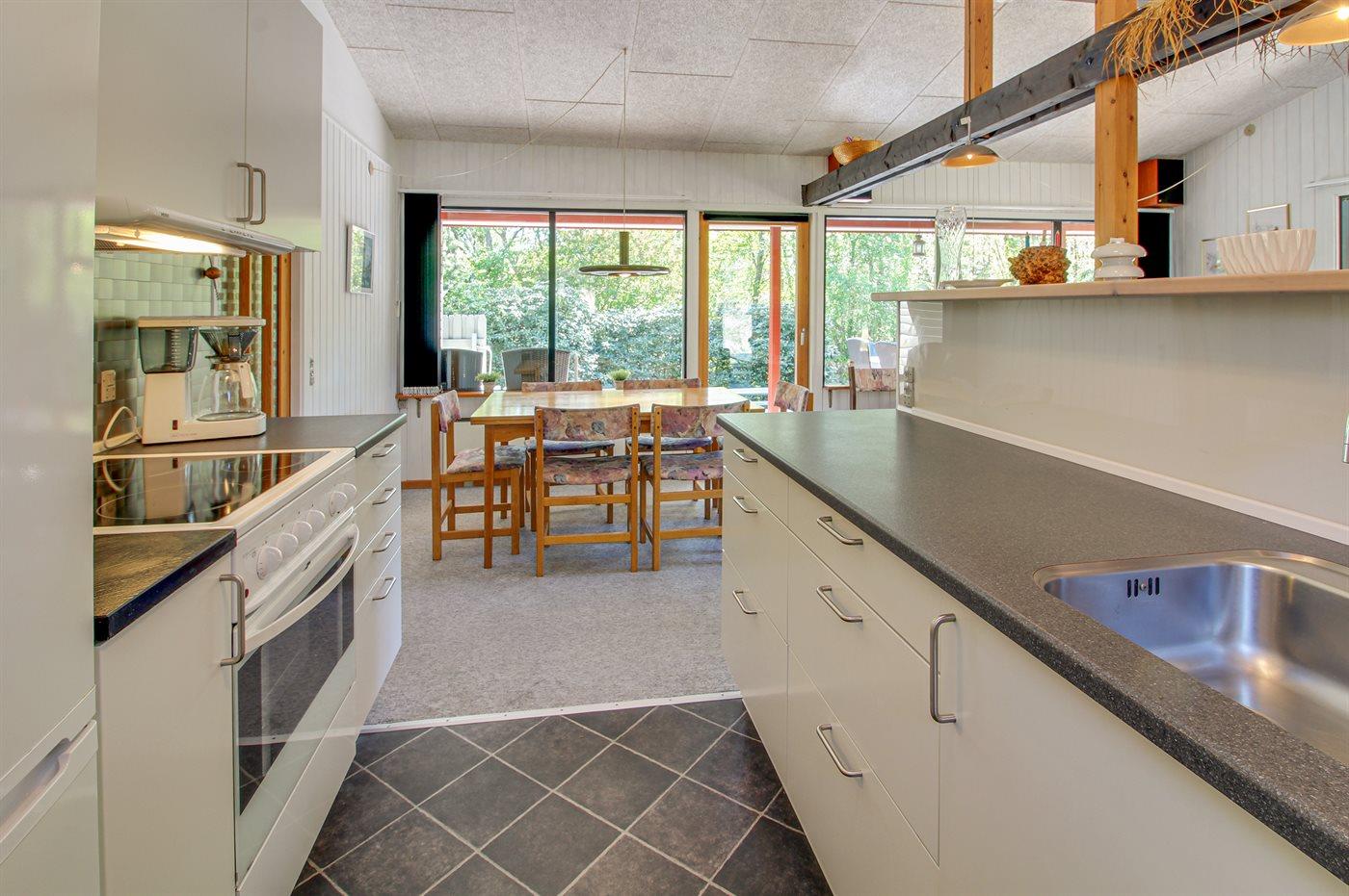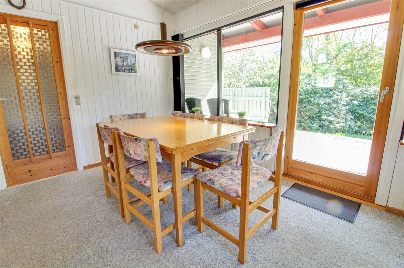 Velholdt sommerhus i træ, bygget i 1971, beliggende på en kuperet naturgrund med fyrretræer og lyng. Såvel åben som overdækket terrasse med havemøbler. Gulvene er belagt med tæpper. Væggene og lofterne er i træ. Synlige loftsbjælker. Badeværelse med bruser og flisegulv. Køkkenet er bl. a. udstyret med mikrobølgeovn. Opholdsstuen indeholder brændeovn, radio samt TV med parabol (digital). Husets sovepladser fordeler sig på 2 værelser med dobbeltseng og 1 med 1 enkeltseng samt køjeseng. Et hyggeligt sommerhus, hvortil der desuden hører carport.
