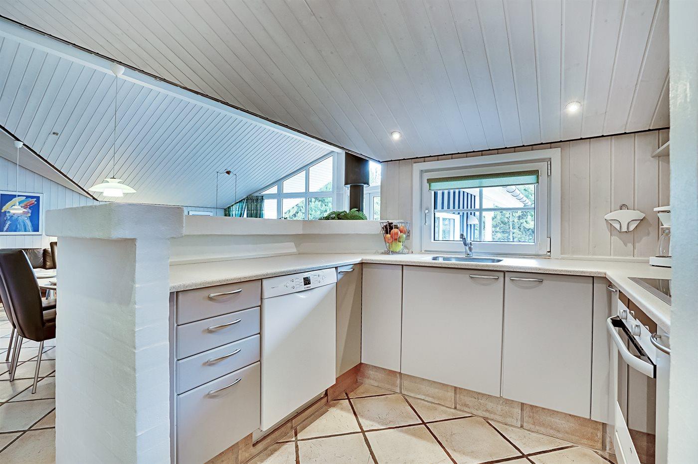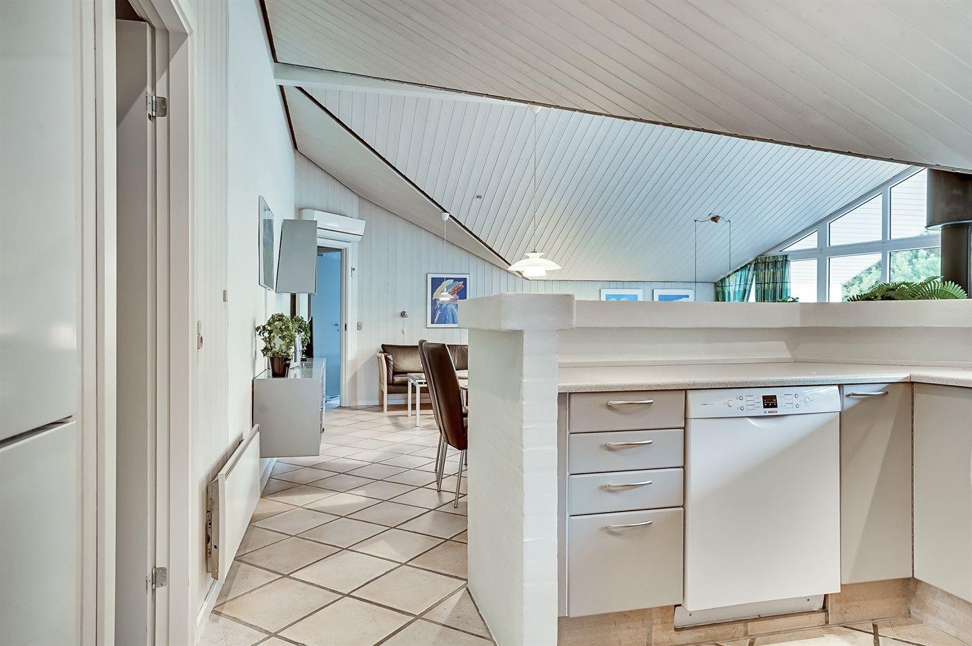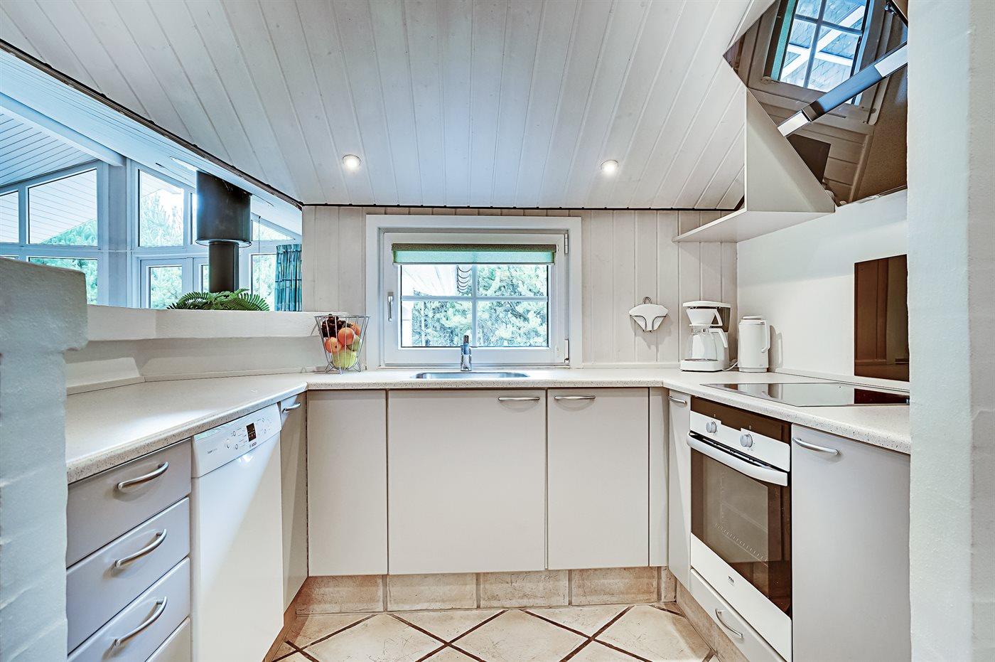 Køkkenet er udstyret med 1 køleskab. Der er 4 keramiske kogeplader, varmluftovn, mikrobølgeovn samt opvaskemaskine.