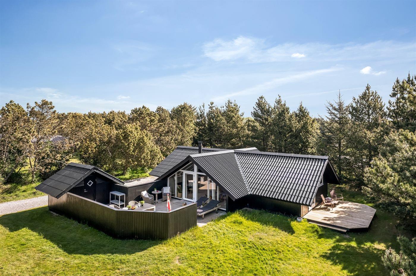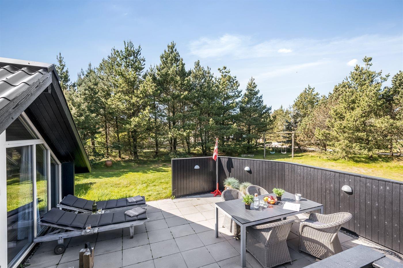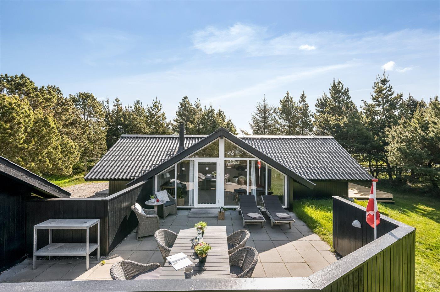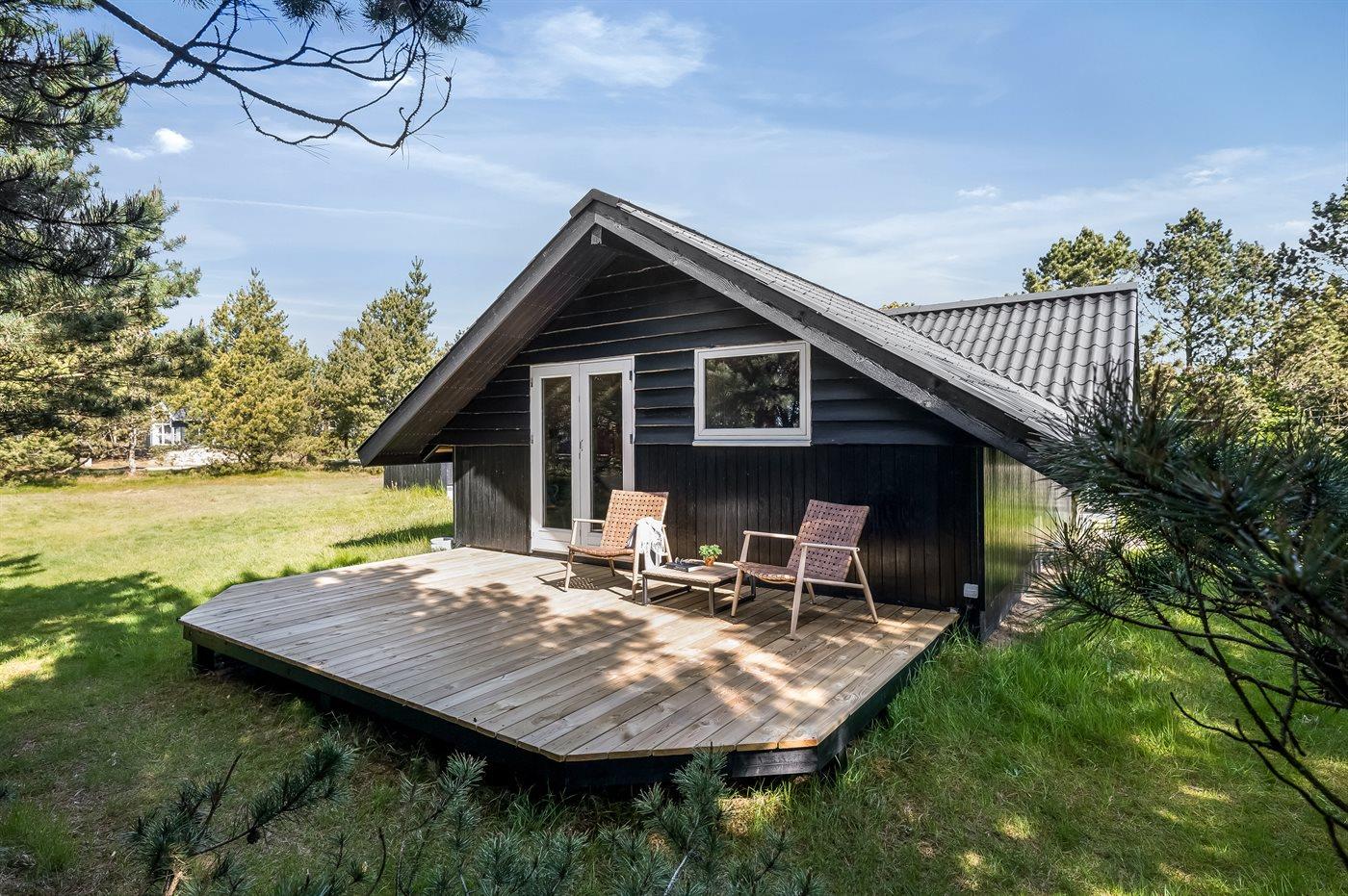 Hyggeligt træsommerhus i Blåvand med nyt køkken, stor terrasse og børnevenlige faciliteter nær havet.