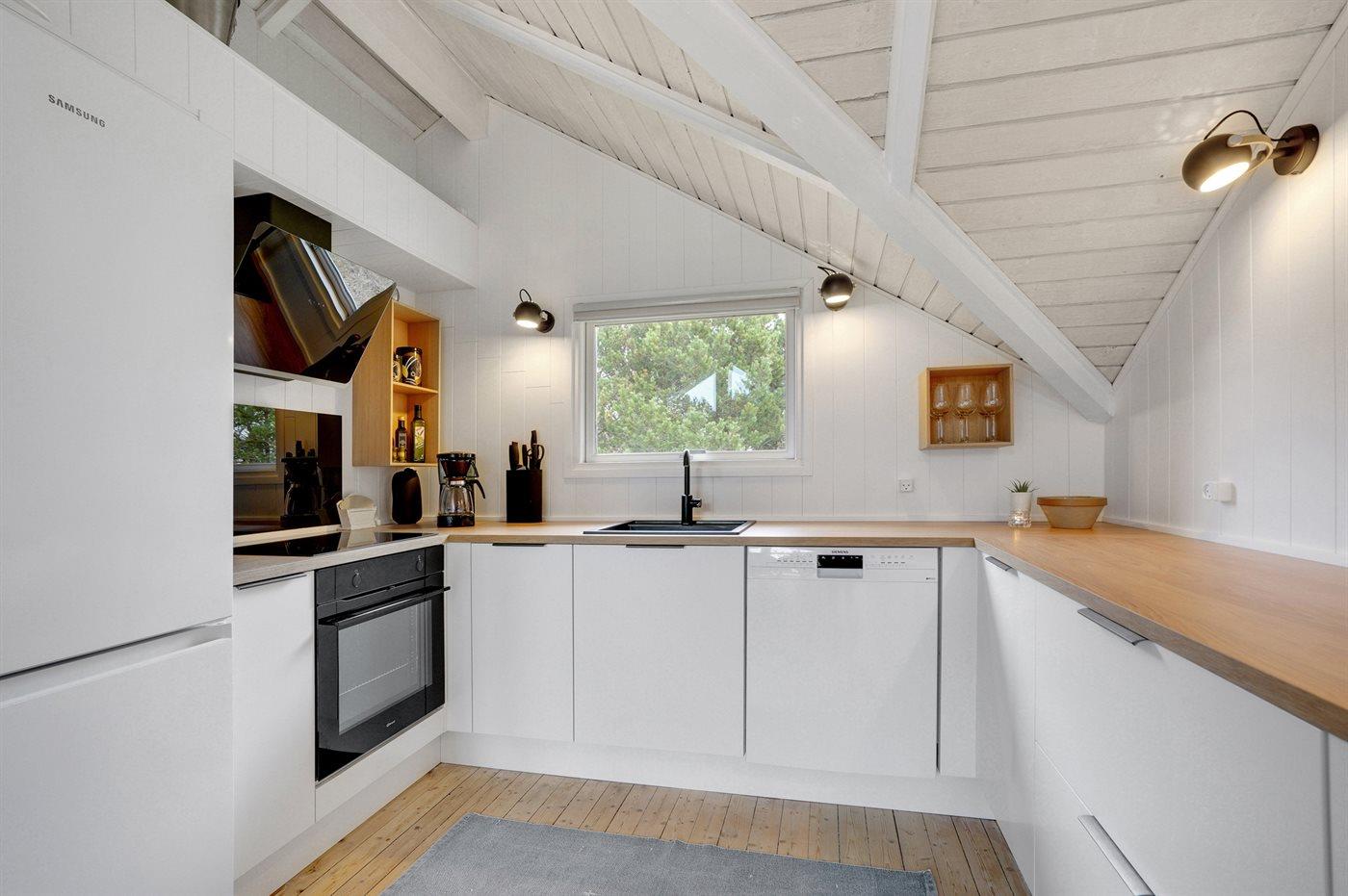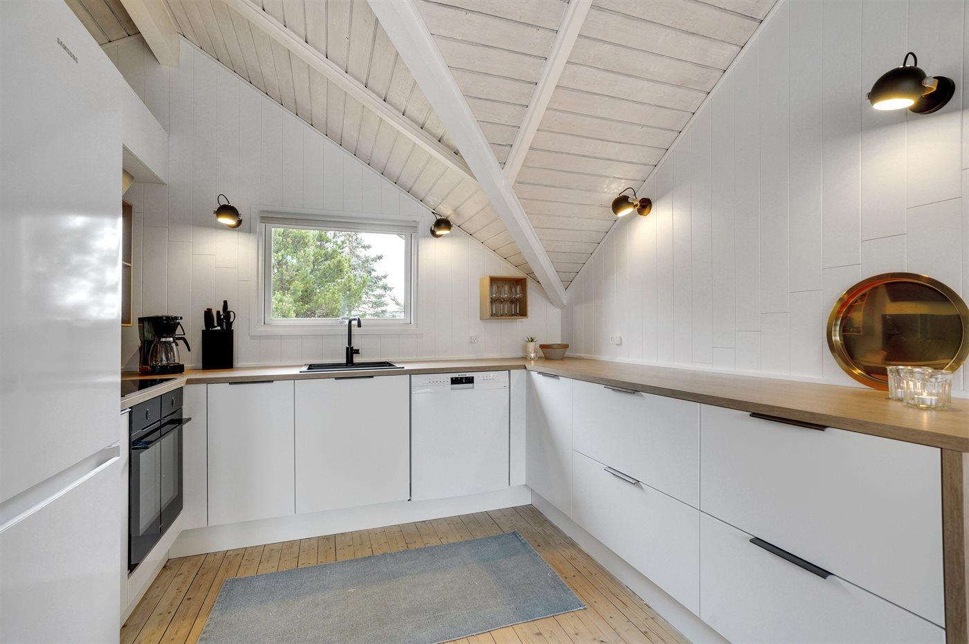 Køkkenet er udstyret med 1 køleskab. Der er 4 elkogeplader, varmluftovn, mikrobølgeovn samt opvaskemaskine.