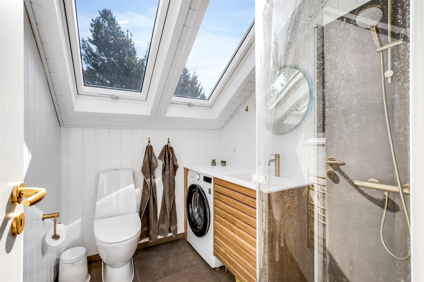 Der er 1 badeværelse med bruser og 1 toilet.. Der er gulvvarme på 1 badeværelse.