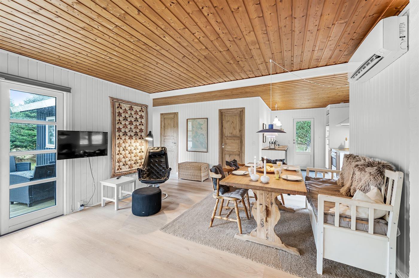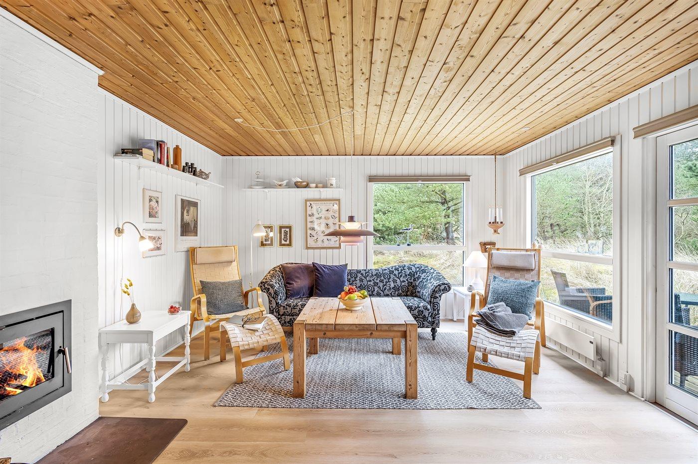 Hyggeligt sommerhus i Blåvand med pejs, stor terrasse og naturgrund nær strand og by.