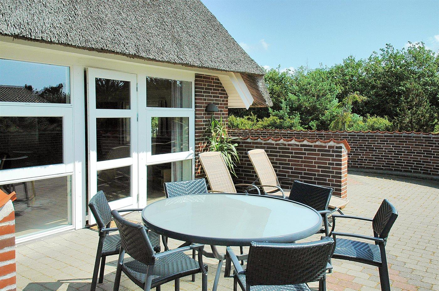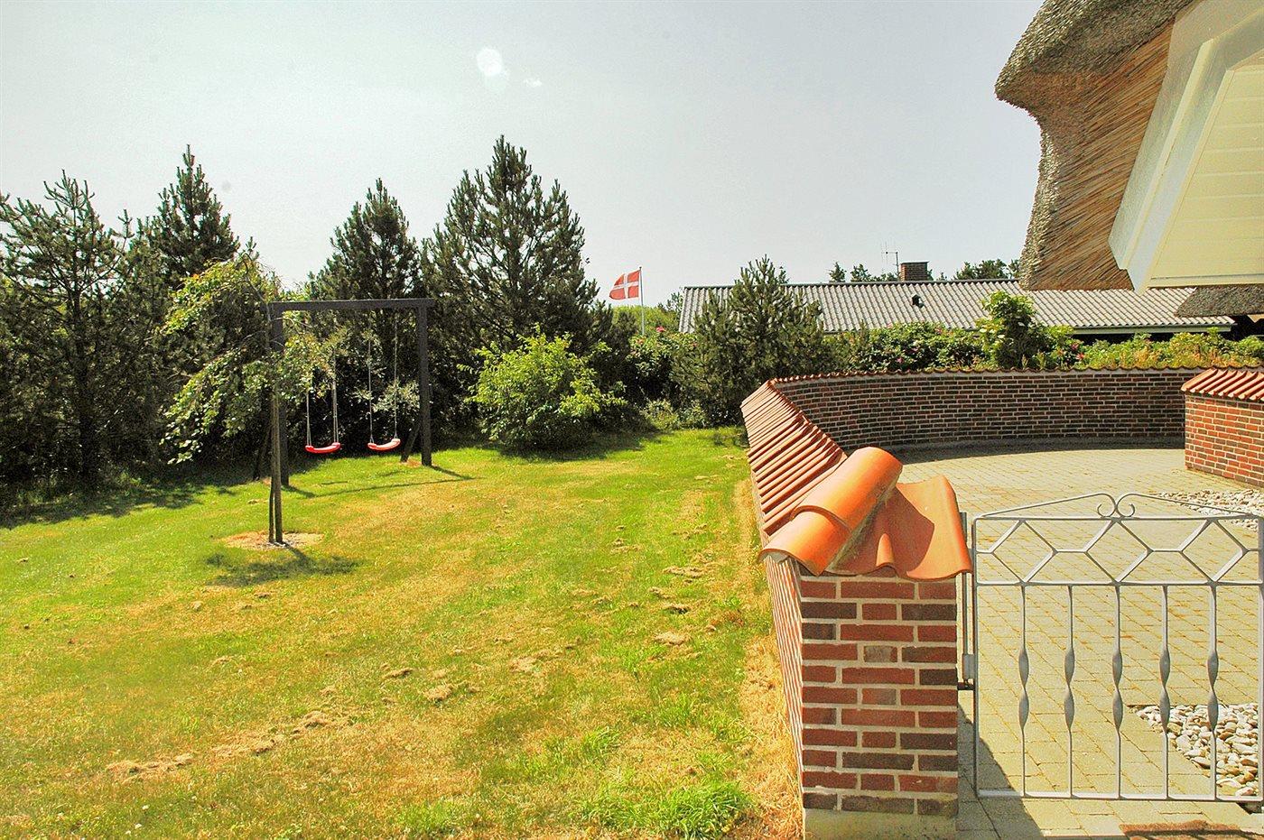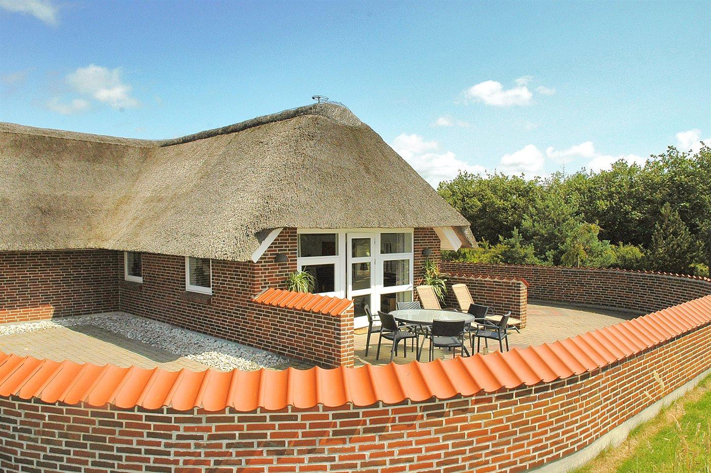 Hyggeligt sommerhus i Blåvand med stråtag, spa og store terrasser tæt på strand og indkøb.