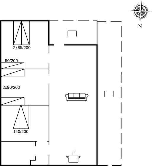 Der er i alt 3 soveværelser. Sovepladserne fordeler sig på: 4 sovepladser i dobbeltsenge. 2 sovepladser i enkeltsenge.