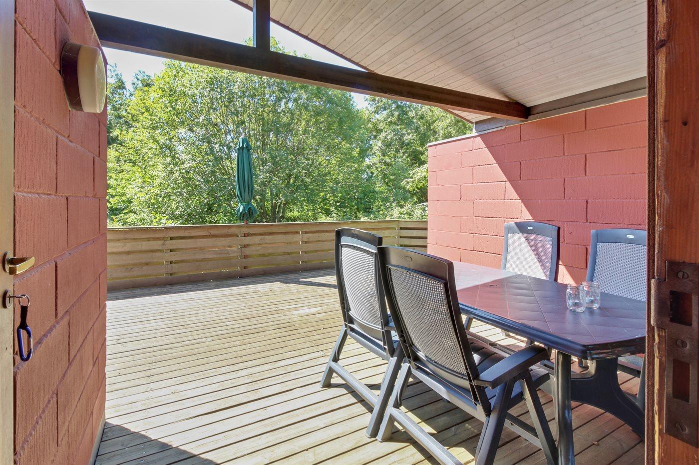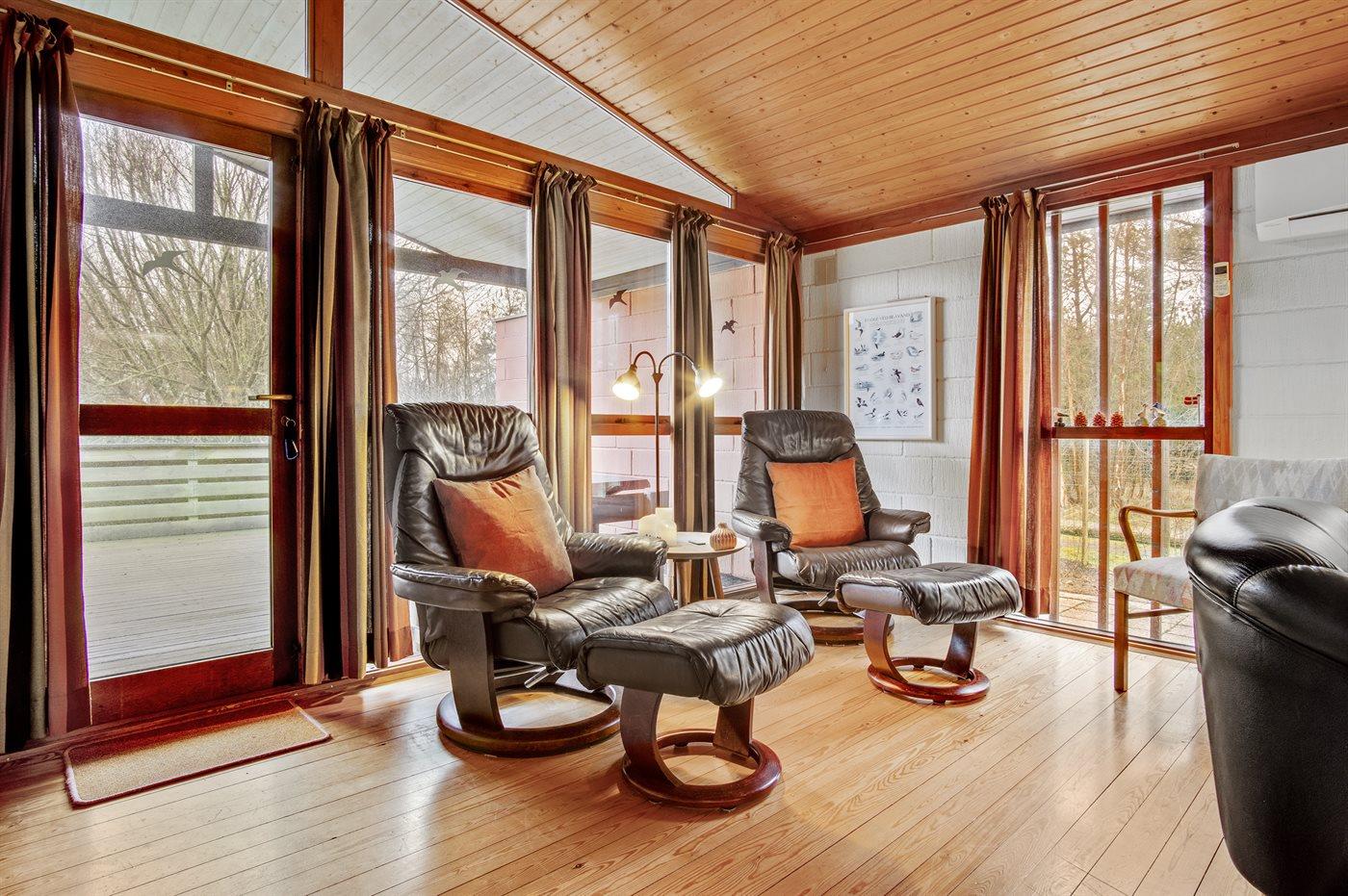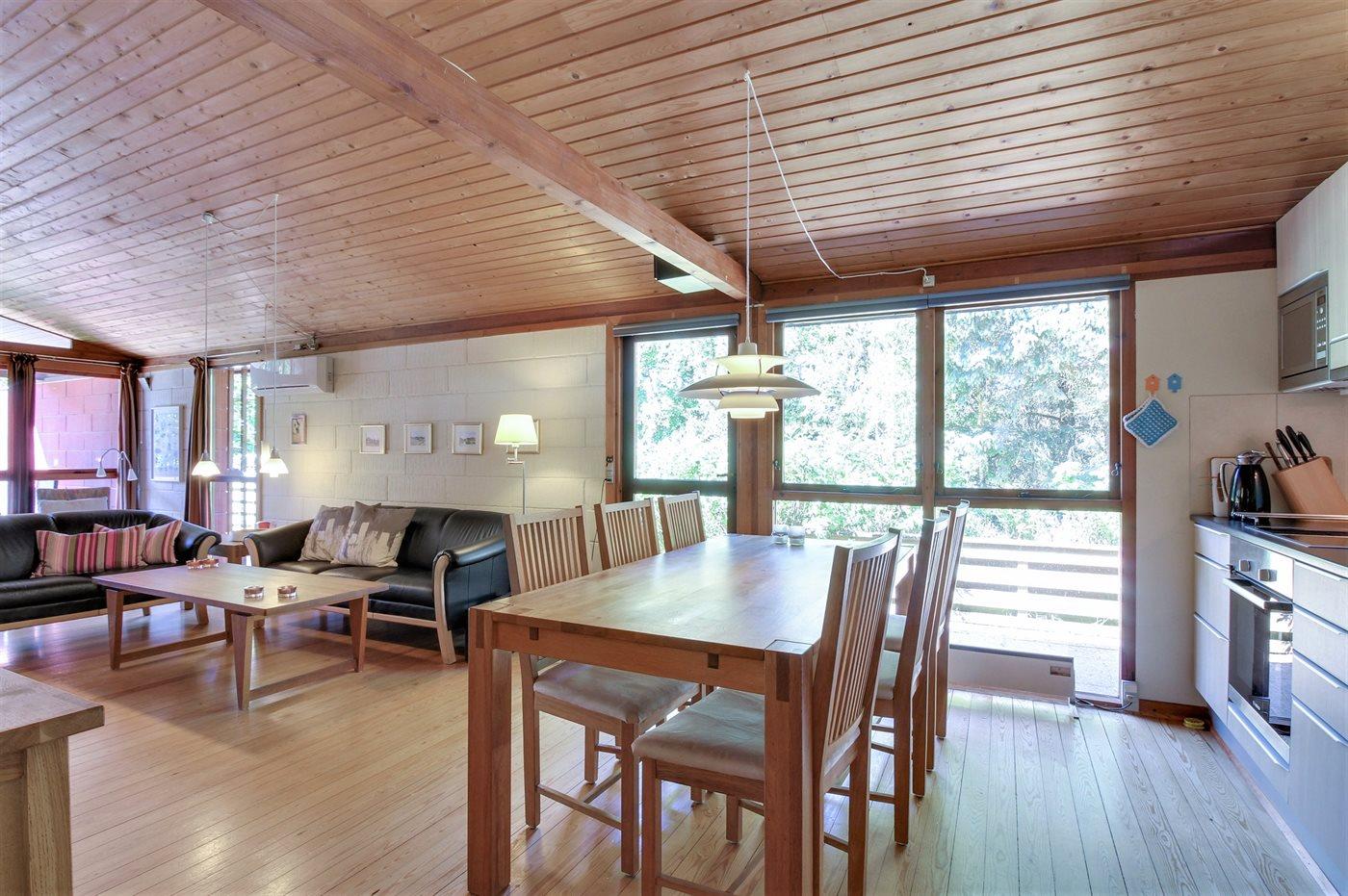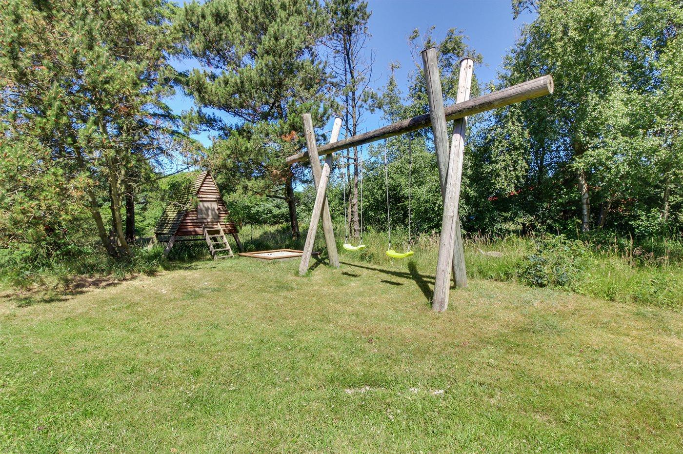 Sommerhus beliggende ugenert for enden af en blind vej på en grund omgivet af høje træer. Her er der gode legefaciliteter for børn.