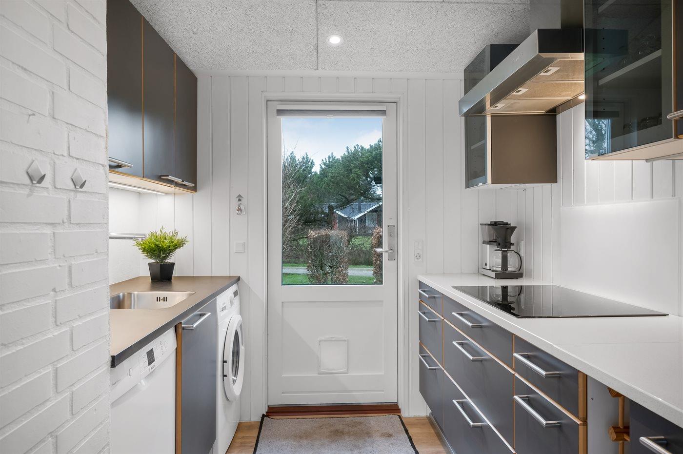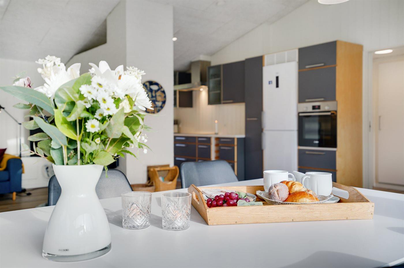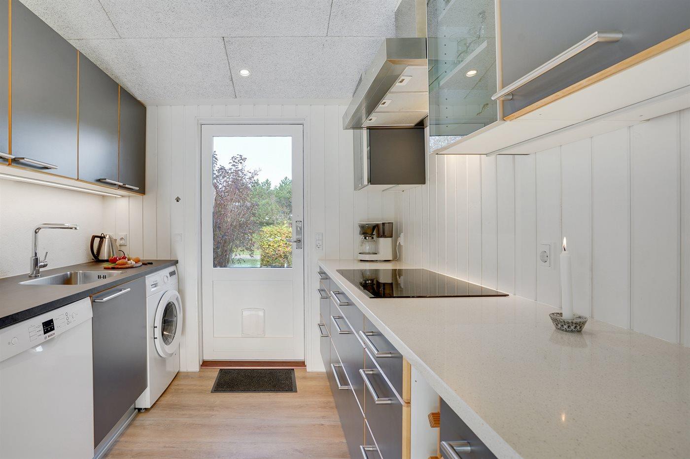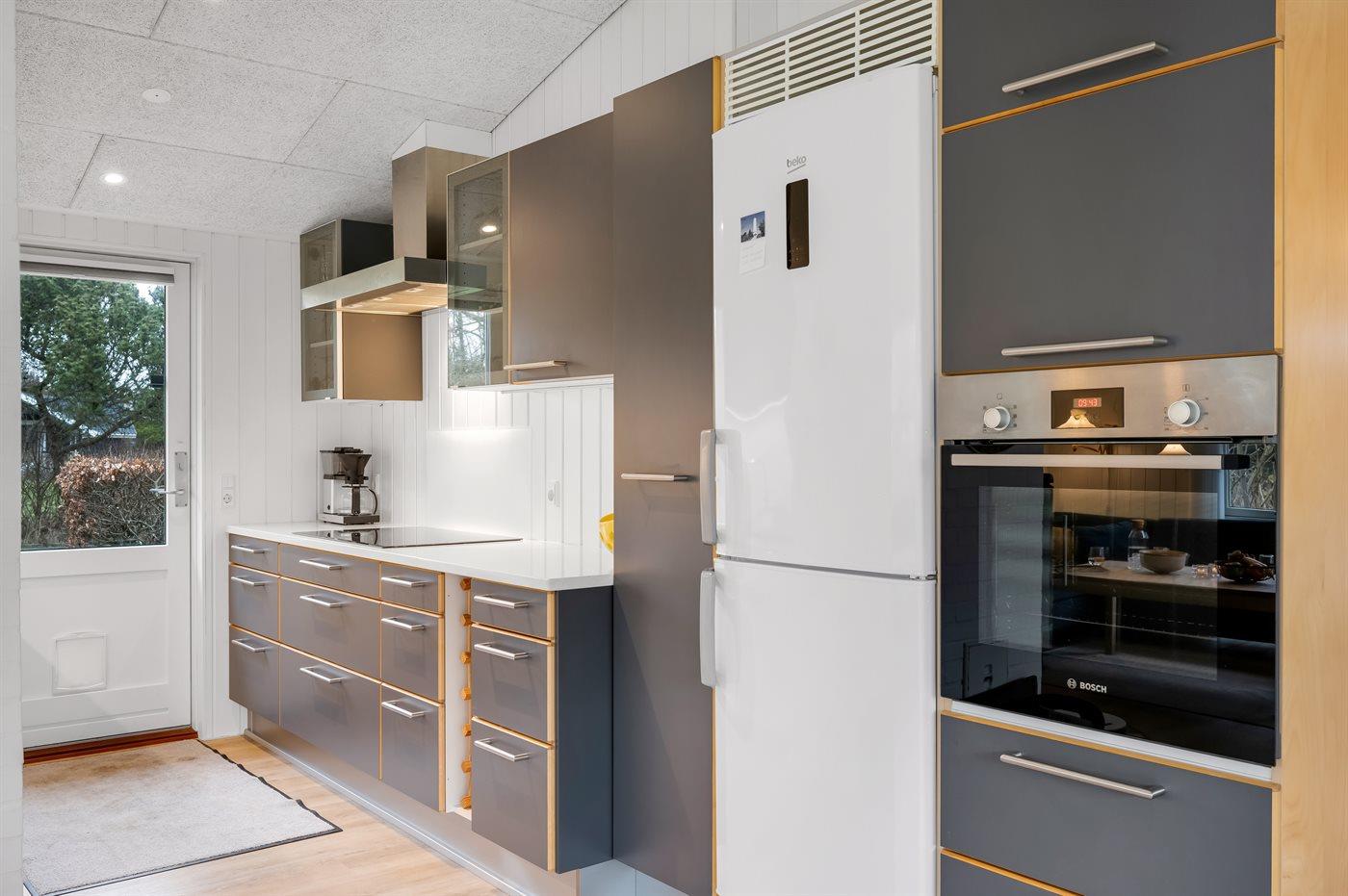 Køkkenet er udstyret med 1 køleskab. Der er 4 keramiske kogeplader, varmluftovn, mikrobølgeovn samt opvaskemaskine.