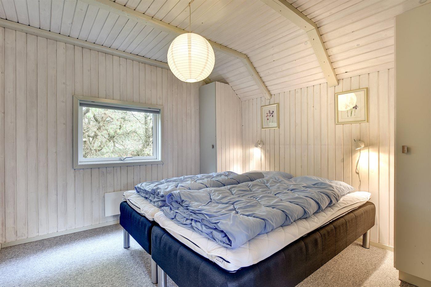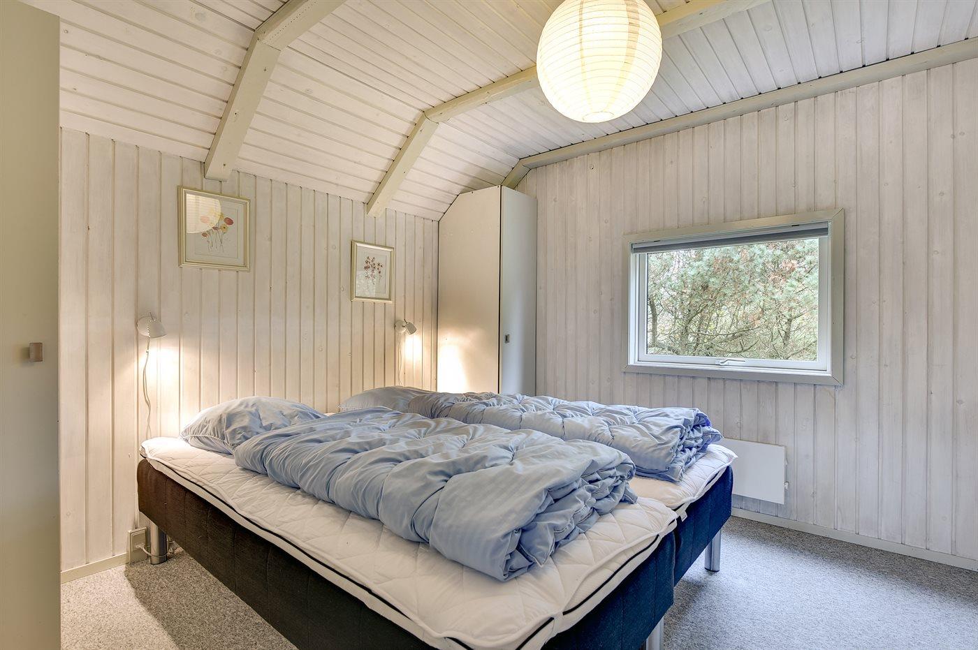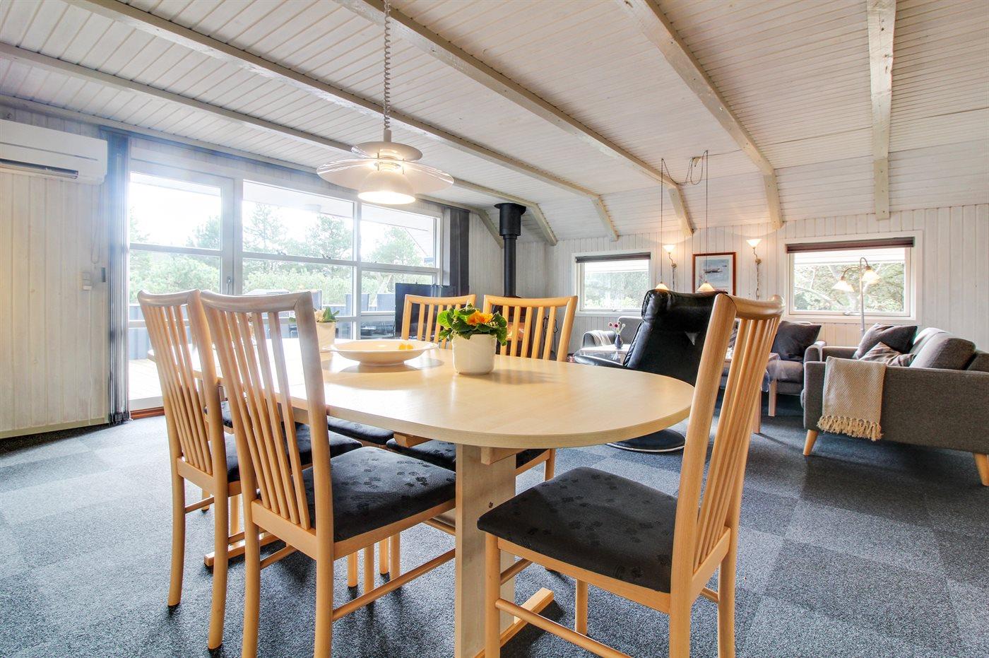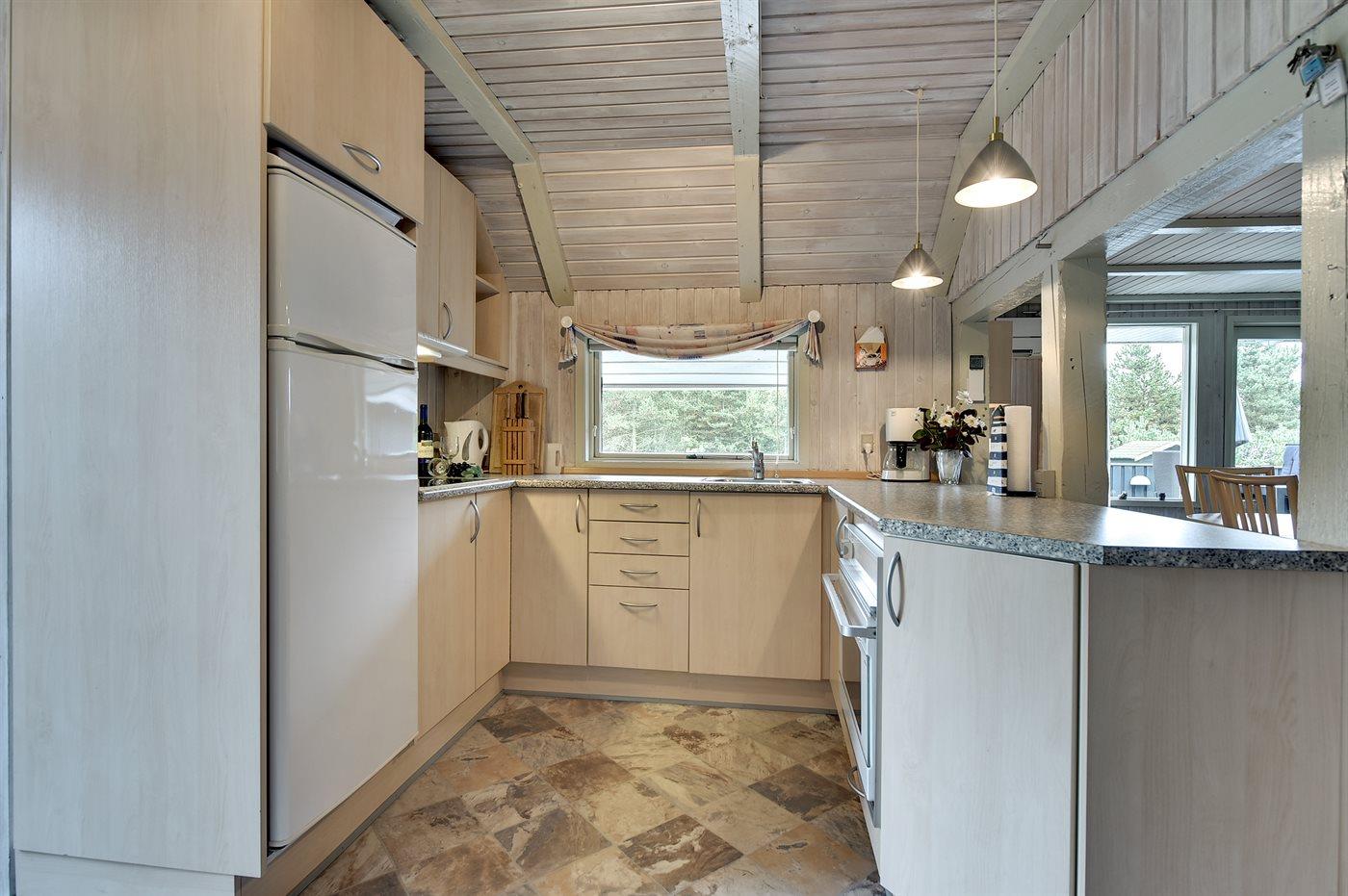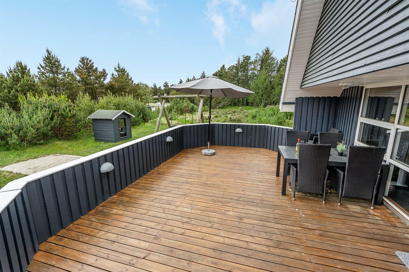 På en kuperet grund med mange fyrretræer, ud til Blåvand-vejen, ligger dette sommerhus med afskærmet, sydvendt og delvis overdækket terrasseareal.