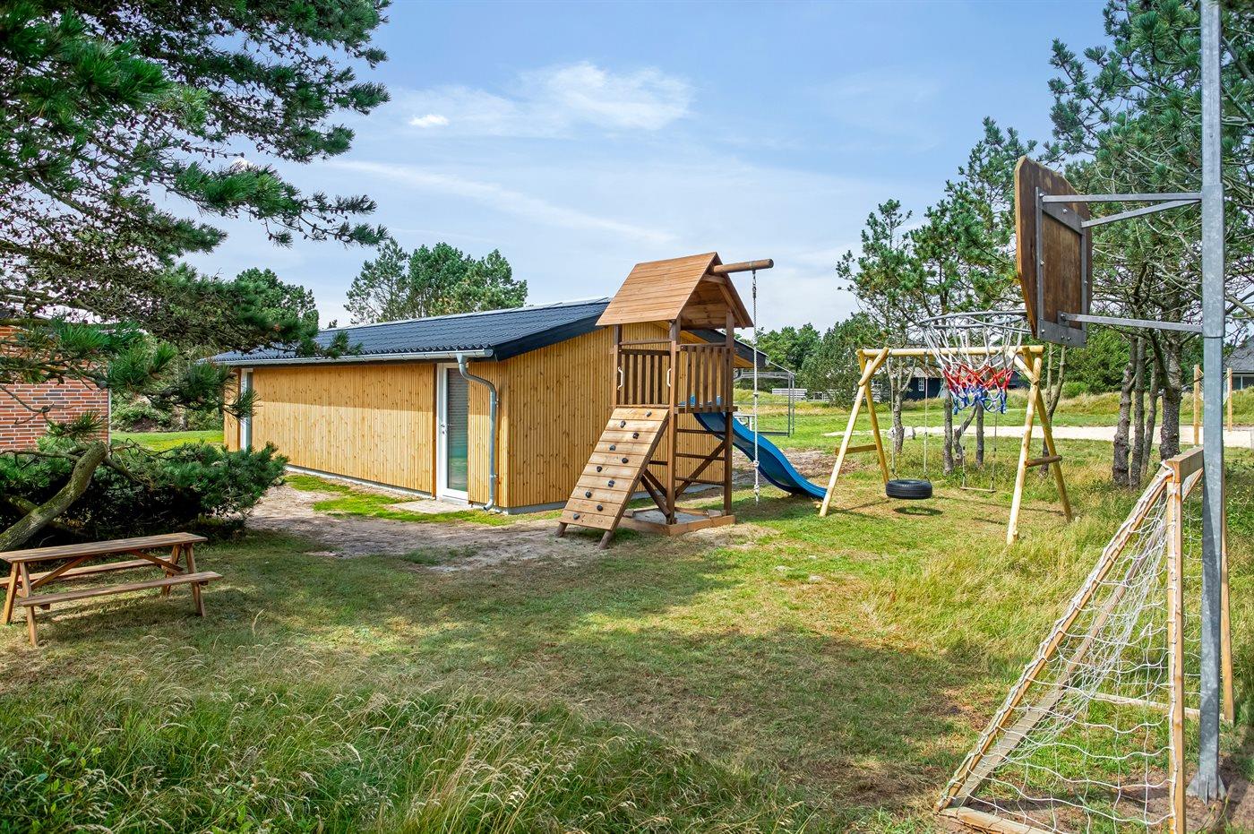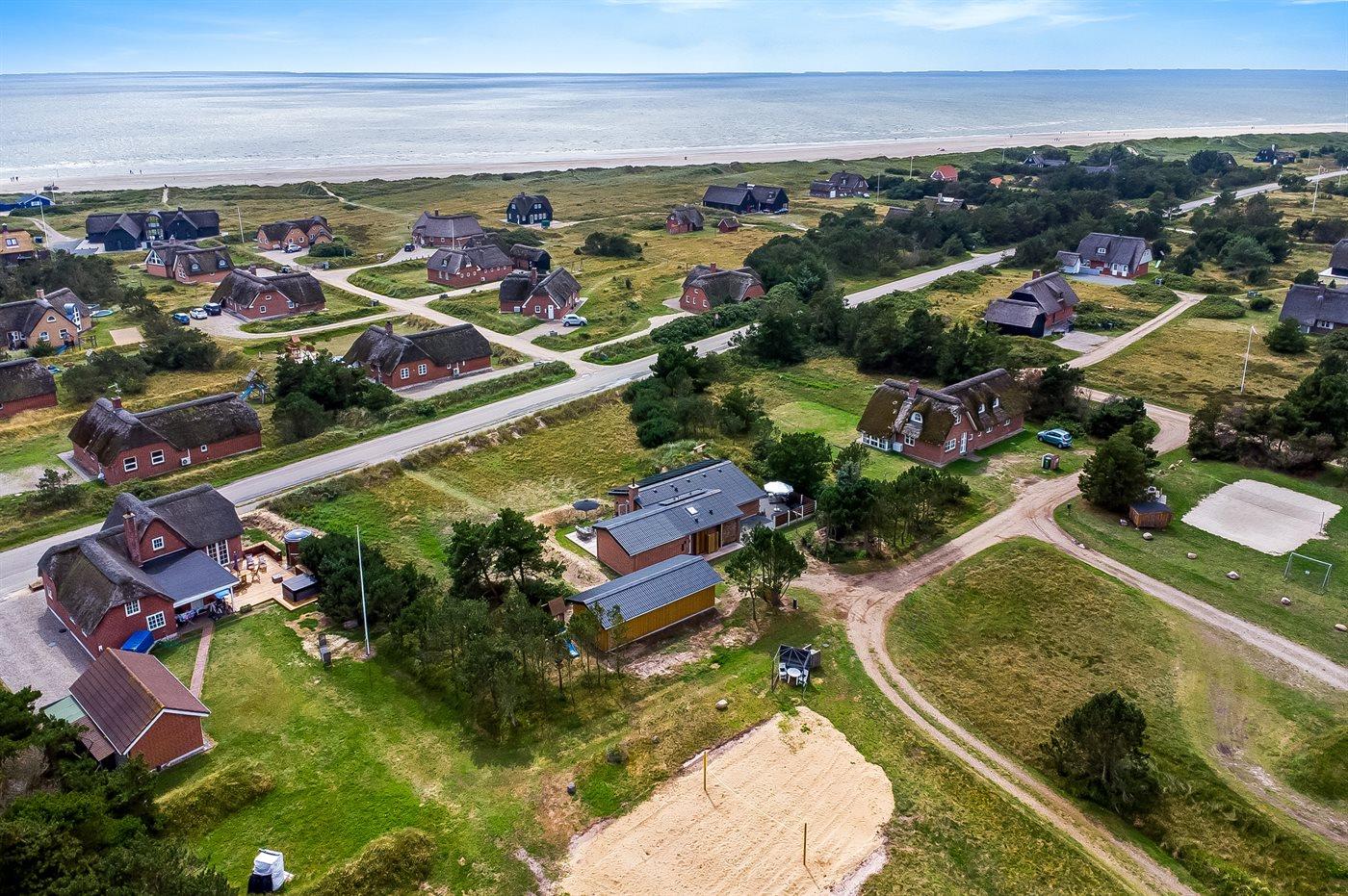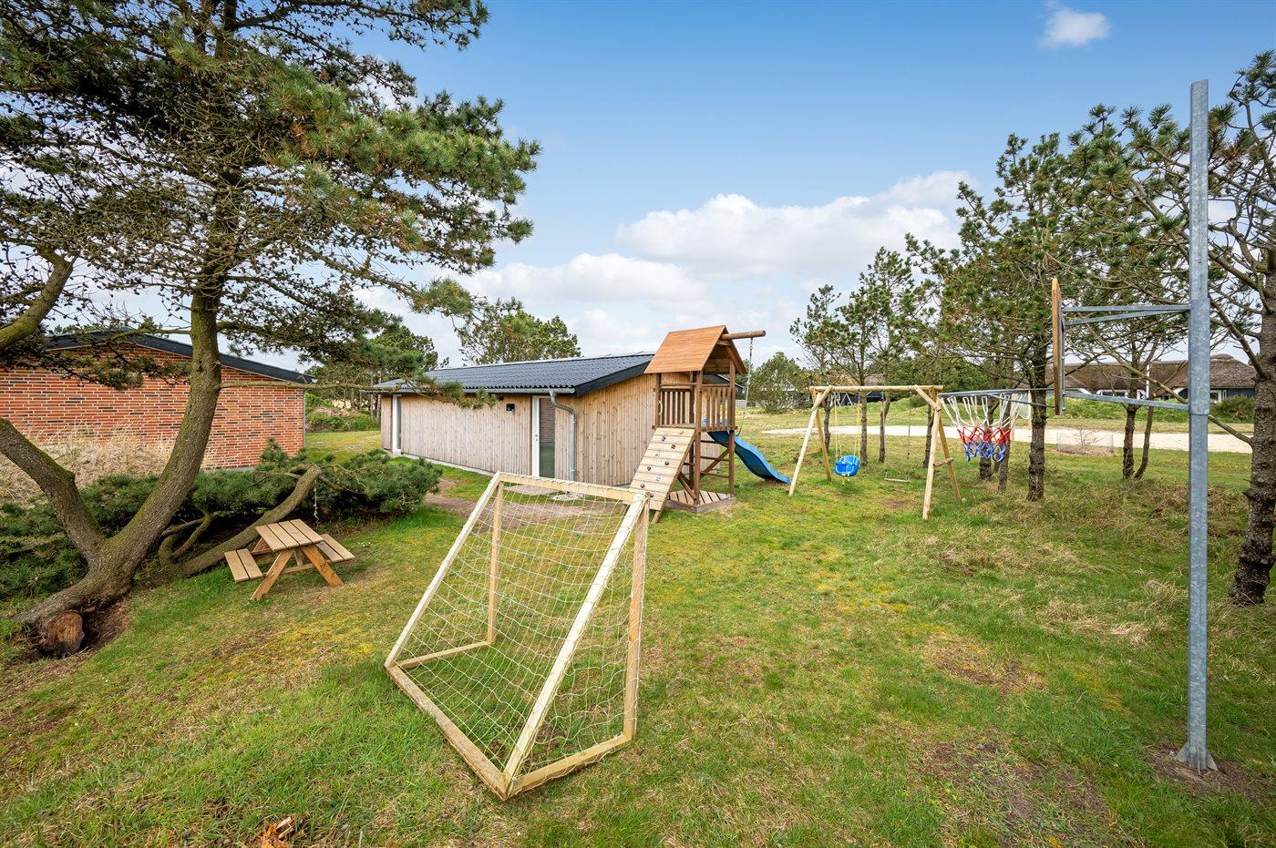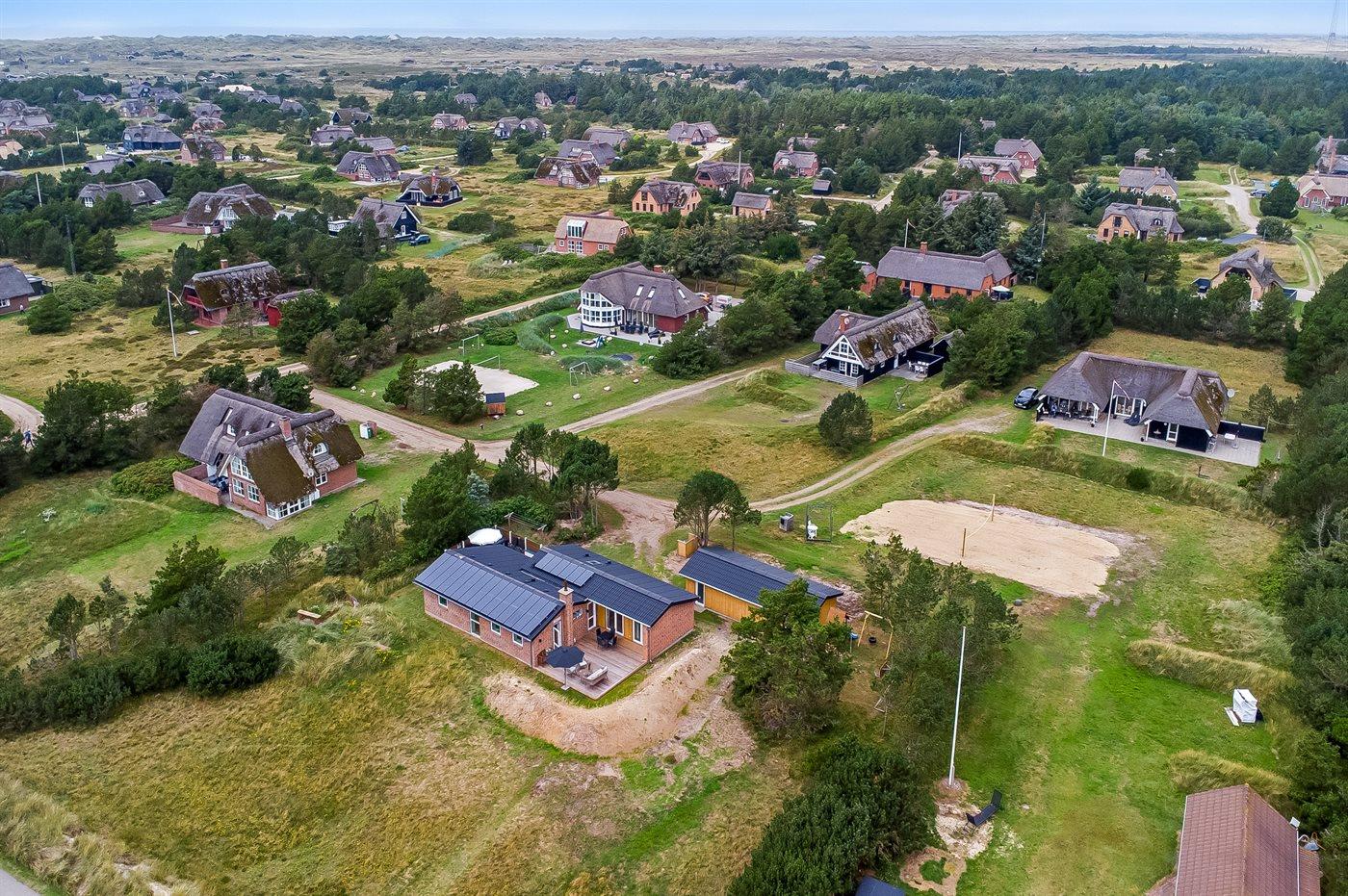 Ferieboligen er beliggende på en 2500 m² stor naturgrund. Der er 200 m til havet. Nærmeste forretning er beliggende i en afstand af 1000 m. Til ferieboligen hører 72 m² terrasseareal. Desuden er der 22 m² overdækket terrasse. Der er redskabsrum. Gynge. Sandkasse. Legetårn. Rutchebane. Basketkurv. Udendørs bruser. Der er garage til rådighed. Der er installeret stik til opladning af elbil. Type 2 stik. Parkering ved ferieboligen.