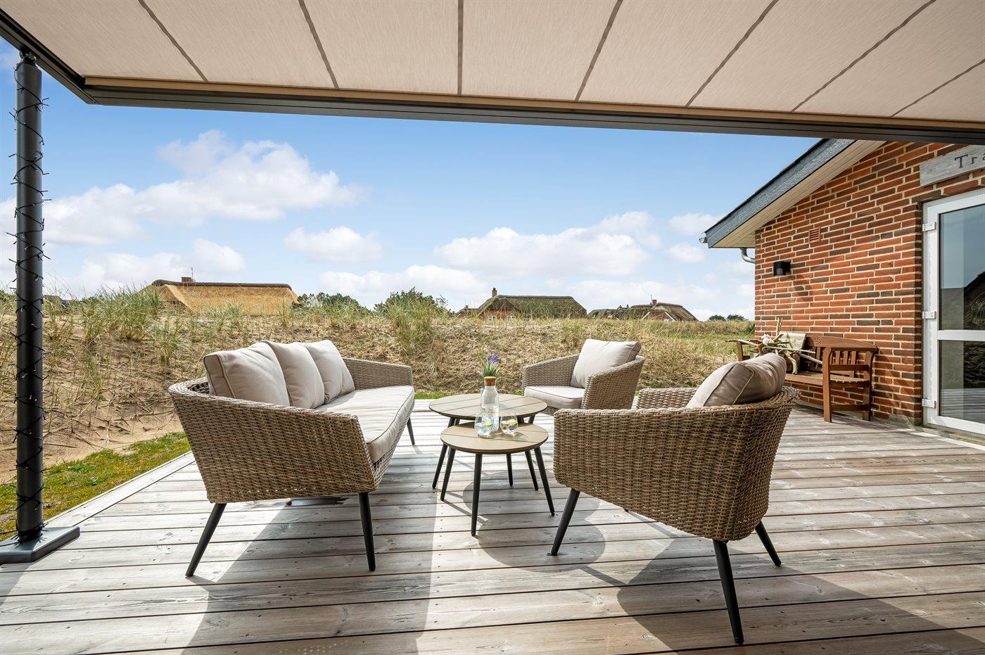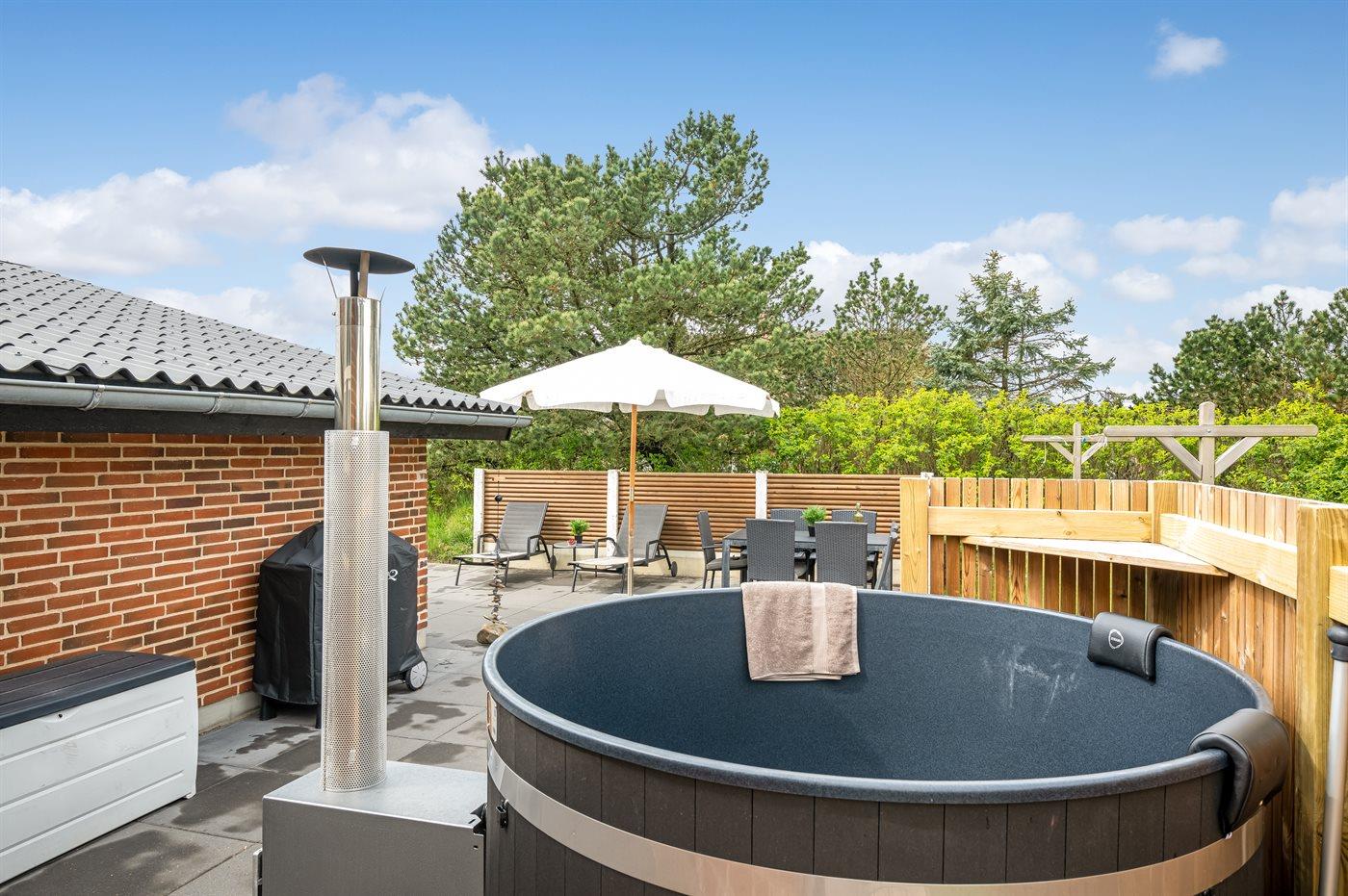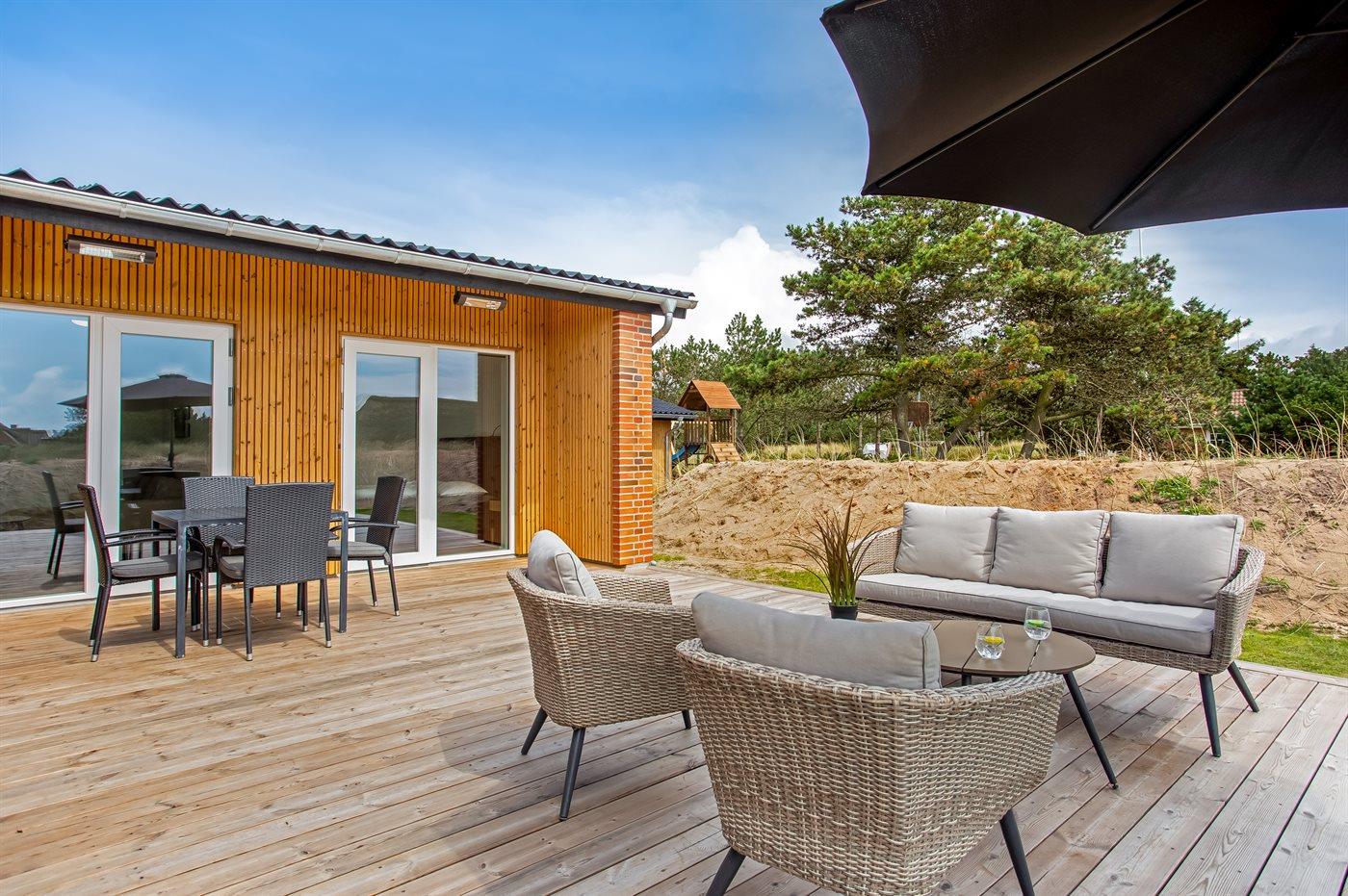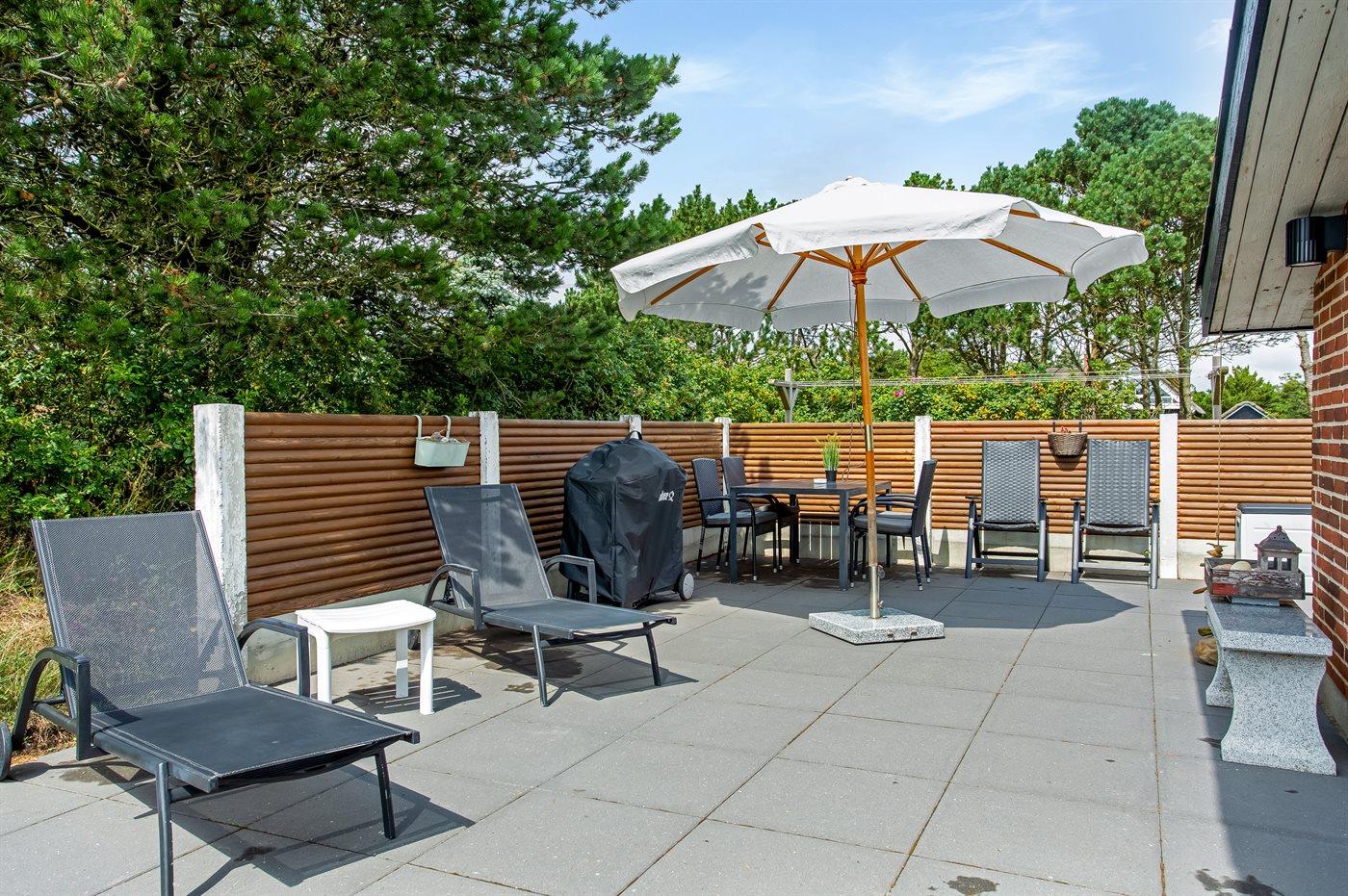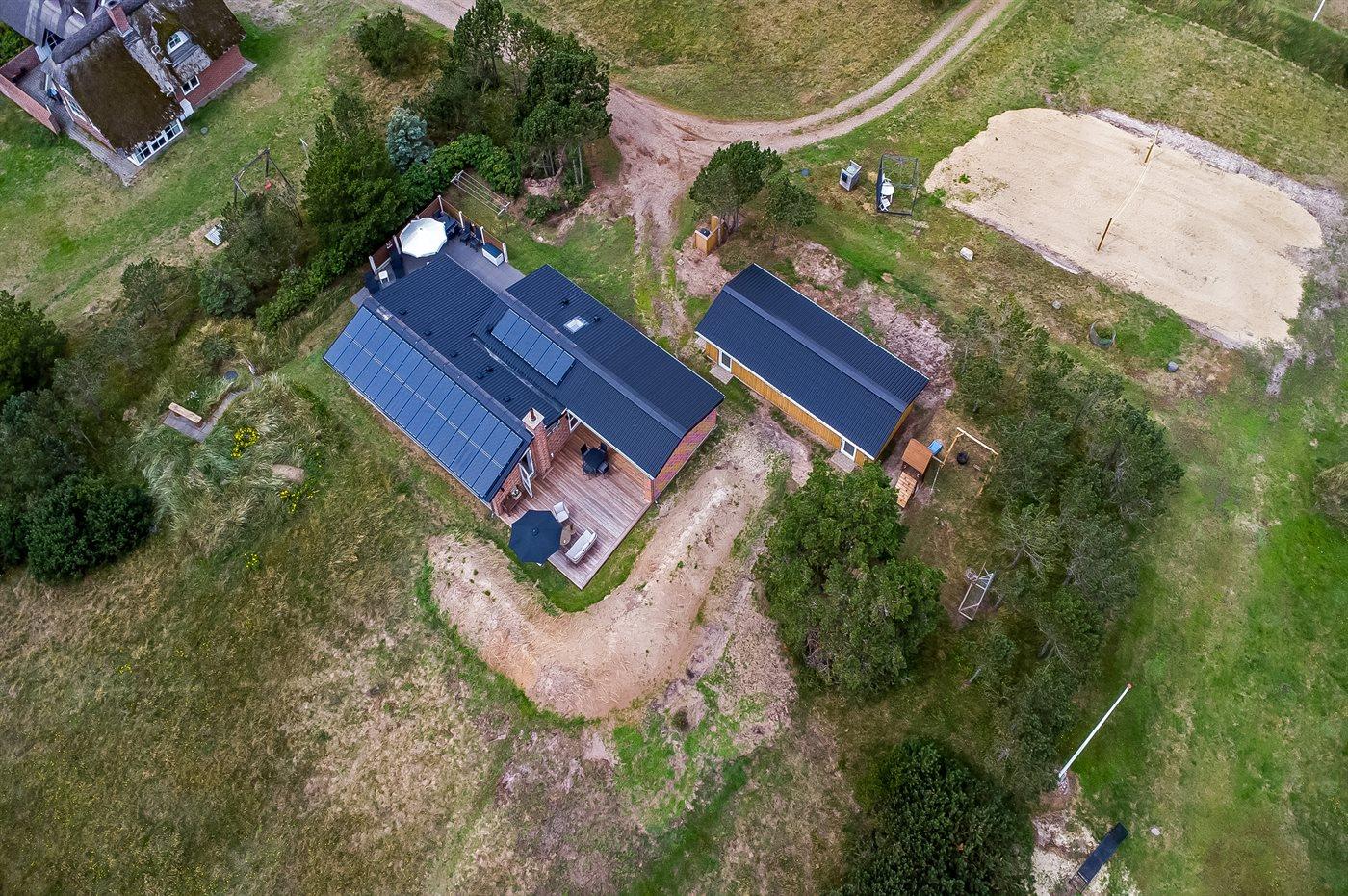 Ferieboligen er beliggende på en 2500 m² stor naturgrund. Der er 200 m til havet. Nærmeste forretning er beliggende i en afstand af 1000 m. Til ferieboligen hører 72 m² terrasseareal. Desuden er der 22 m² overdækket terrasse. Der er redskabsrum. Gynge. Sandkasse. Legetårn. Rutchebane. Basketkurv. Udendørs bruser. Der er garage til rådighed. Der er installeret stik til opladning af elbil. Type 2 stik. Parkering ved ferieboligen.