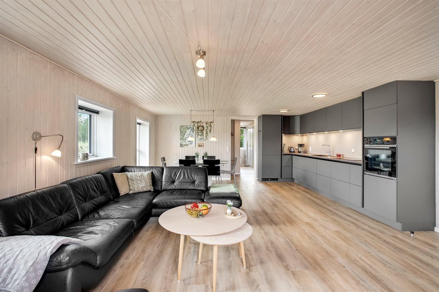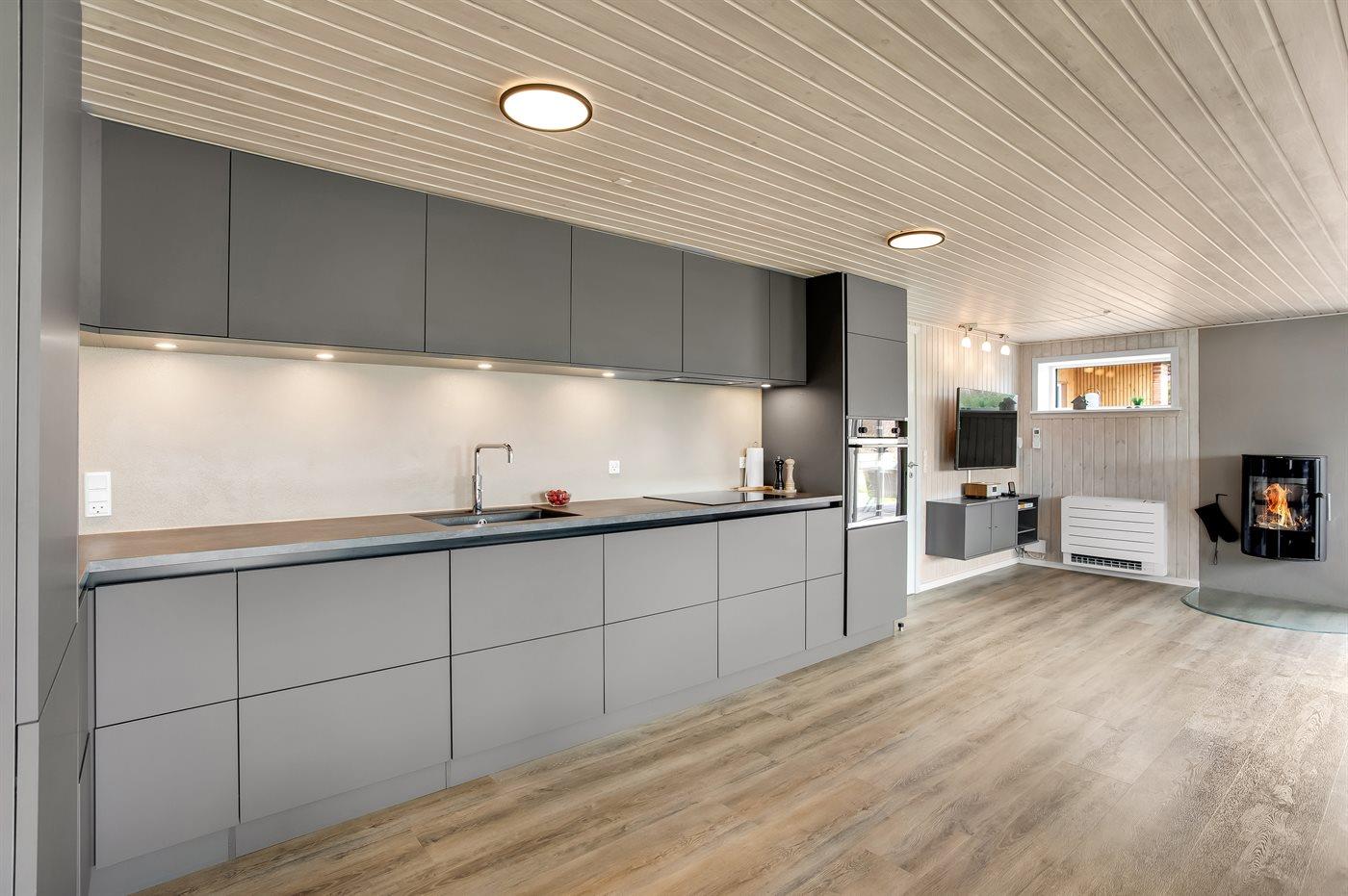 Køkkenet er udstyret med 1 køleskab. Der er 4 induktionskogeplader, varmluftovn, mikrobølgeovn samt opvaskemaskine.