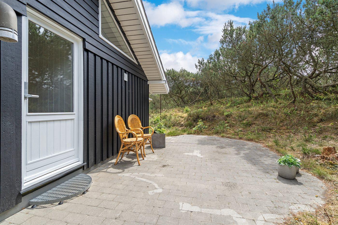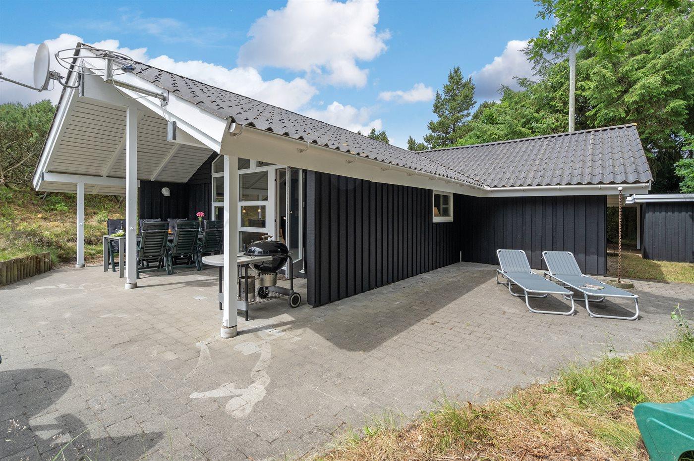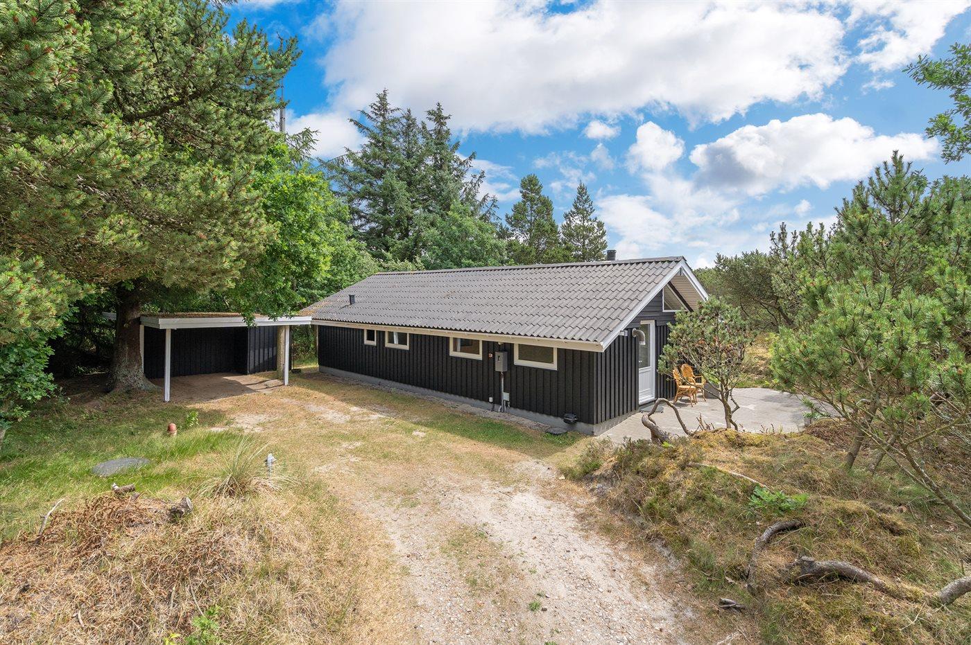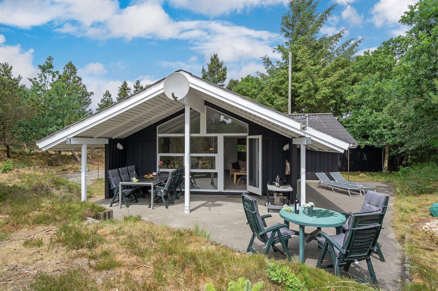 Dette sommerhus i træ ligger på en ugenert naturgrund, som er omkranset af høje grantræer. Huset er bygget i 1982 og renoveret i 2002 med nyt badeværelse med 2-pers. spa, sauna og gulvvarme. Til huset hører overdækket og åben terrasse med havemøbler. Væggene er beklædt med træ. På gulvene er der dels tæpper, dels klinker. Køkkenet, som er kombineret med opholdsstuen, er udstyret med opvaskemaskine, mikrobølgeovn og fryser. I den rummelige og velmøblerede opholdsstue forefindes brændeovn, video, DVD-afspiller, TV med parabol (digital) samt stereoanlæg med CD-afspiller. Gratis ADSL-internetforbindelse (egen computer skal medbringes). De 6 sovepladser fordeler sig på 3 værelser, alle med nye dobbeltsenge (2020). Til huset hører også vaskemaskine, tørretumbler, høj barnestol, carport, sandkasse og gynge. Uanset årstiden vil dette hus være et godt udgangspunkt for et vellykket ferieophold ved Vestkysten.