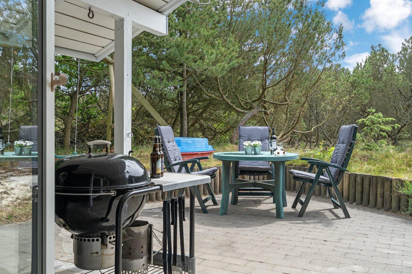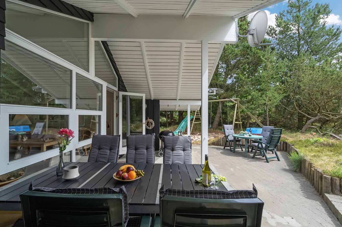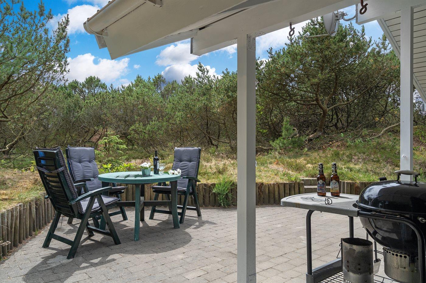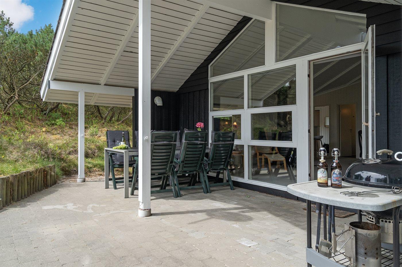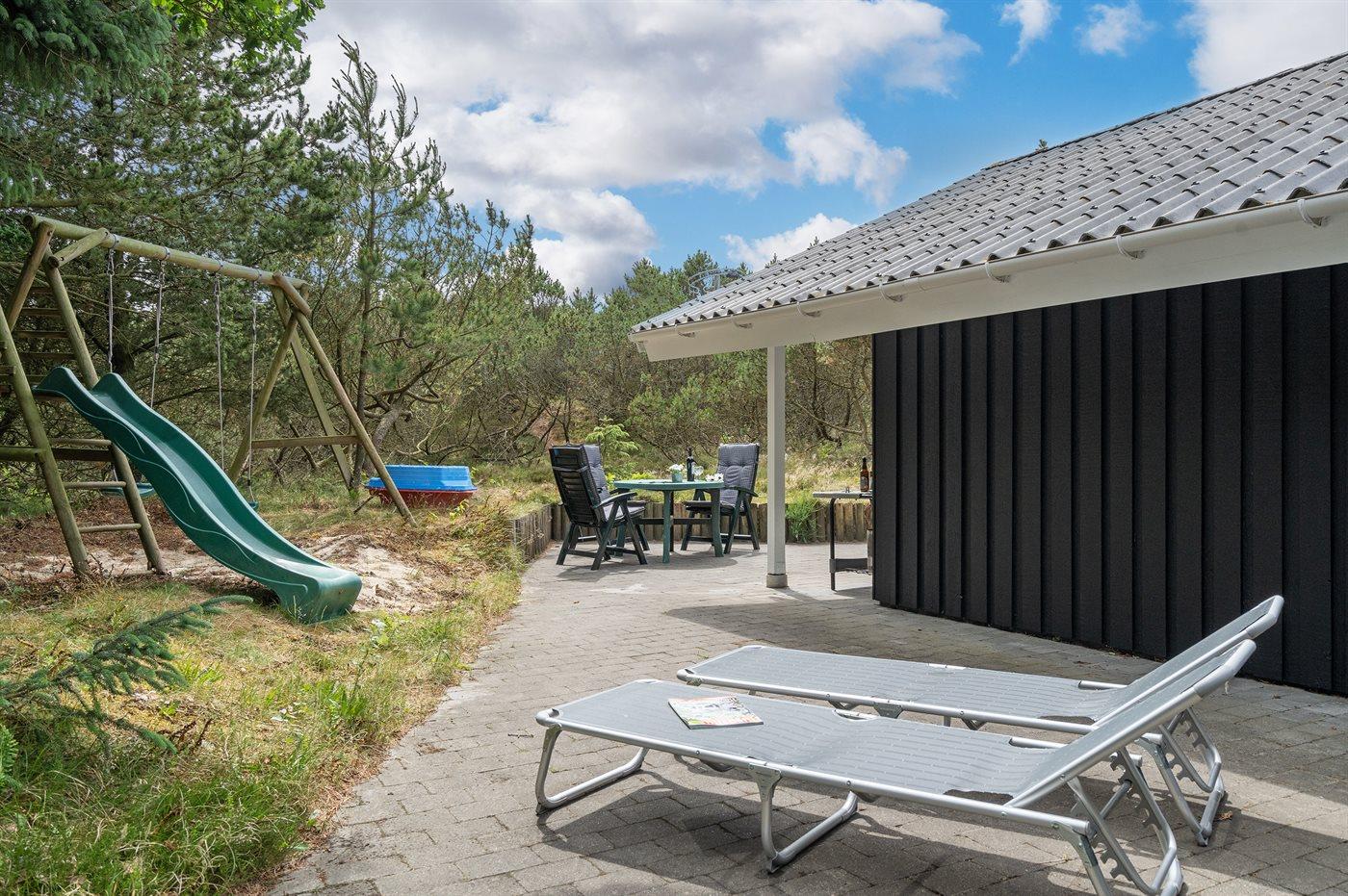 Dette sommerhus i træ ligger på en ugenert naturgrund, som er omkranset af høje grantræer. Huset er bygget i 1982 og renoveret i 2002 med nyt badeværelse med 2-pers. spa, sauna og gulvvarme. Til huset hører overdækket og åben terrasse med havemøbler. Væggene er beklædt med træ. På gulvene er der dels tæpper, dels klinker. Køkkenet, som er kombineret med opholdsstuen, er udstyret med opvaskemaskine, mikrobølgeovn og fryser. I den rummelige og velmøblerede opholdsstue forefindes brændeovn, video, DVD-afspiller, TV med parabol (digital) samt stereoanlæg med CD-afspiller. Gratis ADSL-internetforbindelse (egen computer skal medbringes). De 6 sovepladser fordeler sig på 3 værelser, alle med nye dobbeltsenge (2020). Til huset hører også vaskemaskine, tørretumbler, høj barnestol, carport, sandkasse og gynge. Uanset årstiden vil dette hus være et godt udgangspunkt for et vellykket ferieophold ved Vestkysten.