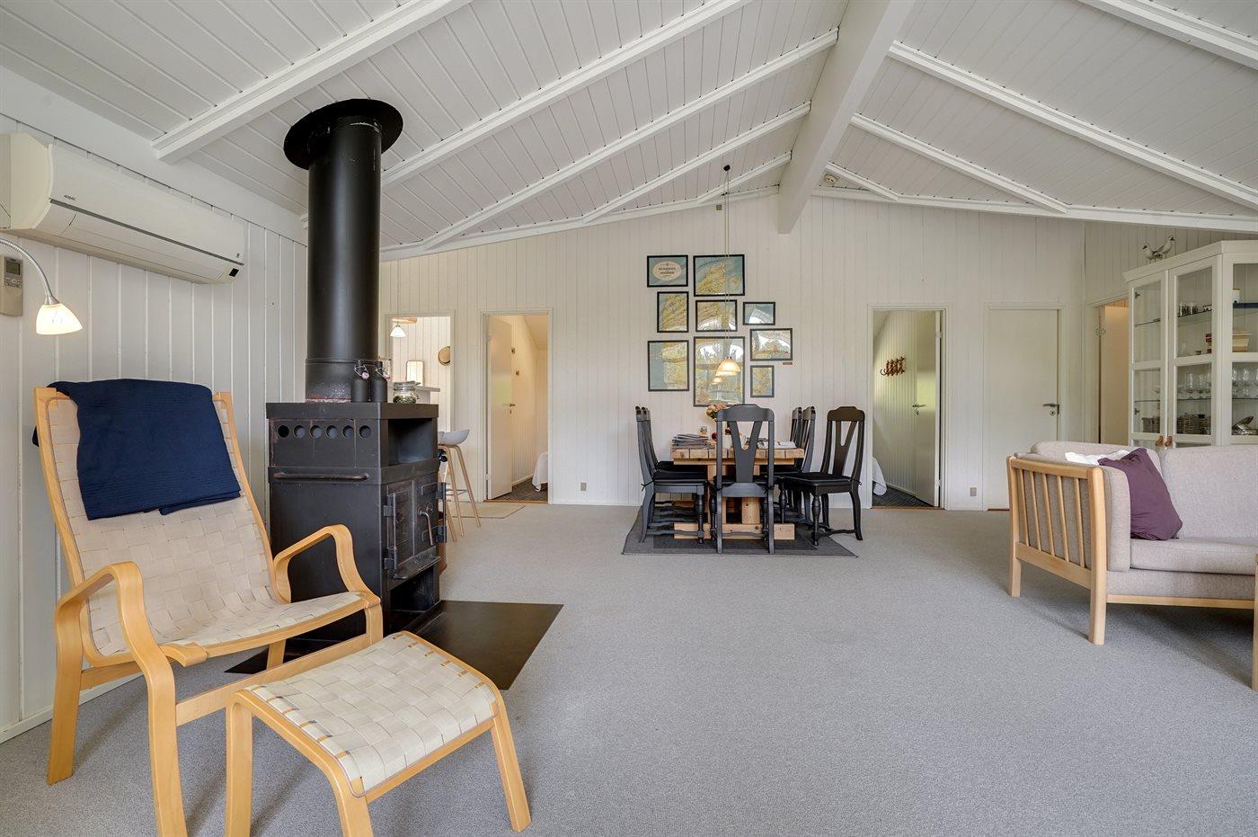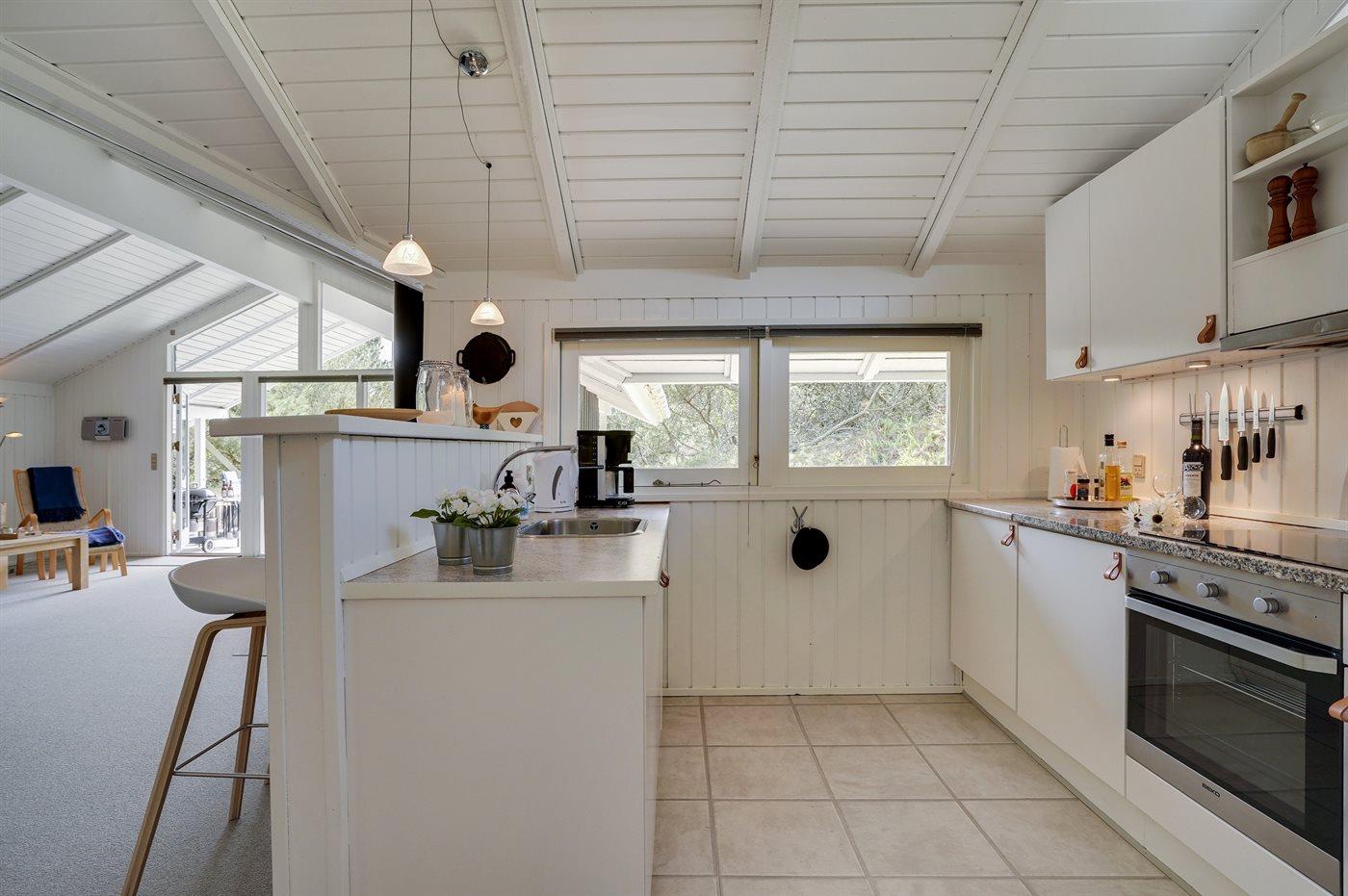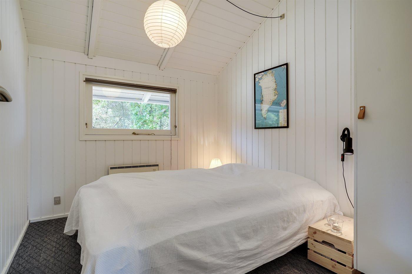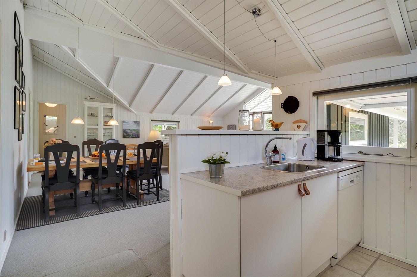 Dette sommerhus i træ ligger på en ugenert naturgrund, som er omkranset af høje grantræer. Huset er bygget i 1982 og renoveret i 2002 med nyt badeværelse med 2-pers. spa, sauna og gulvvarme. Til huset hører overdækket og åben terrasse med havemøbler. Væggene er beklædt med træ. På gulvene er der dels tæpper, dels klinker. Køkkenet, som er kombineret med opholdsstuen, er udstyret med opvaskemaskine, mikrobølgeovn og fryser. I den rummelige og velmøblerede opholdsstue forefindes brændeovn, video, DVD-afspiller, TV med parabol (digital) samt stereoanlæg med CD-afspiller. Gratis ADSL-internetforbindelse (egen computer skal medbringes). De 6 sovepladser fordeler sig på 3 værelser, alle med nye dobbeltsenge (2020). Til huset hører også vaskemaskine, tørretumbler, høj barnestol, carport, sandkasse og gynge. Uanset årstiden vil dette hus være et godt udgangspunkt for et vellykket ferieophold ved Vestkysten.