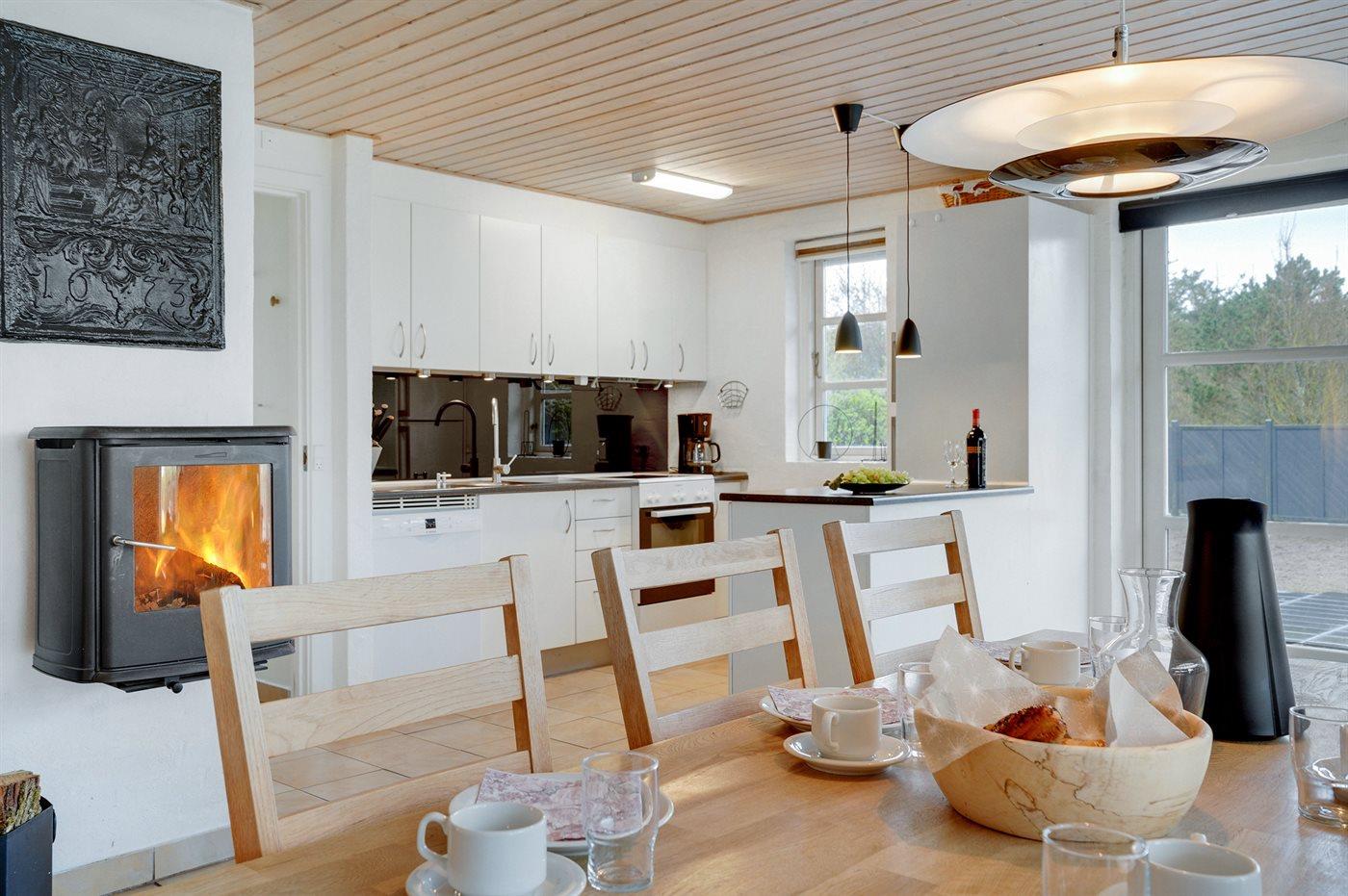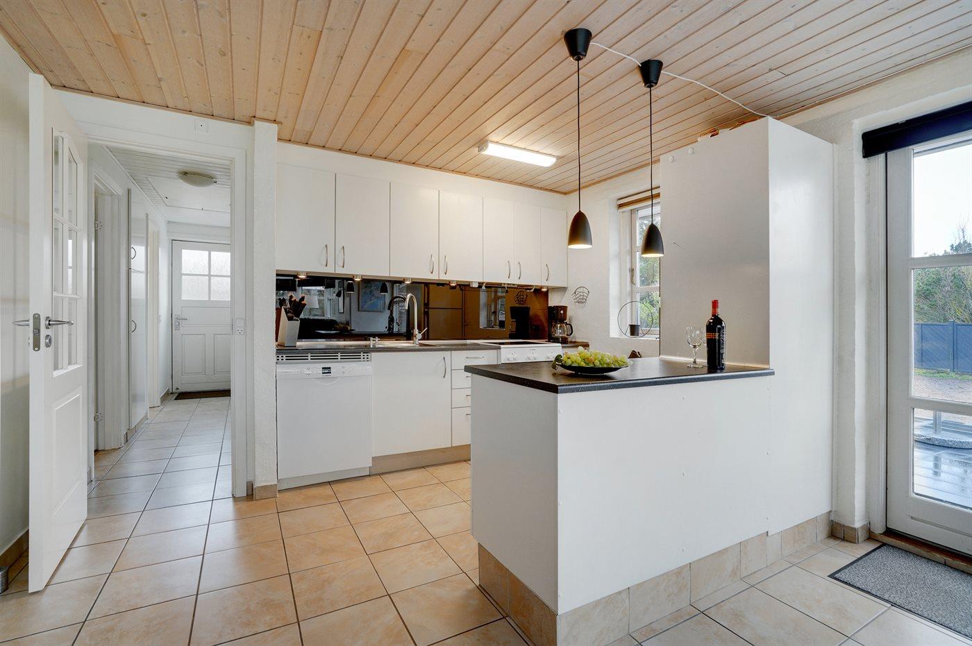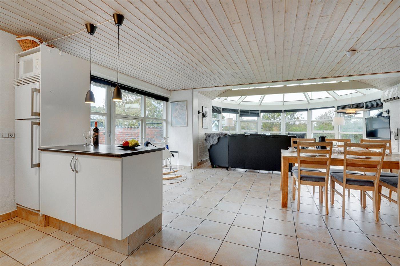 Køkkenet er udstyret med 1 køleskab. Der er 4 elkogeplader, bageovn, mikrobølgeovn samt opvaskemaskine.